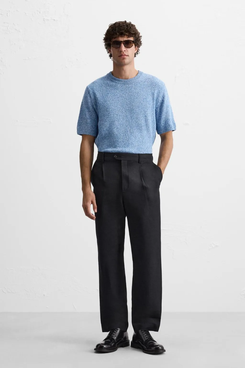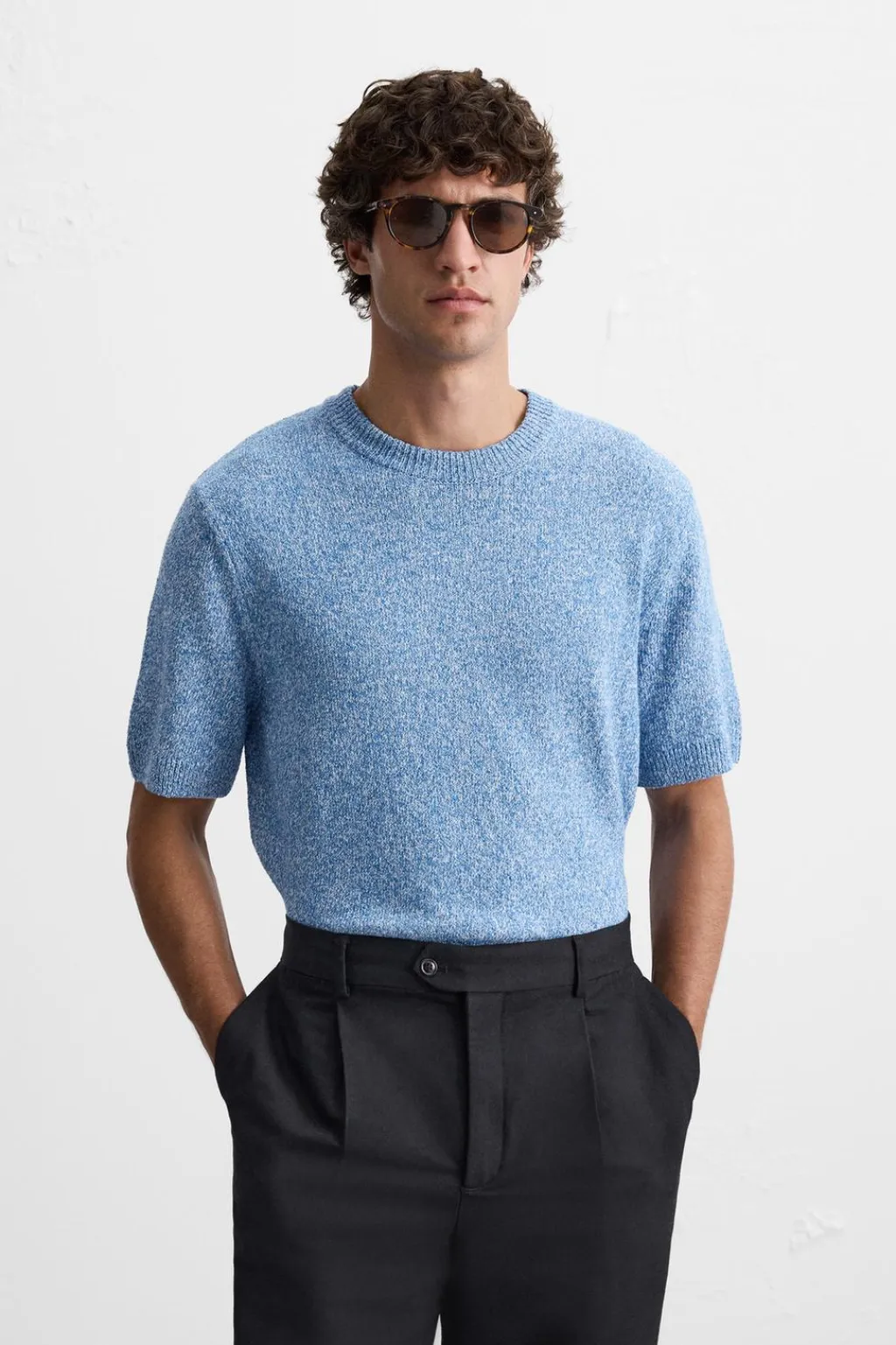 Camiseta de punto tejida en hilatura con mezcla de algodón. Cuello redondo y manga corta. Acabados en rib.