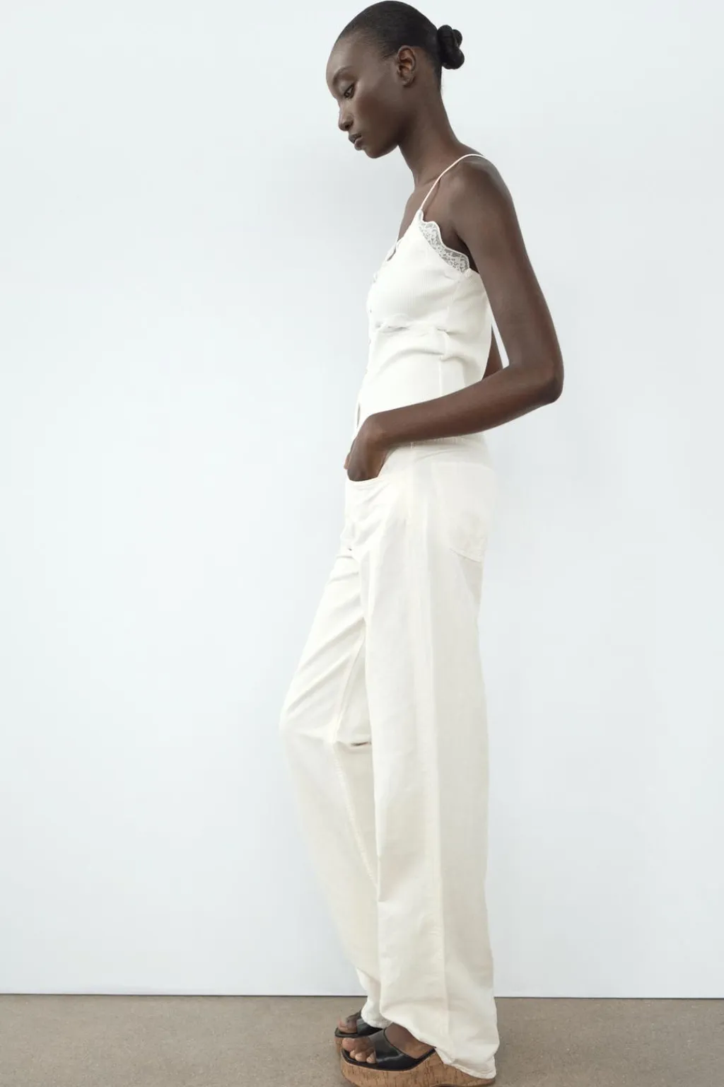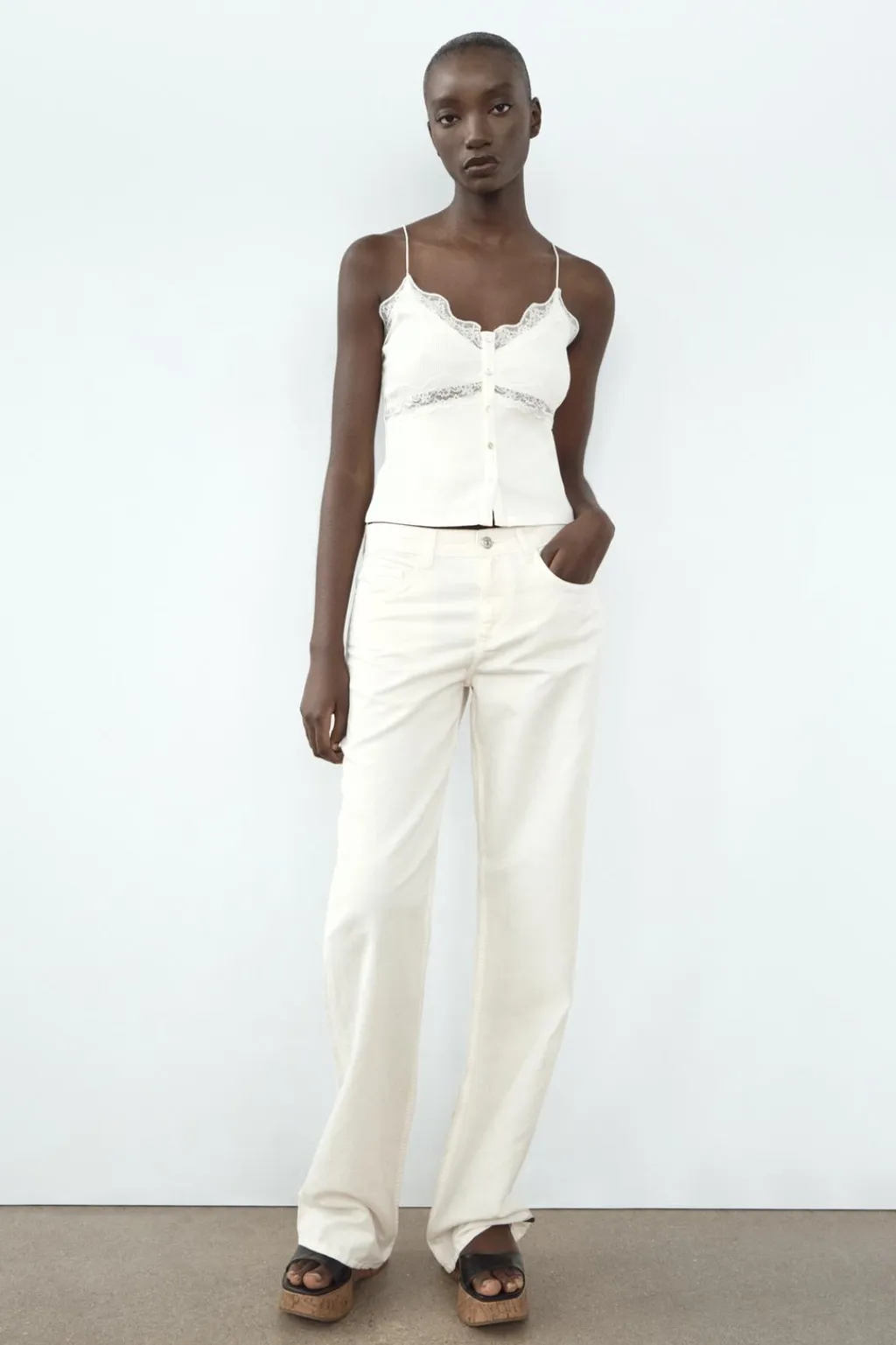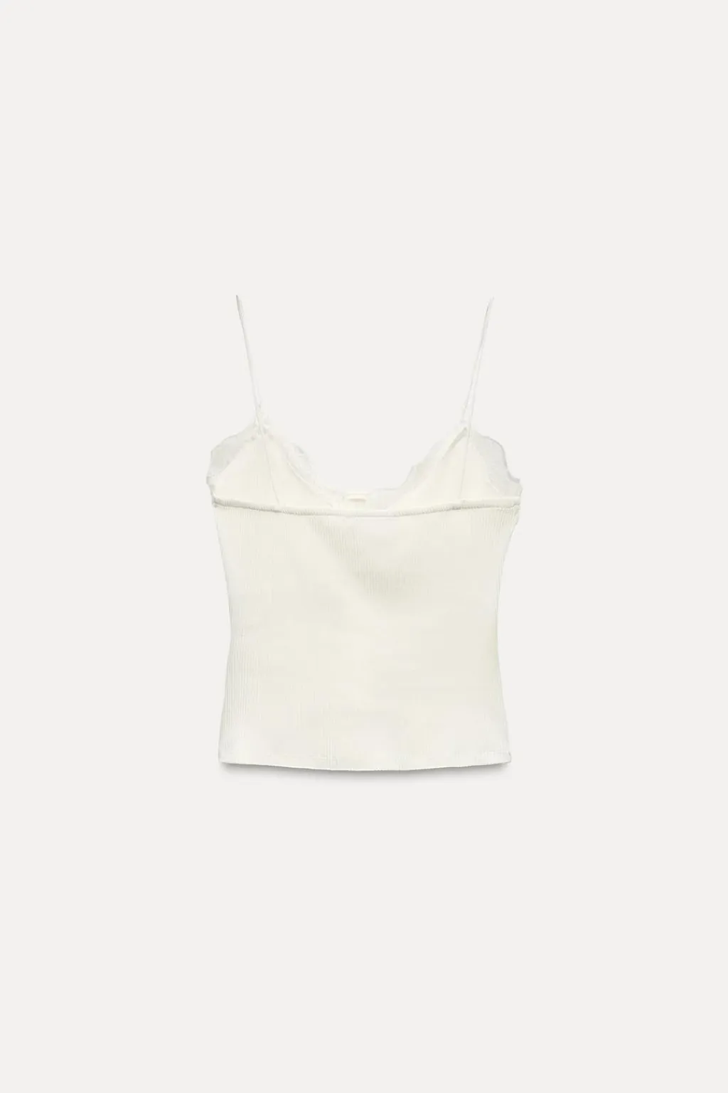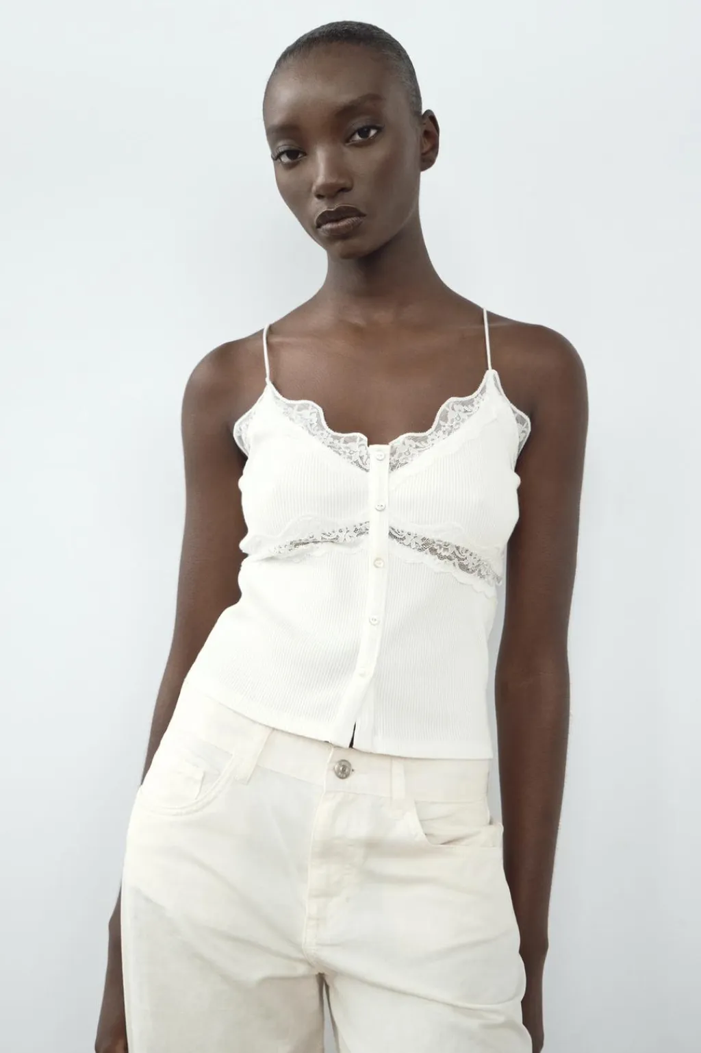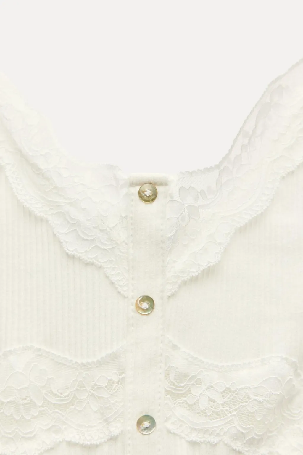 Camiseta de escote pico y tirantes finos. Detalle de encaje combinado a tono y botones en delantero.