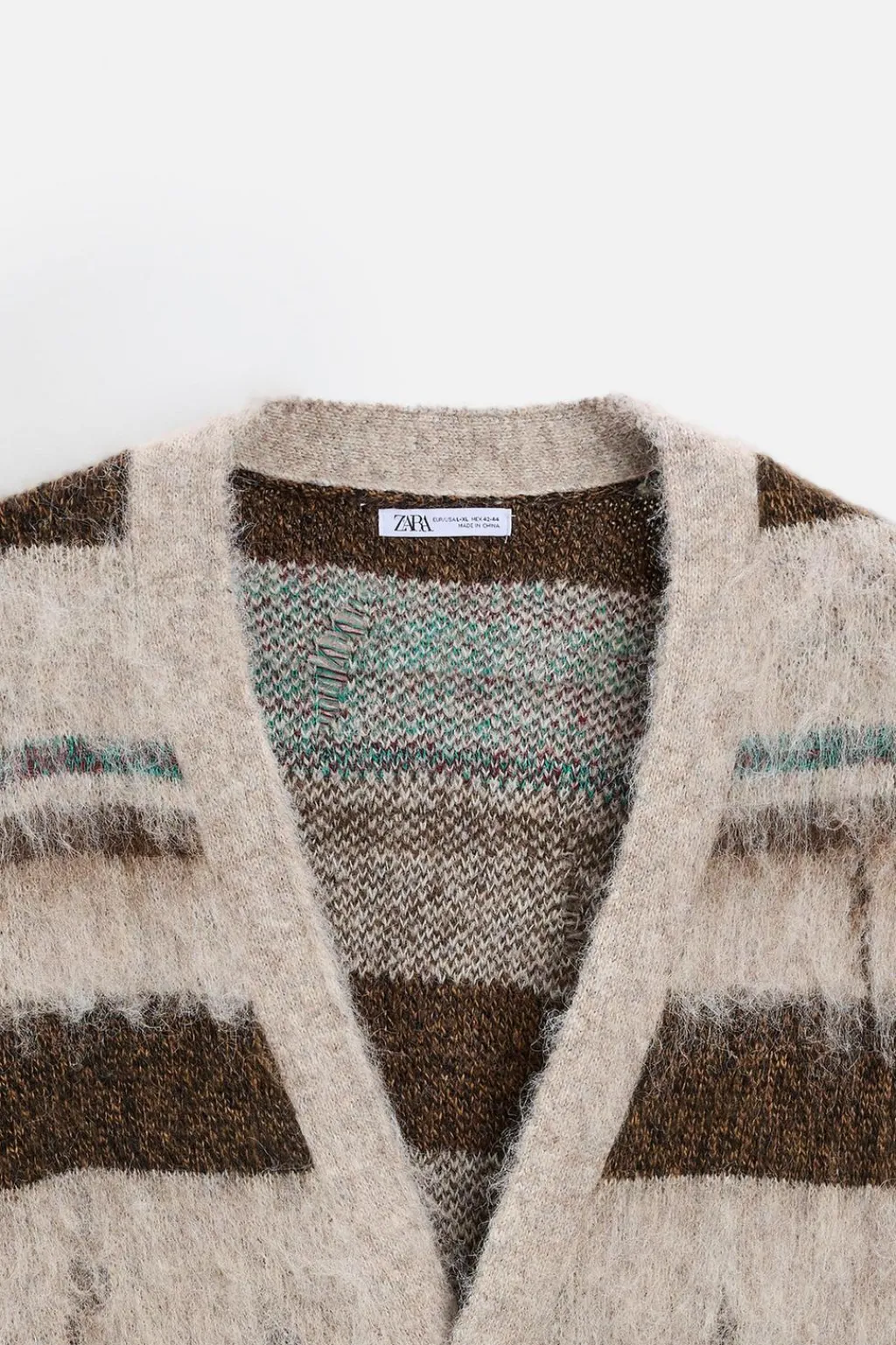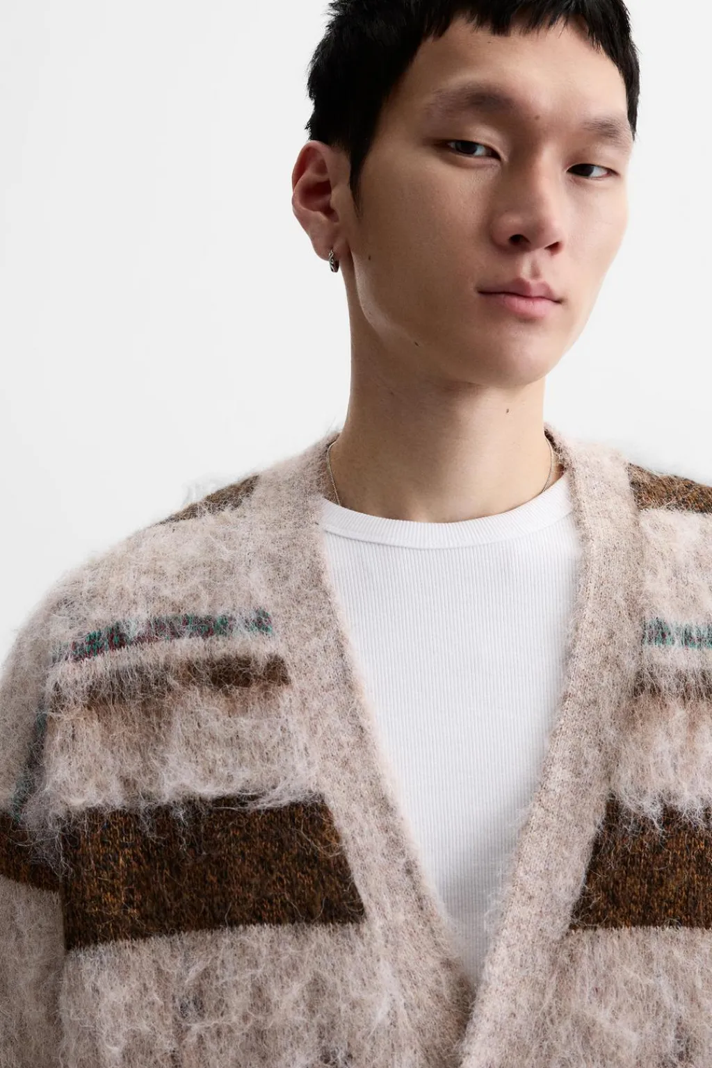 Cárdigan relaxed fti tejido en hilatura con textura. Cuello pico y manga larga. Efecto rotos en toda la prenda. Acabados en rib. Cierre frontal de botonadura.