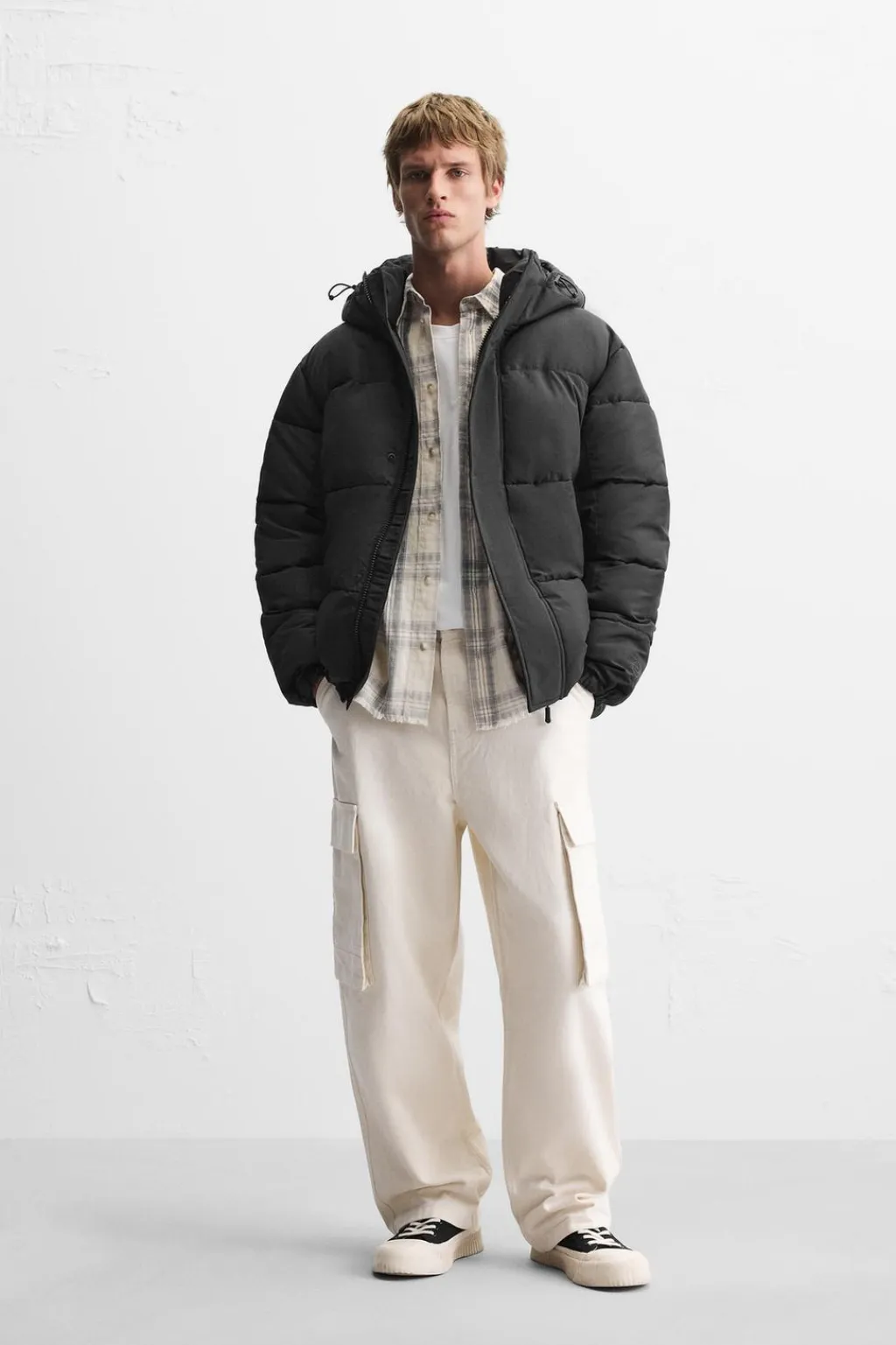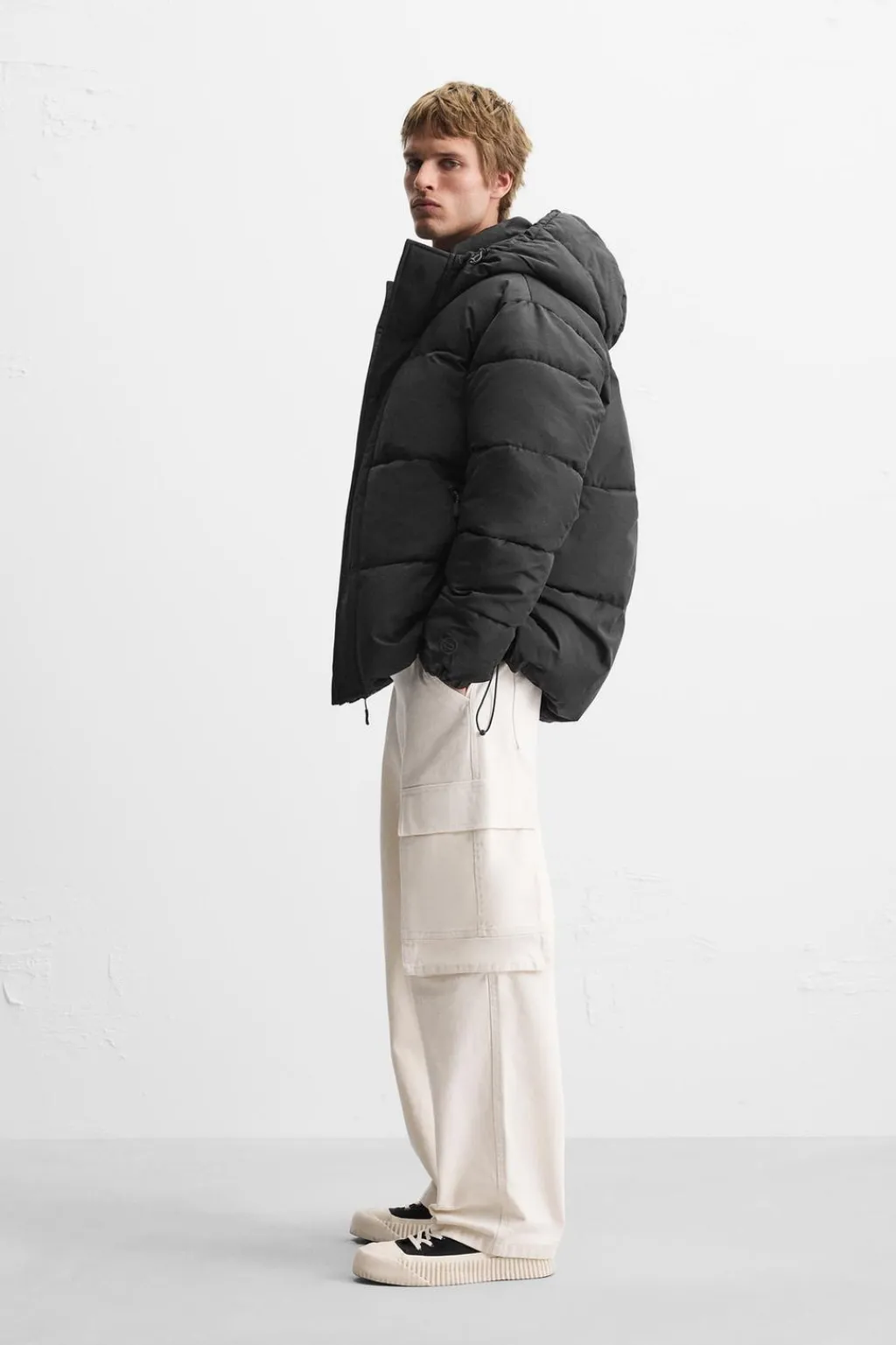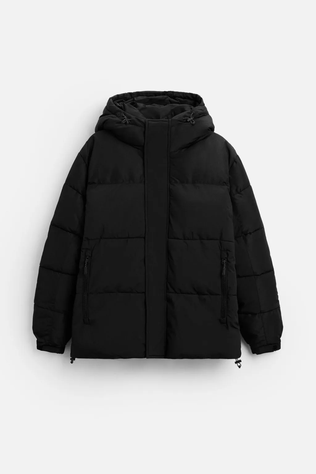 Cazadora relaxed fit confeccionada en tejido técnico con estructura ripstop, resistente a desgarros. Cuello con capucha ajustable y manga larga. Bolsillos de vivo en cadera y detalle de bolsillo interior. Bajo ajustable con elásticos en laterales. Cierre frontal de cremallera oculta por solapa con botones a presión.