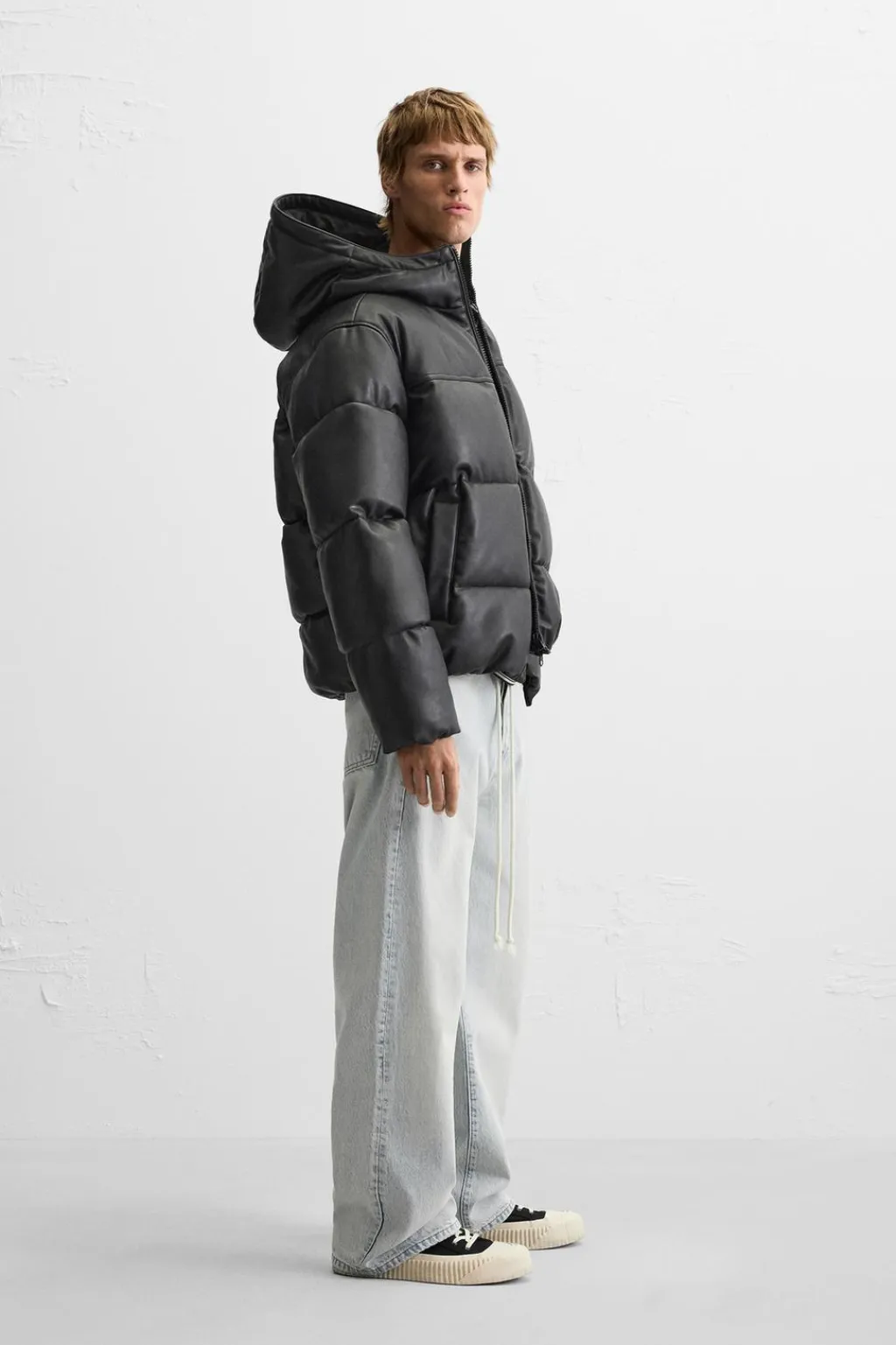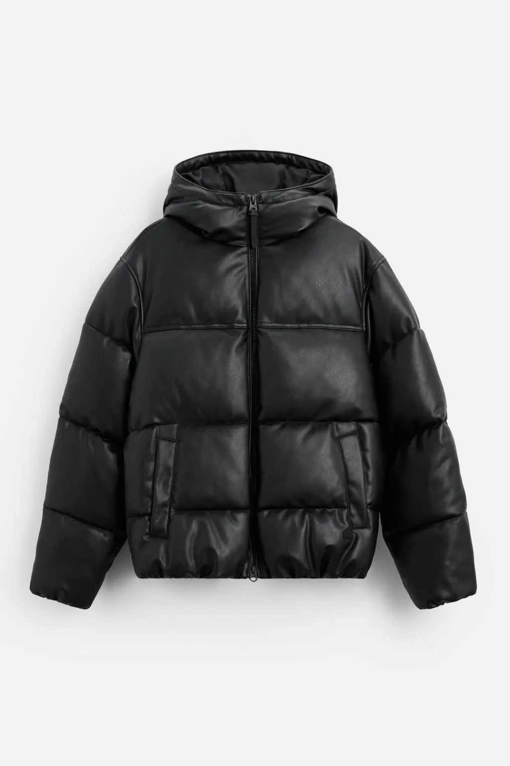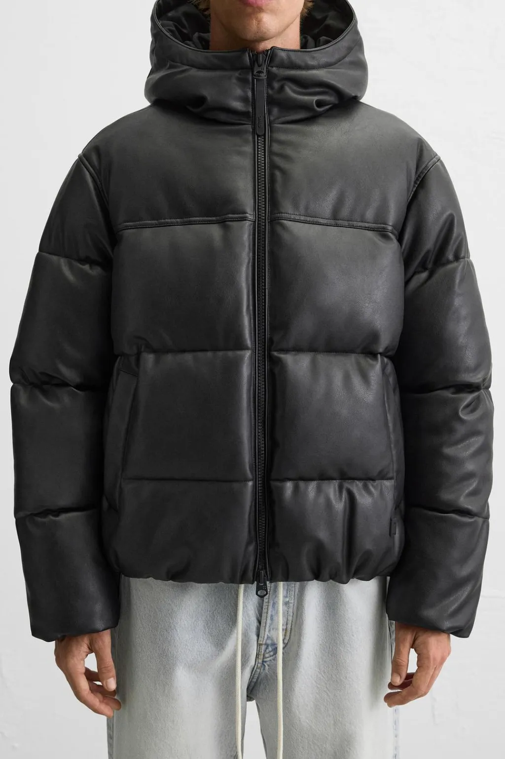 Cazadora acolchada confeccionada en tejido efecto piel. Cuello subido con capucha y manga larga. Bolsillos de vivo en cadera y detalle de bolsillo interior. Acabados con elástico. Cierre frontal con cremallera.