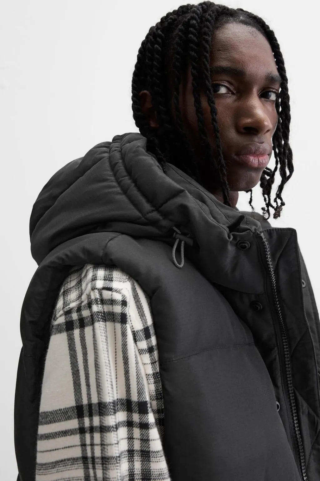 Chaleco acolchado confeccionado en tejido técnico. Cuello subido con capucha ajustable y manga sisa. Bolsillos de vivo en cadera y detalle de bolsillo interior. Bajo con elástico. Cierre frontal con cremallera oculta por solapa con botones a presión.