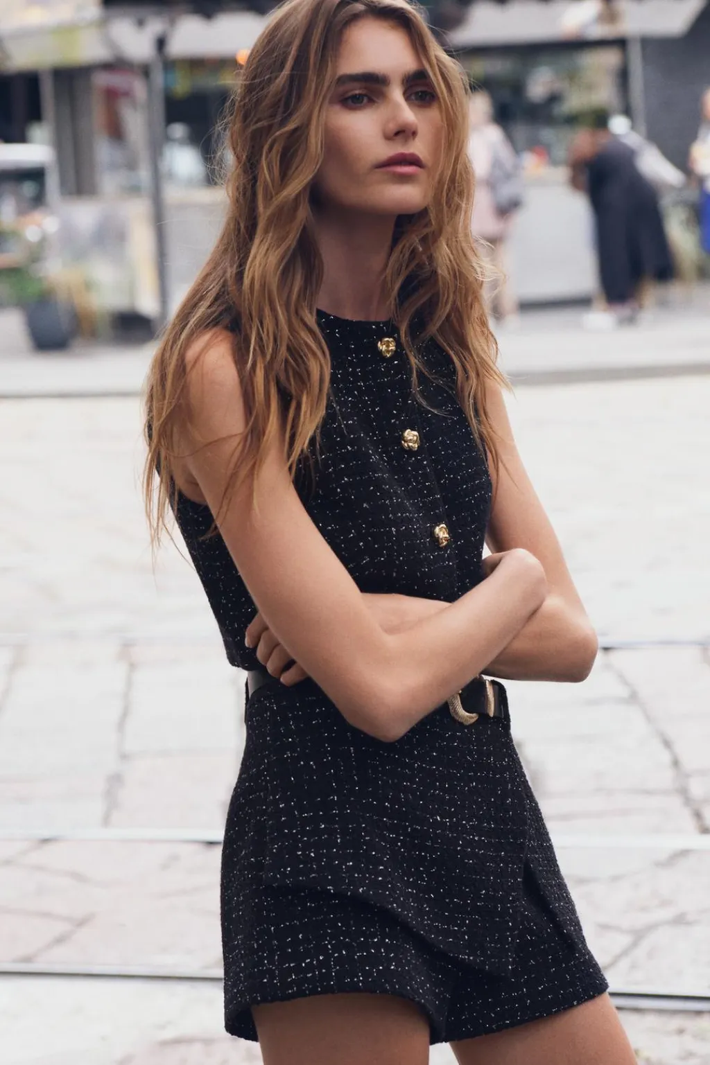 Chaleco de cuello redondo y manga sisa. Detalle de tejido con hilo metalizado. Cierre frontal con botones dorados con relieve.