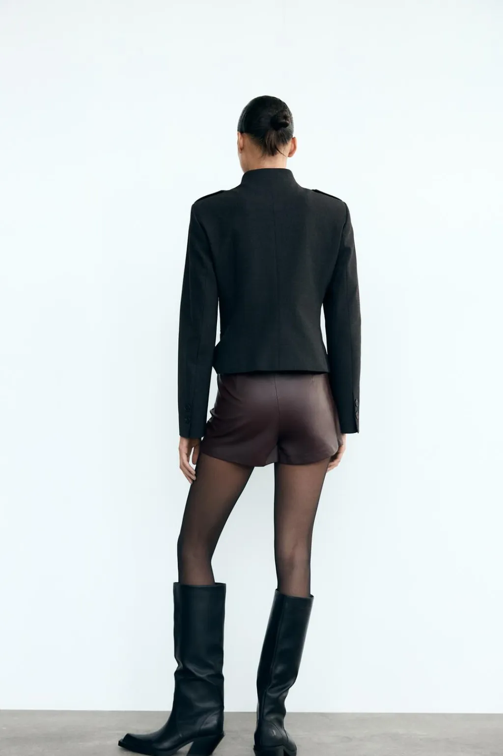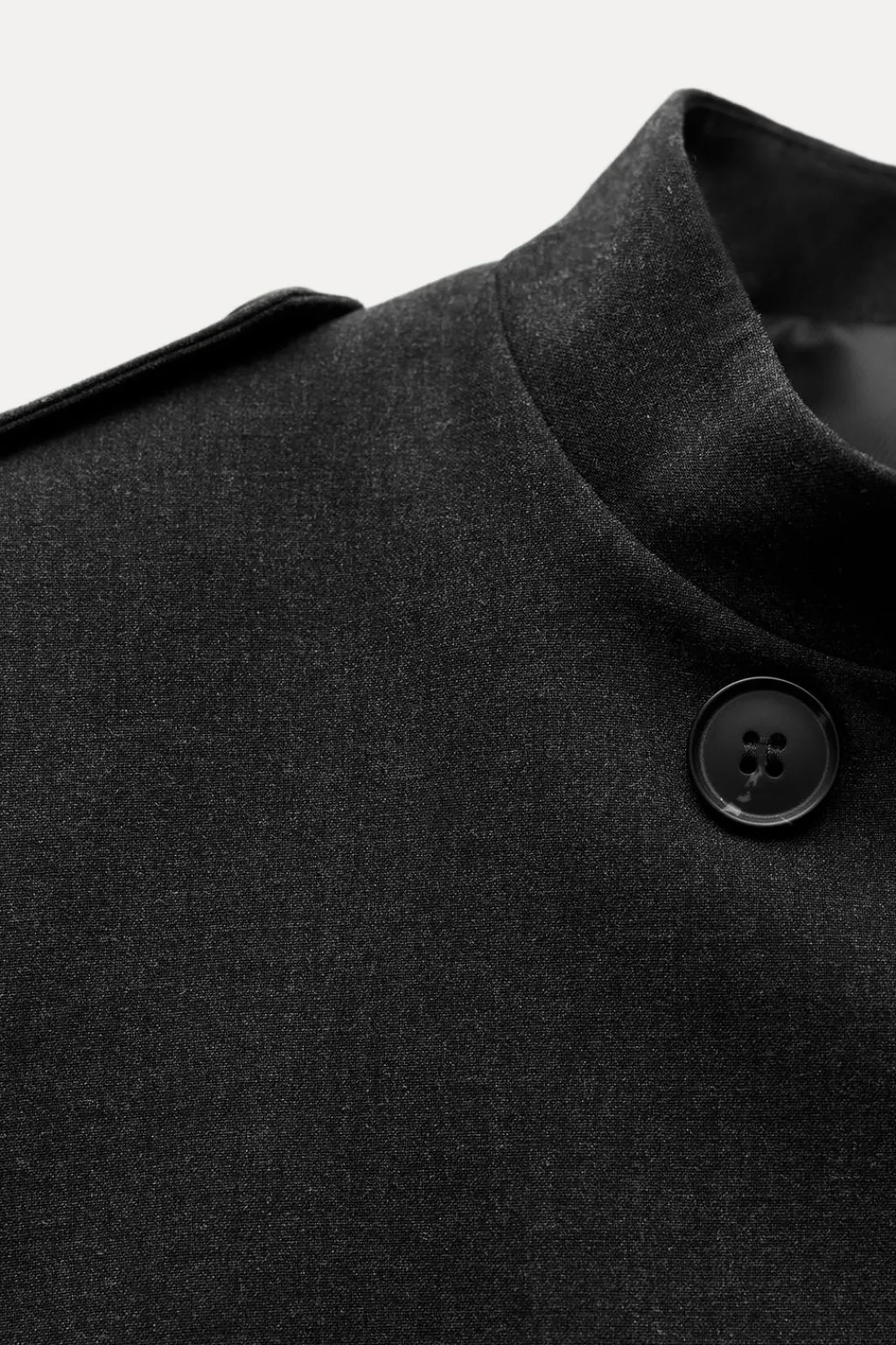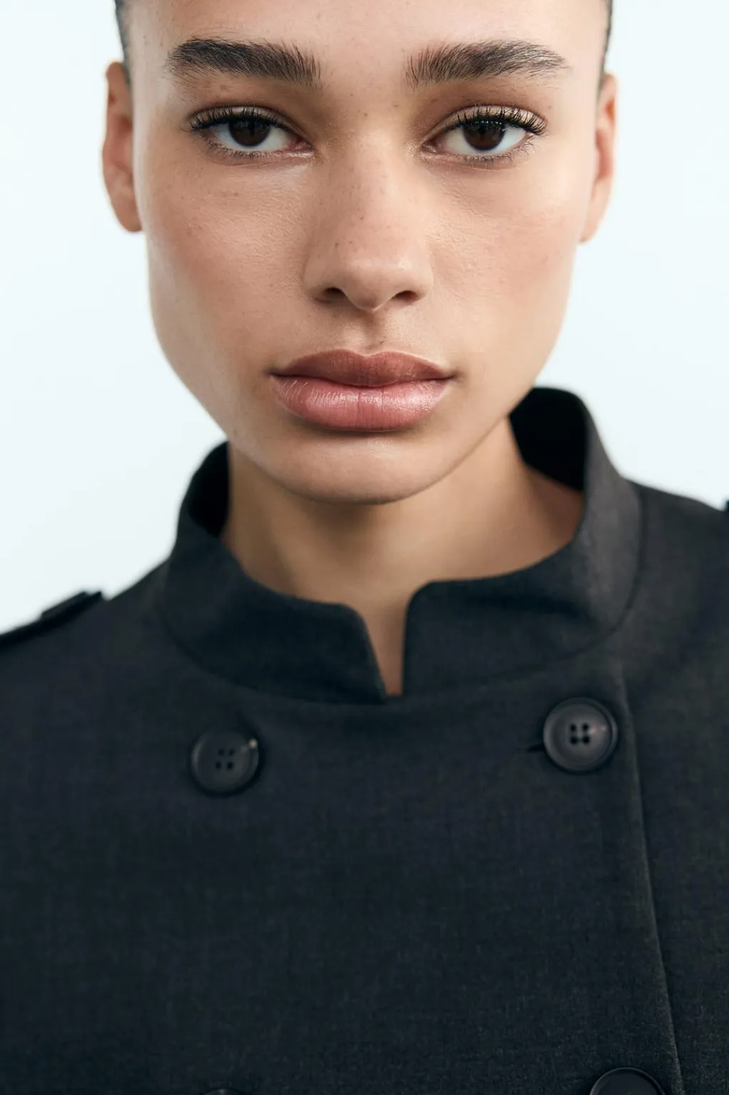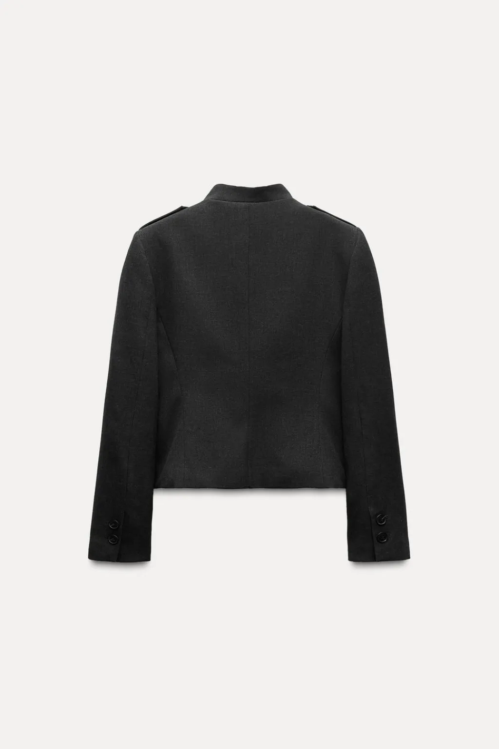 Chaqueta entallada de cuello subido. Manga larga con hombreras y trabillas. Bolsillos de vivo en delantero. Forro interior. Cierre frontal con botones.