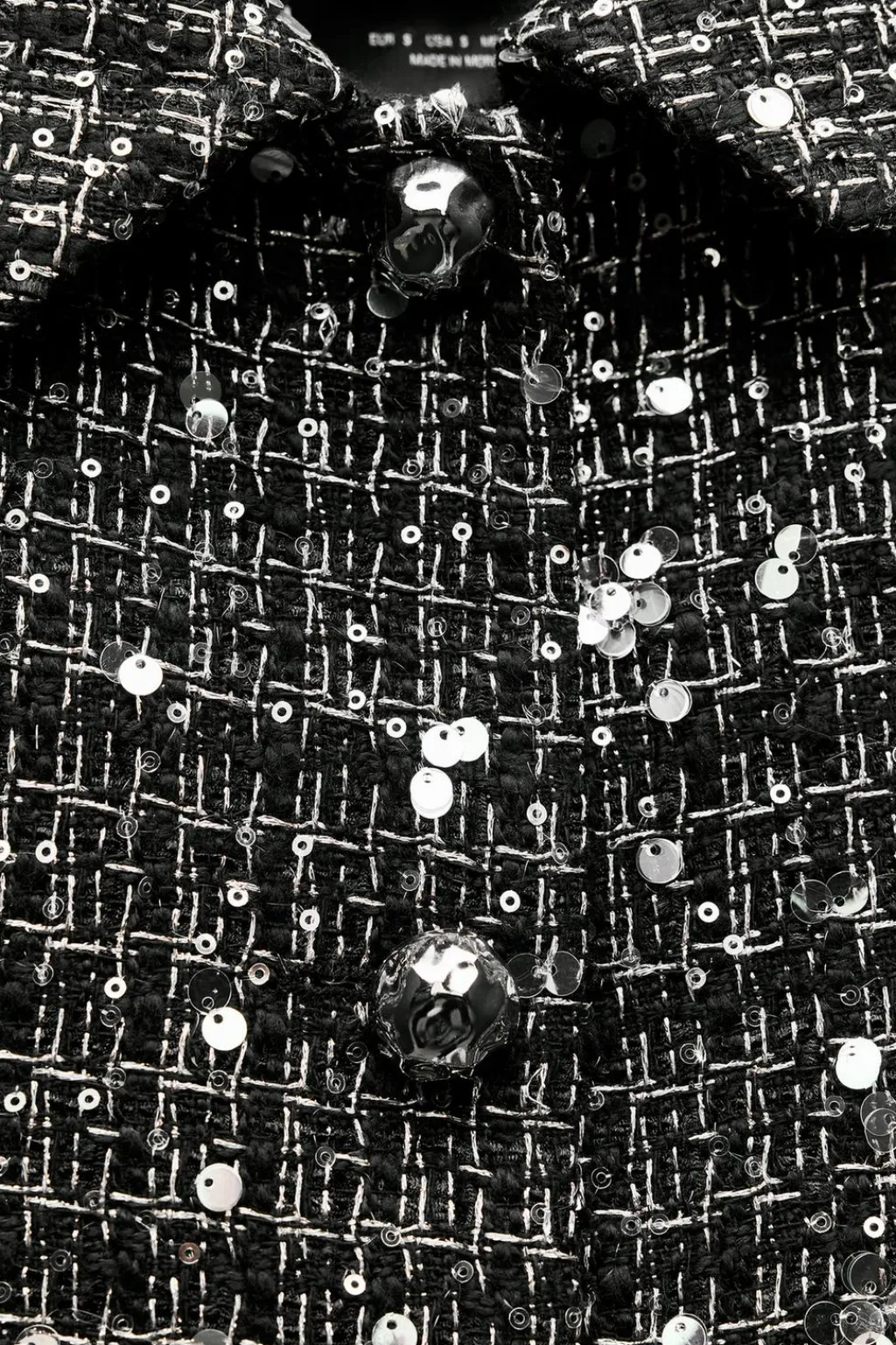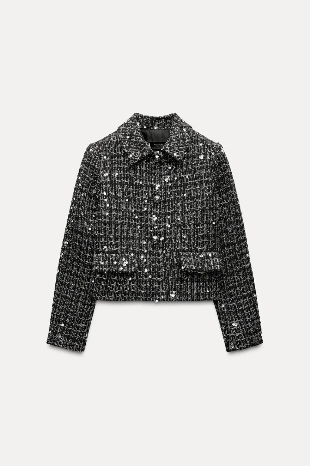 Chaqueta de cuello solapa y manga larga con hombreras. Detalle de aplicación de lentejuelas. Bolsillos delanteros con solapa. Cierre frontal con botones metálicos.