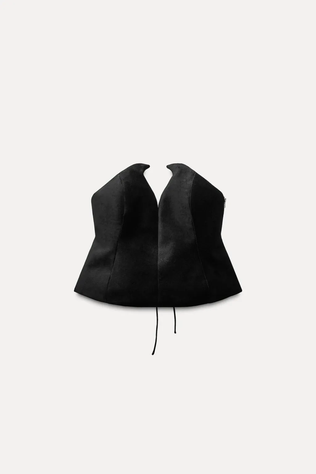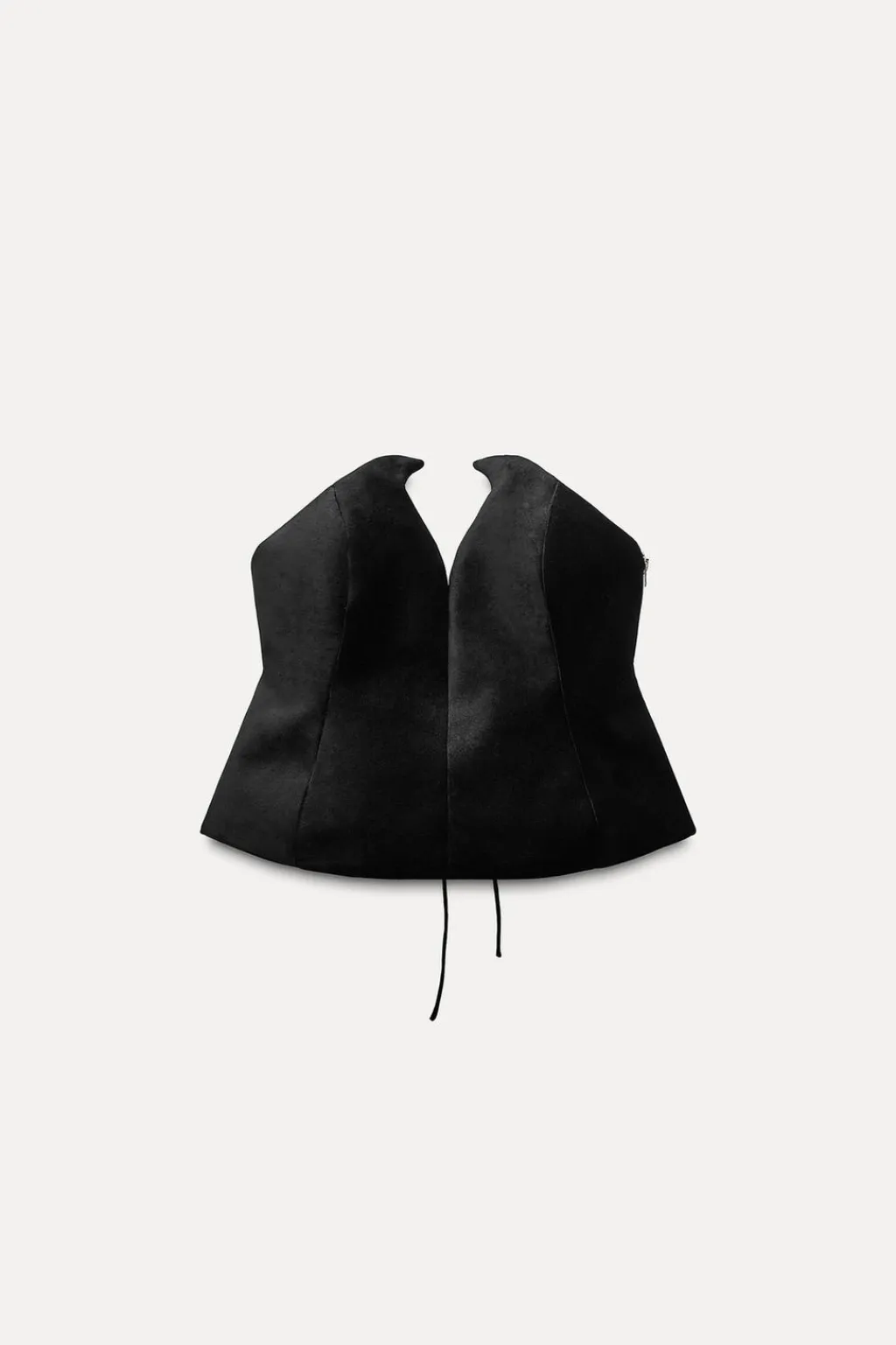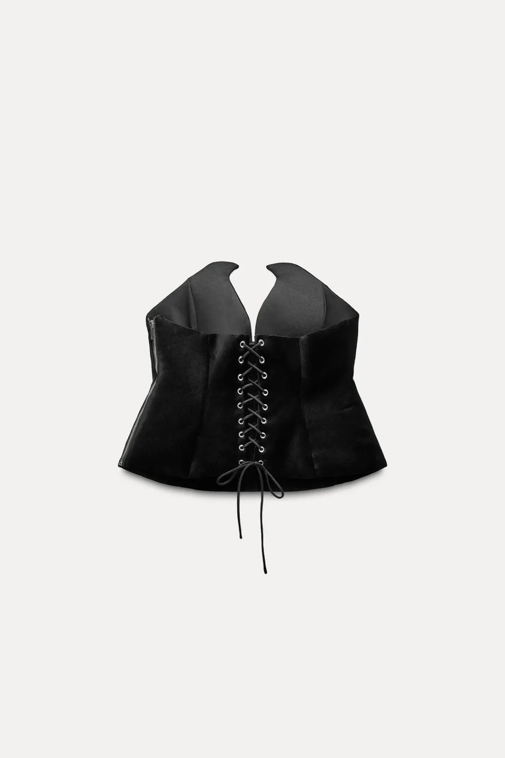 Corsé realizado en tejido de terciopelo. Palabra de honor y hombros descubiertos. Bajo asimétrico redondeado. Cierre en espalda ajustable con lazadas y lateral con cremallera metálica.