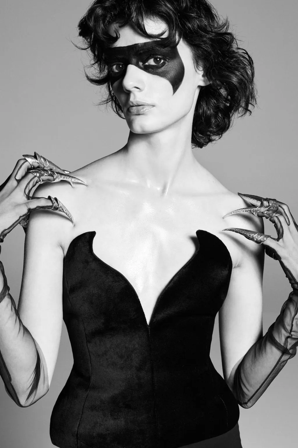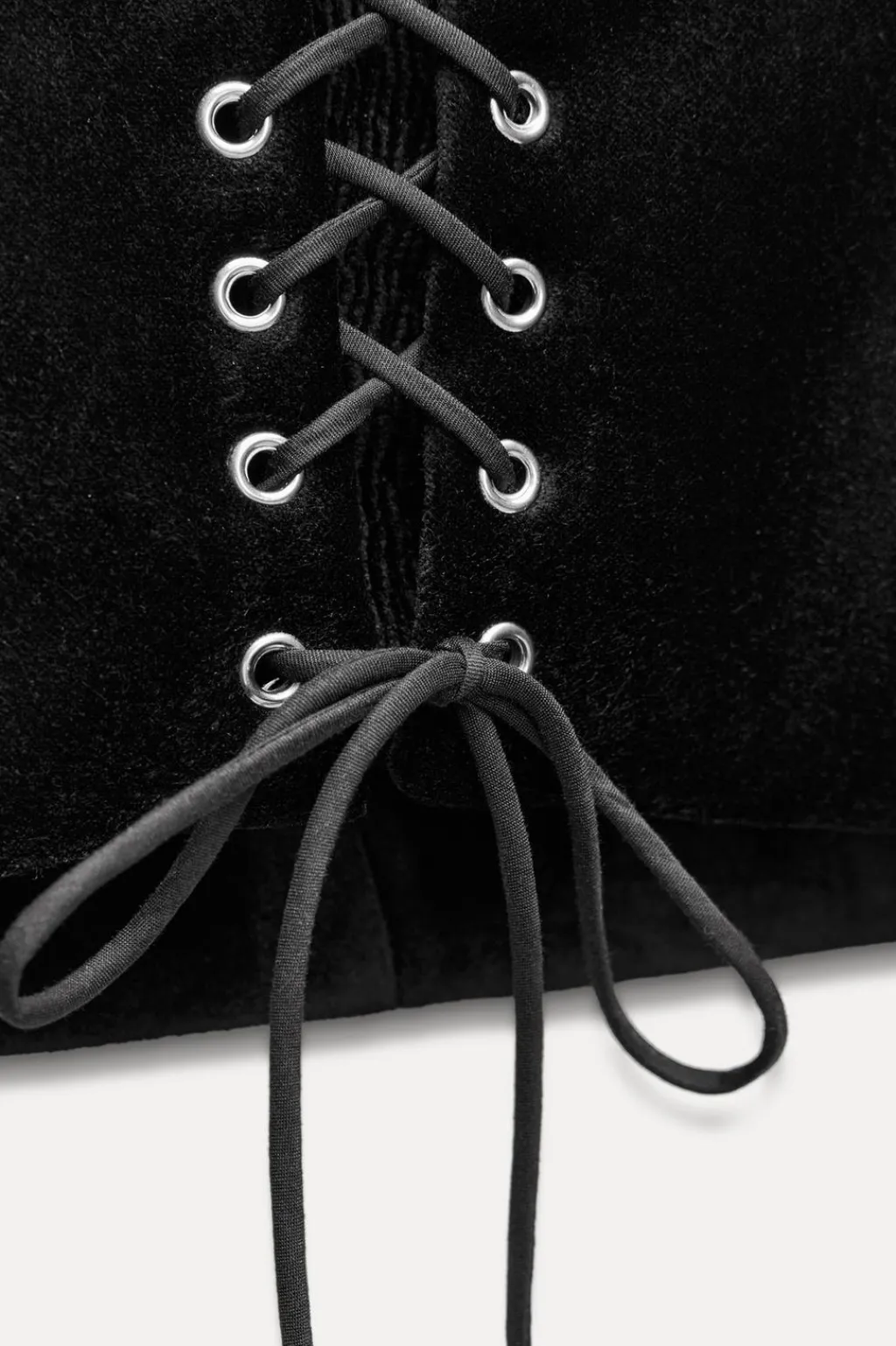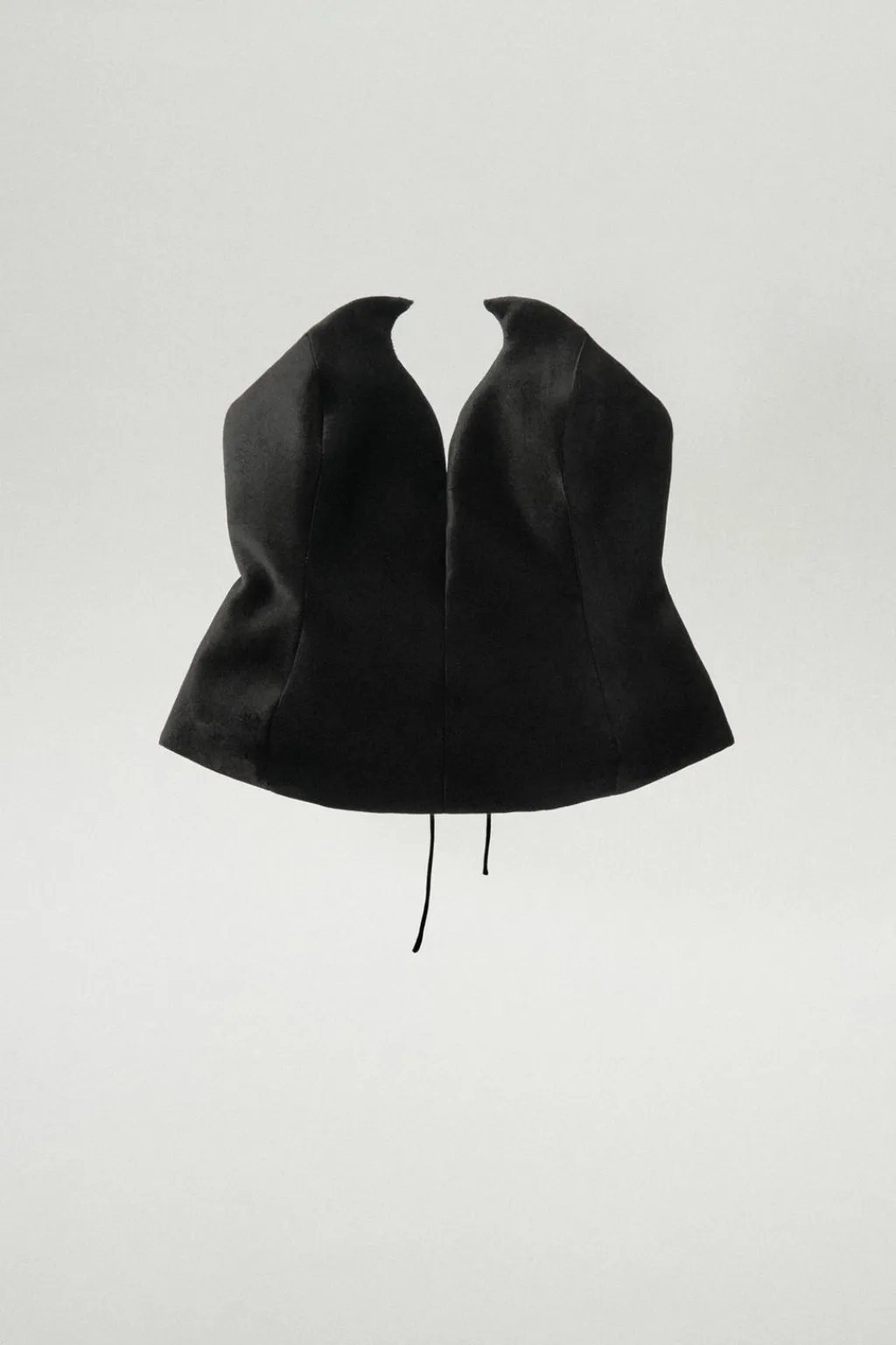 Corsé realizado en tejido de terciopelo. Palabra de honor y hombros descubiertos. Bajo asimétrico redondeado. Cierre en espalda ajustable con lazadas y lateral con cremallera metálica.