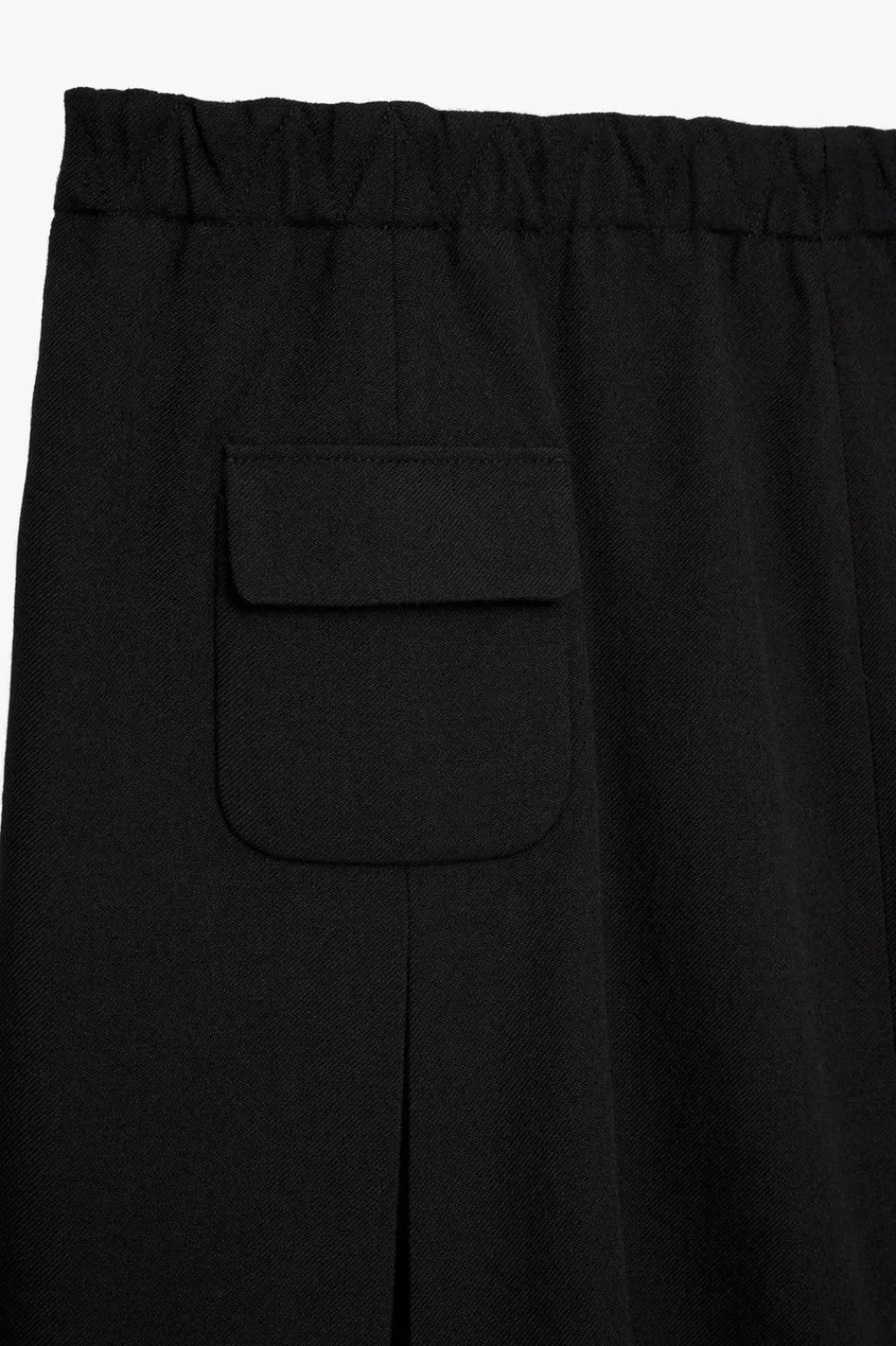 Falda corta confeccionada en hilatura de lana 100%. Tiro medio y cintura elástica. Bolsillo de plastrón con solapa en delantero y espalda. Bajo acabado en abertura frontal.
