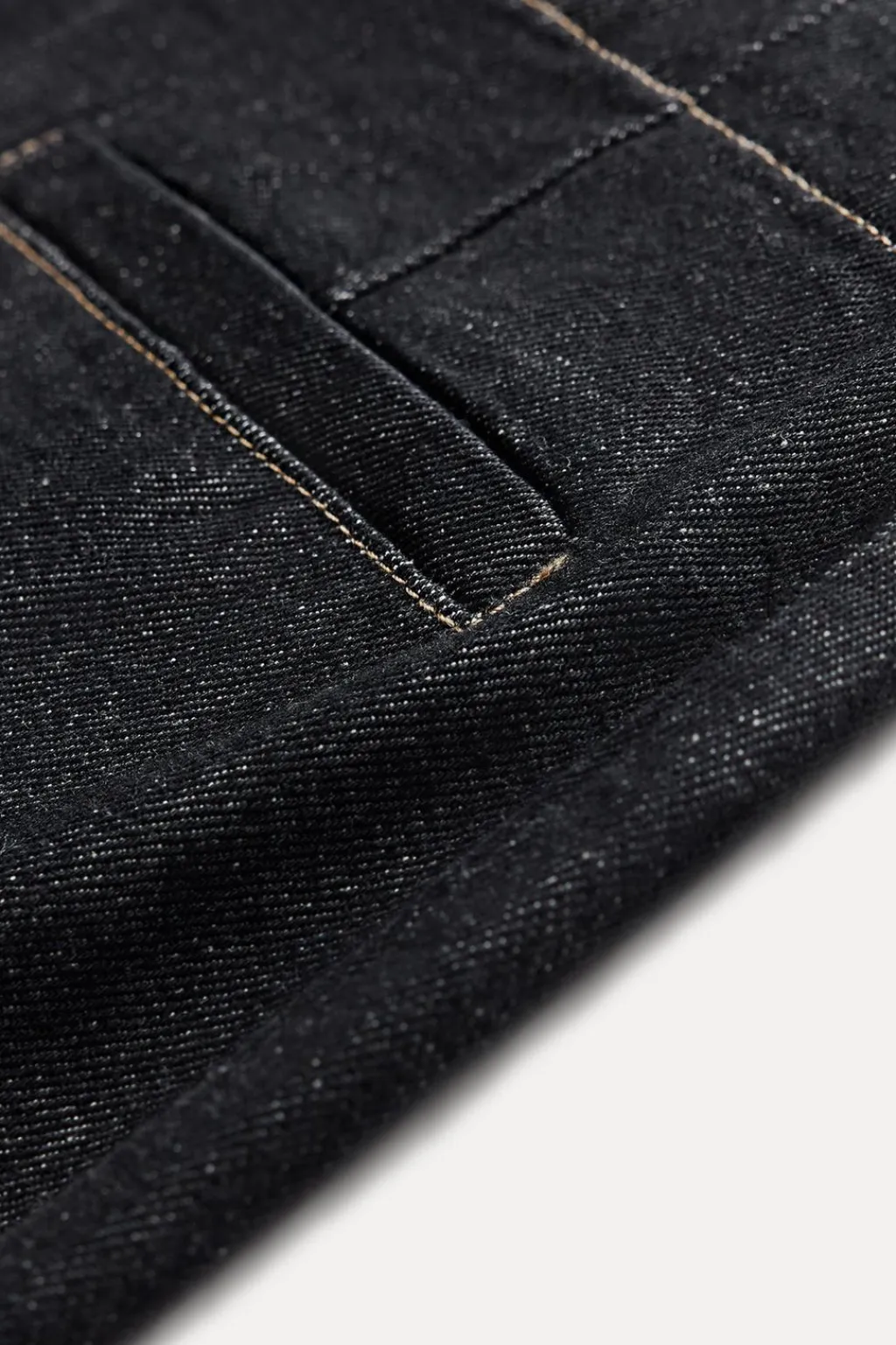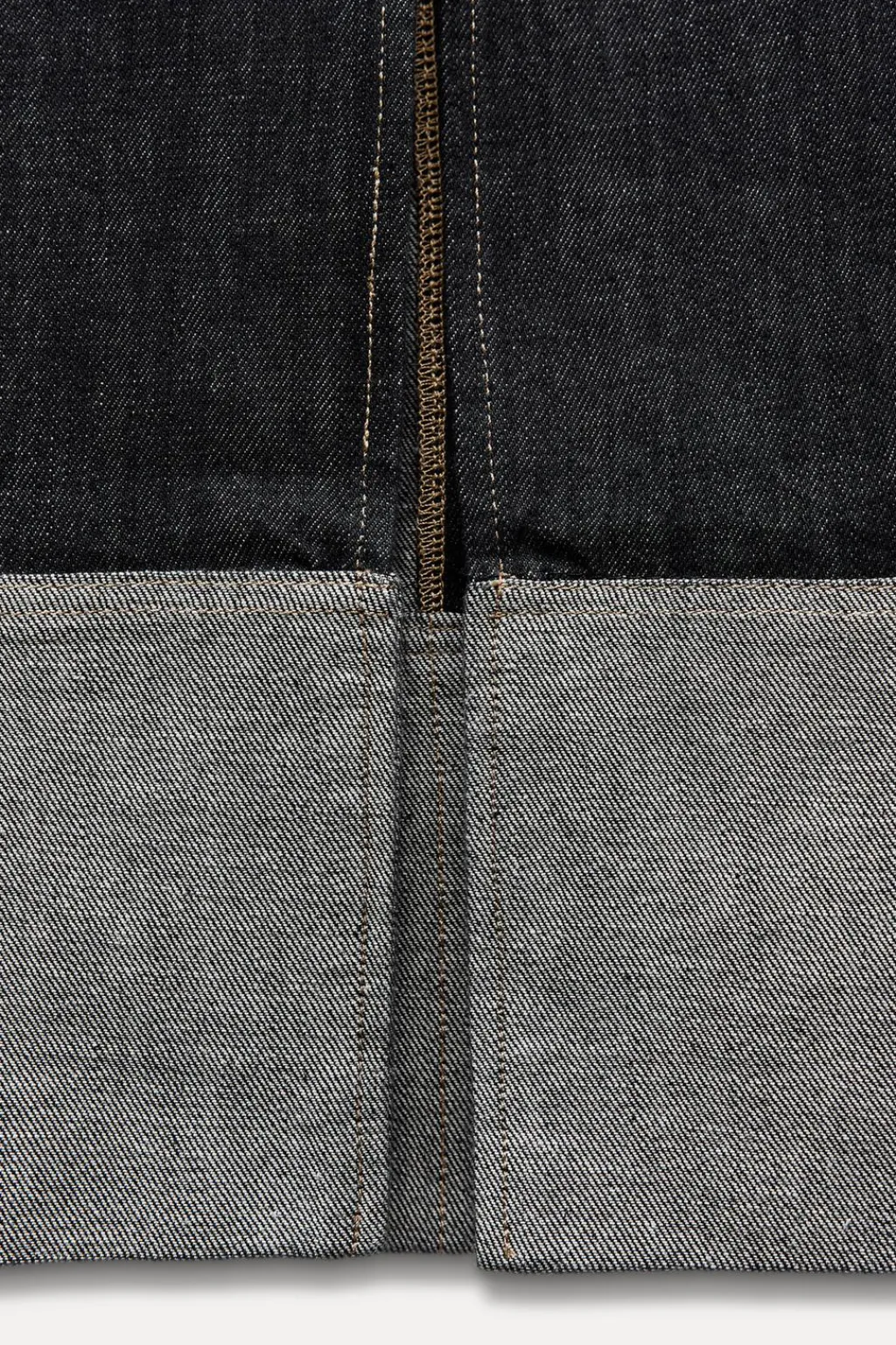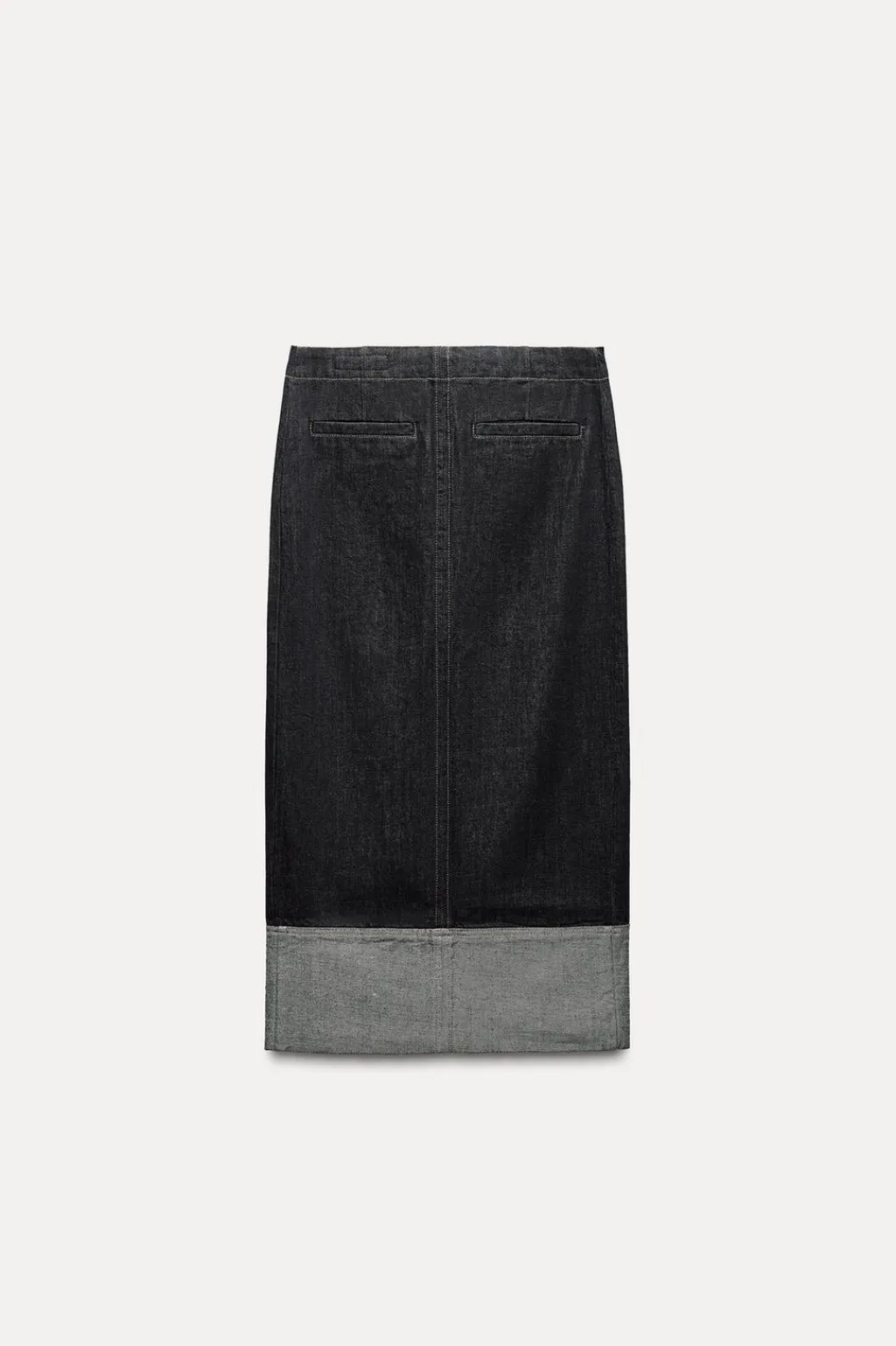 Falda denim de tiro alto. Bolsillos de vivo en delantero. Bajo acabado en vuelta con abertura en espalda. Cierre con cremallera metálica.