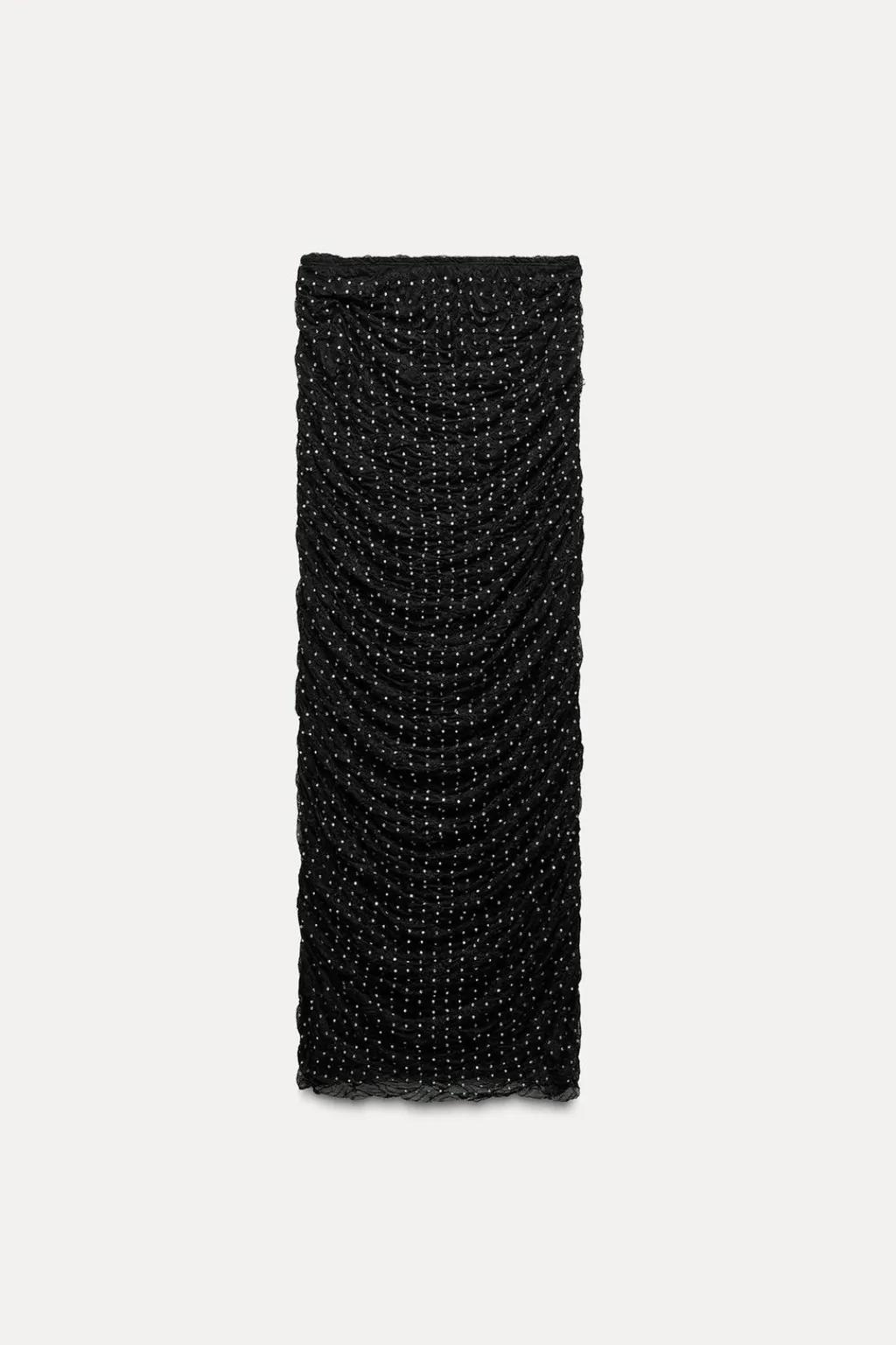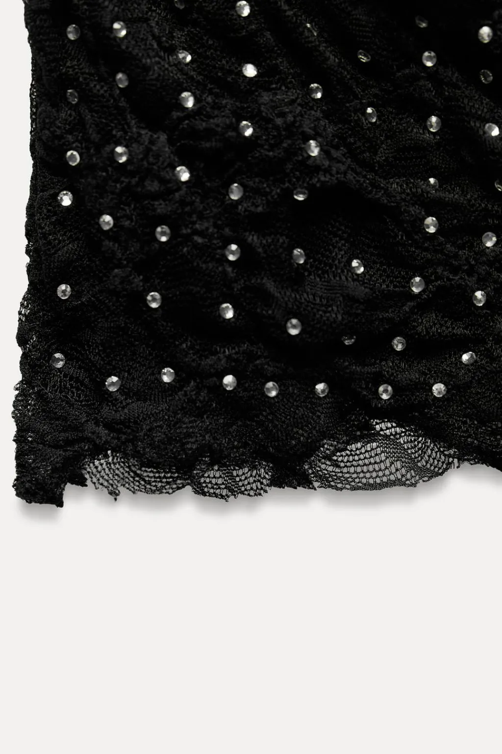Falda midi confeccionada en encaje de tiro alto con cintura elástica. Detalle de frunces laterales y aplicación joyas.