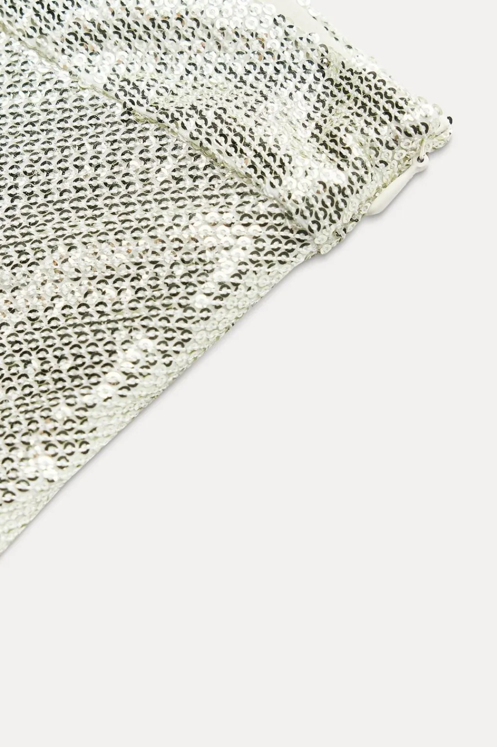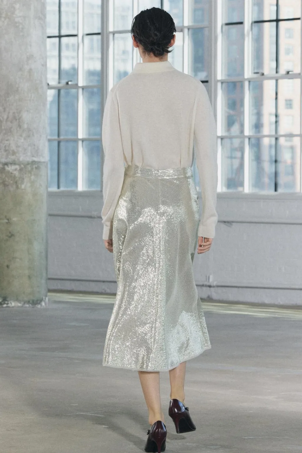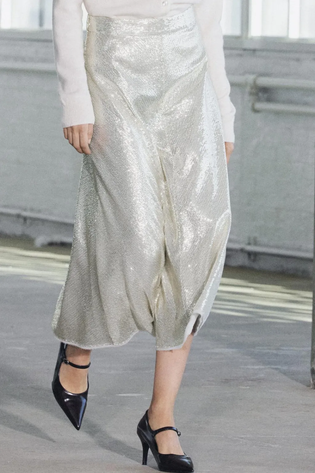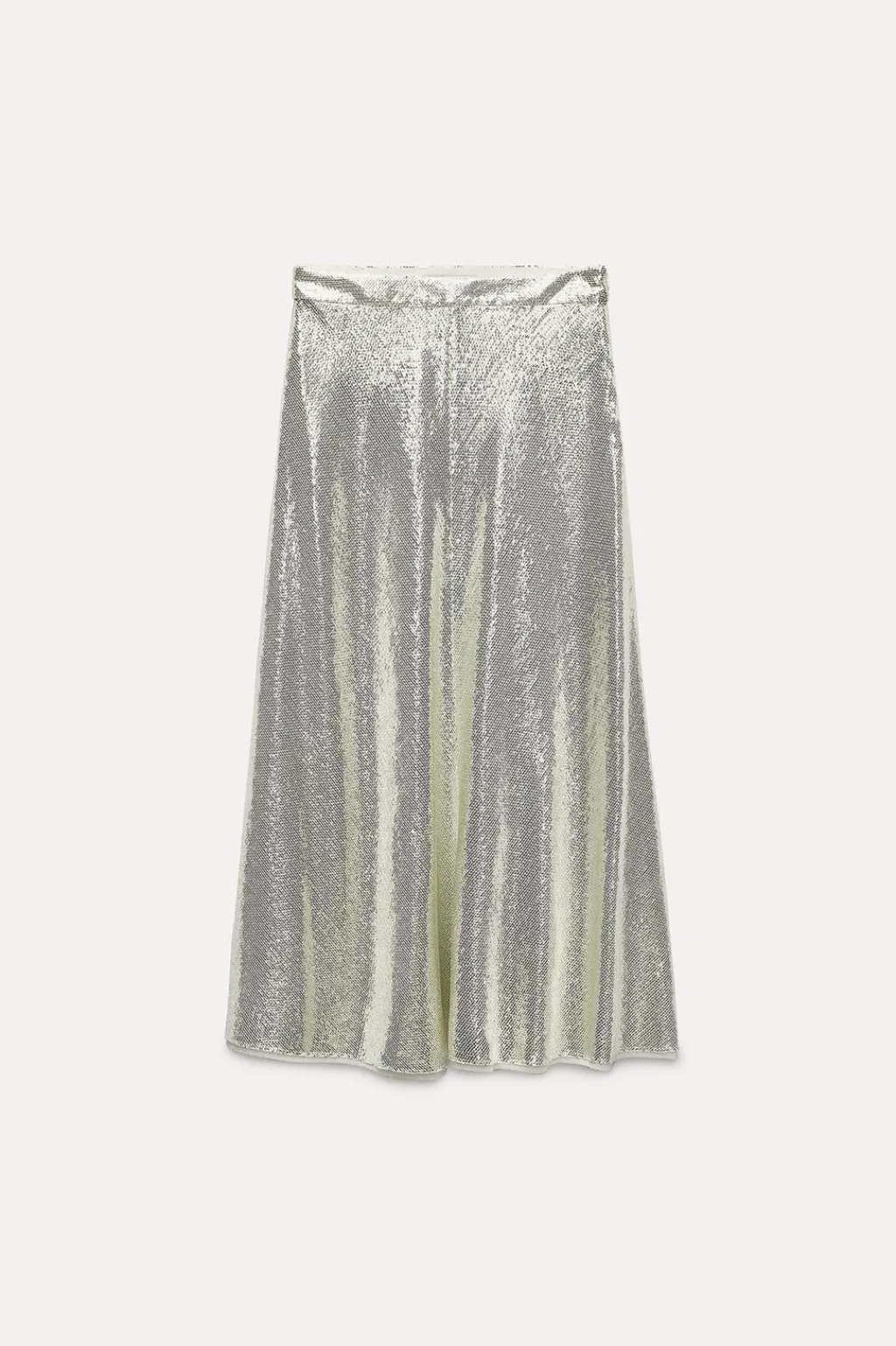 Falda midi de tiro medio medio. Detalle de aplicación de lentejuelas. Bajo acabado en línea evasé. Cierre con cremallera oculta en costura.