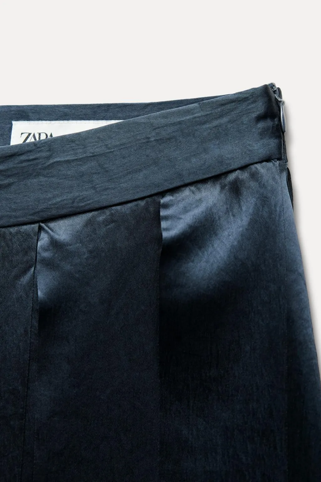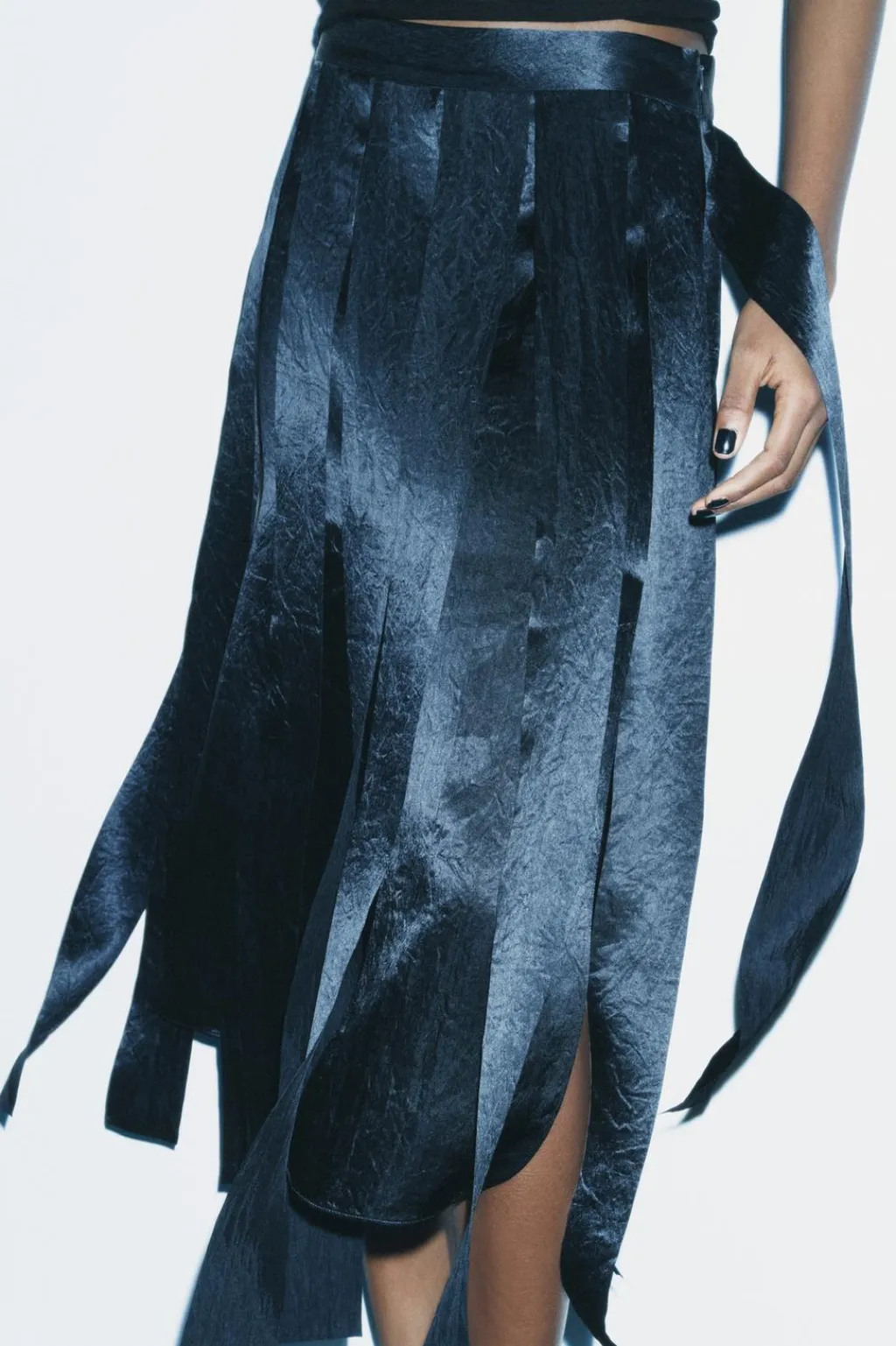 Falda midi de tiro medio. Detalle de tiras en mismo tejido. Cierre lateral con cremallera oculta en costura.