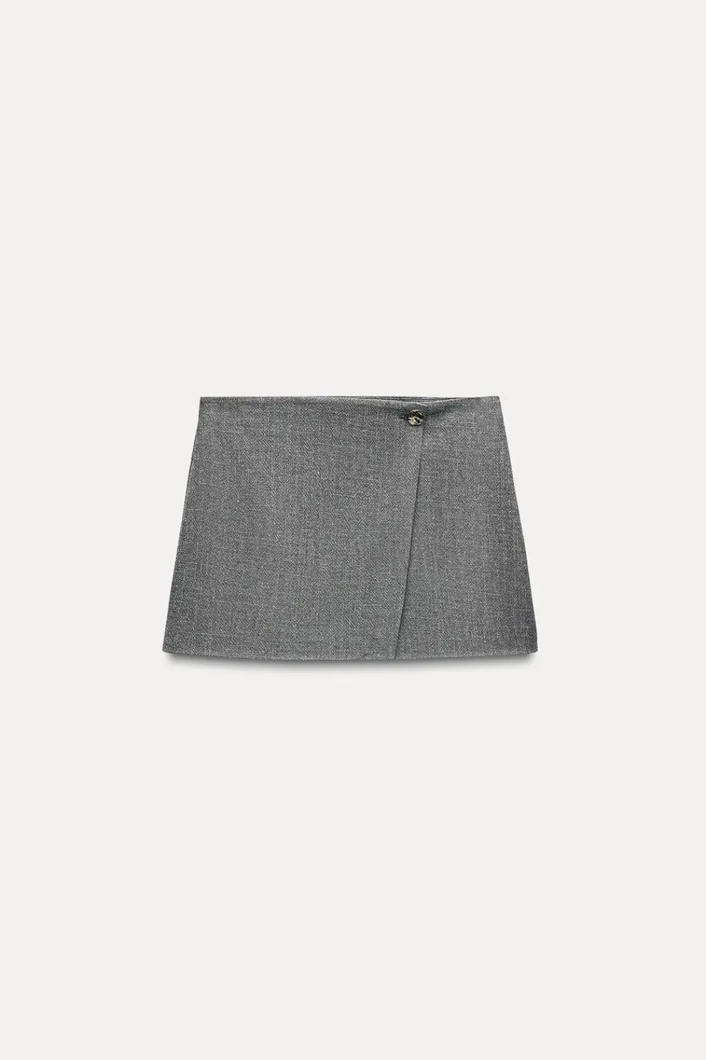Falda de tiro alto y delantero cruzado con botón metálico con relieve. Detalle de tejido con hilo metalizado. Cierre lateral con cremallera oculta en costura.
