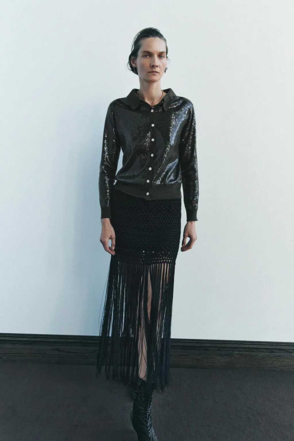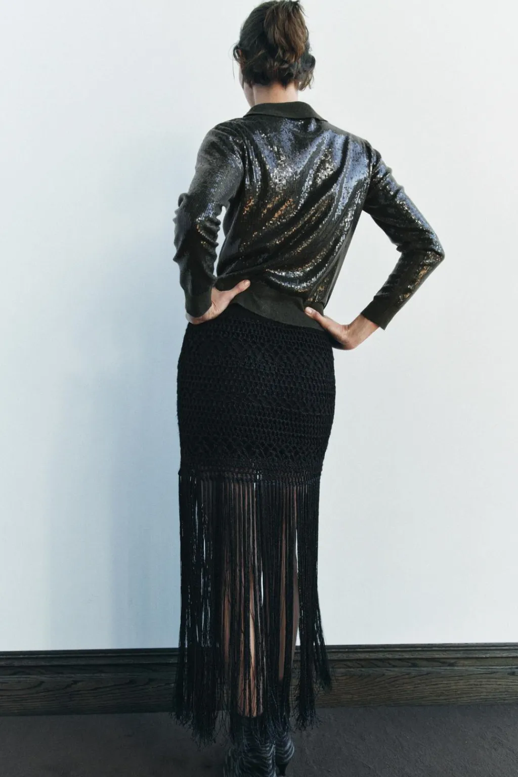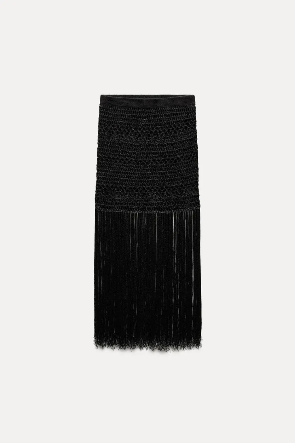 Falda de tiro alto con cintura elástica. Forro interior. Bajo acabado con flecos.