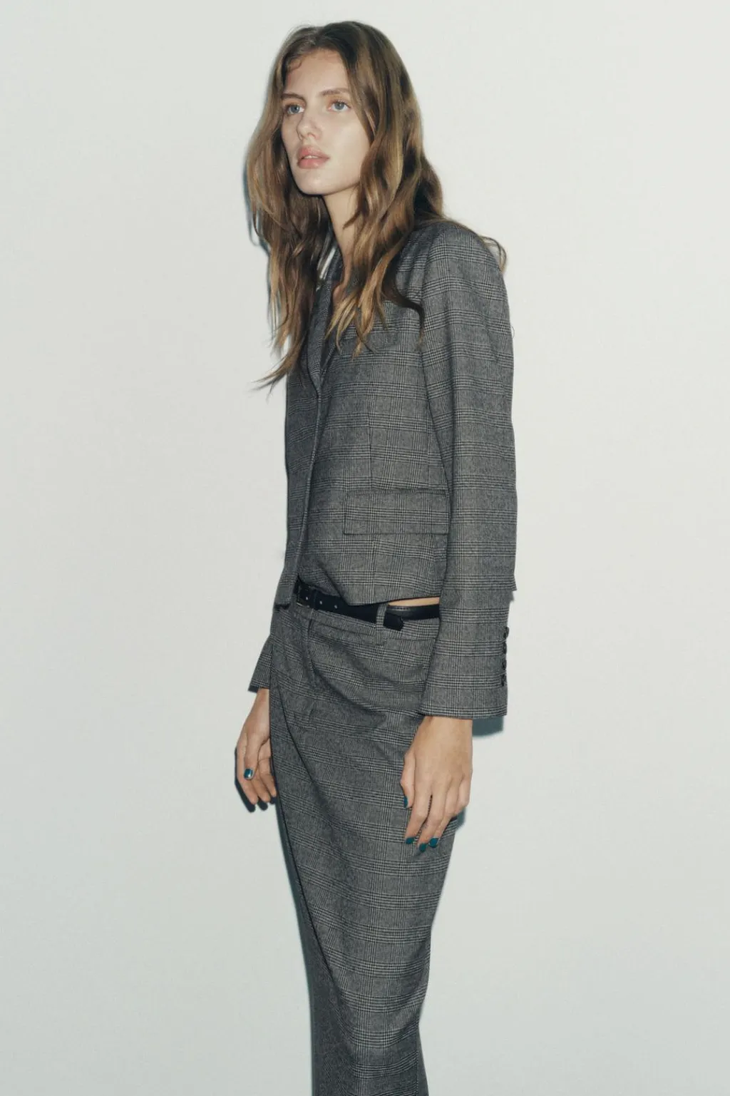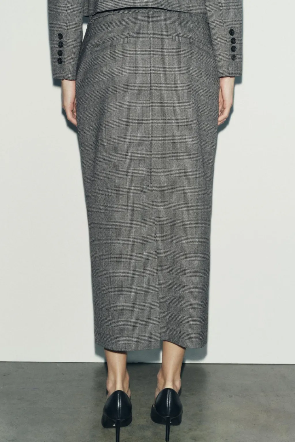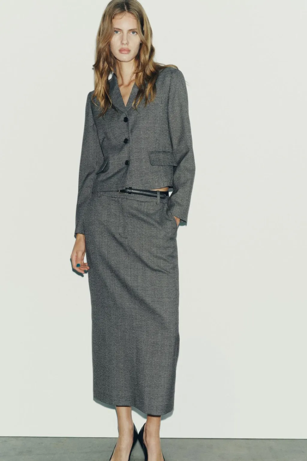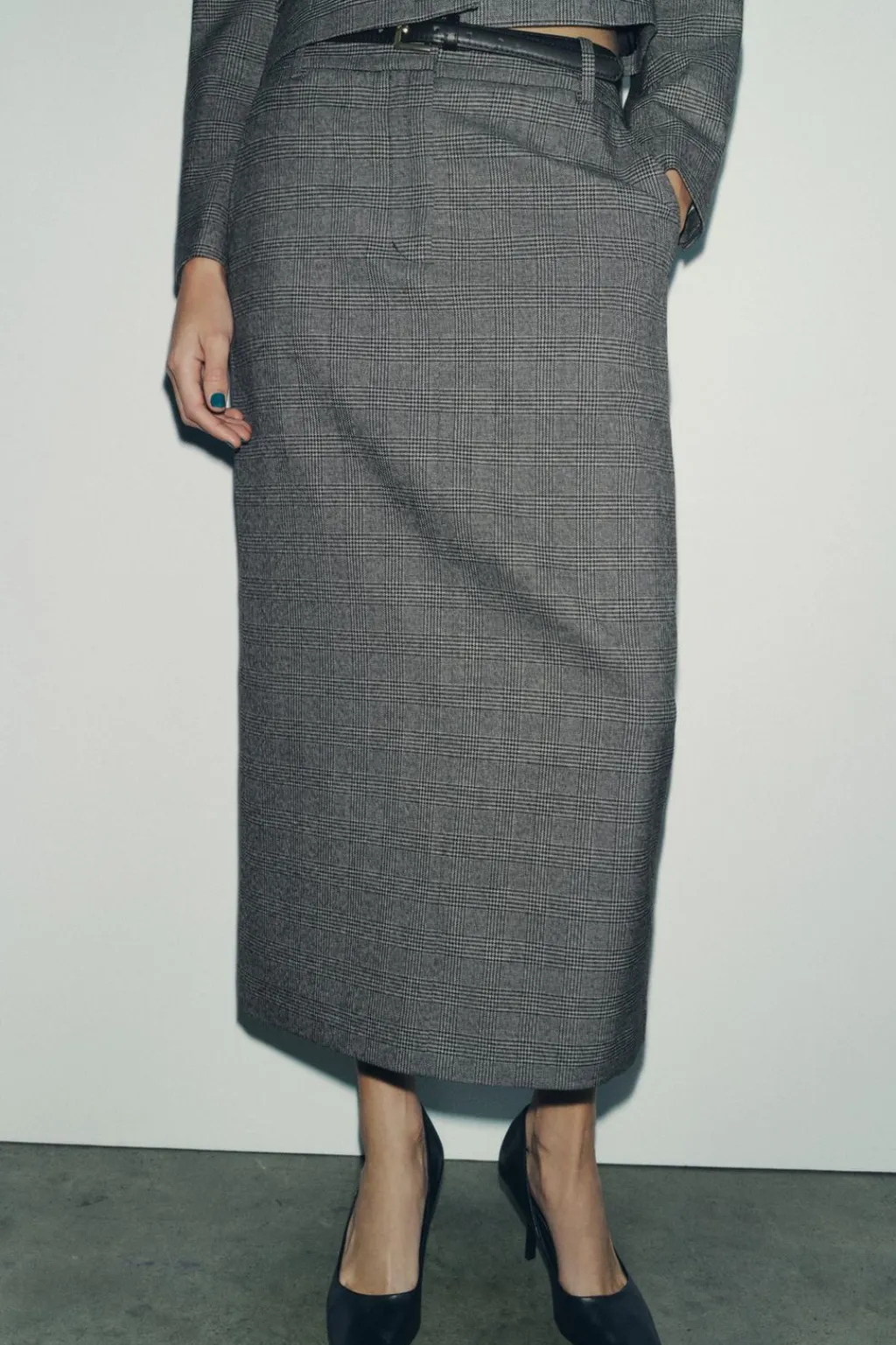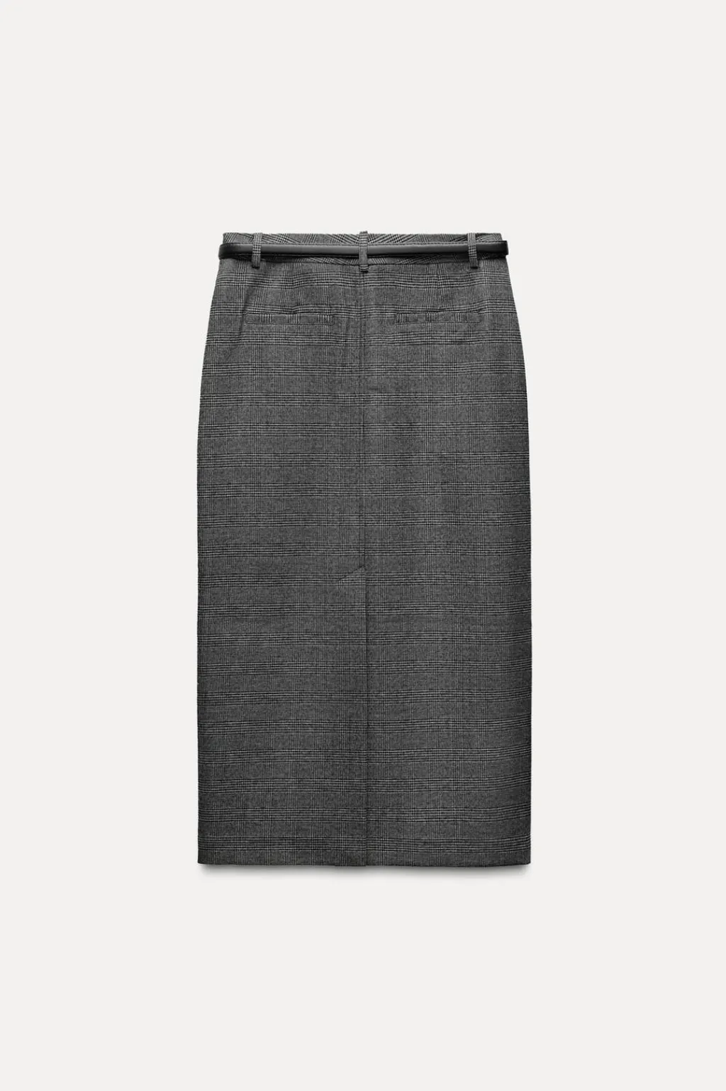 Falda midi de tubo con tiro alto y cintura con trabillas. Bolsillos delanteros. Cierre frontal con cremallera, botón y gancho metálico.