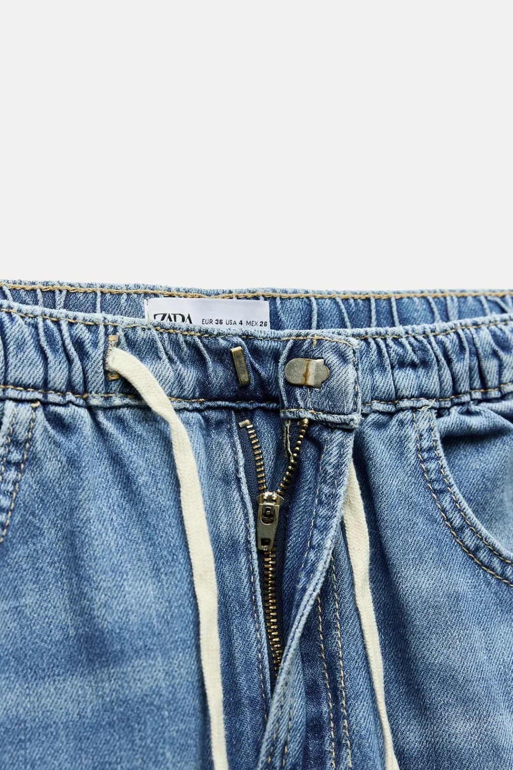 Jeans de tiro medio con cintura elástica y ajustable con cordones a contraste. Bolsillos laterales y de plastrón en espalda.