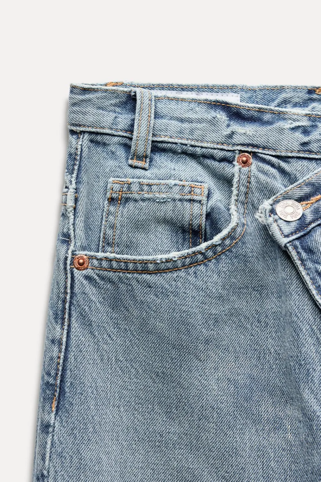 Jeans de tiro alto y cinco bolsillos. Pierna ancha extra larga. Cierre frontal asimétrico con cremallera y botones metálicos.