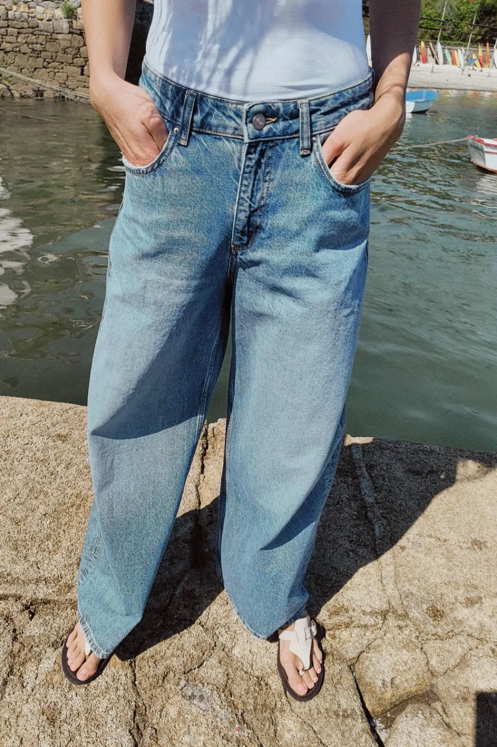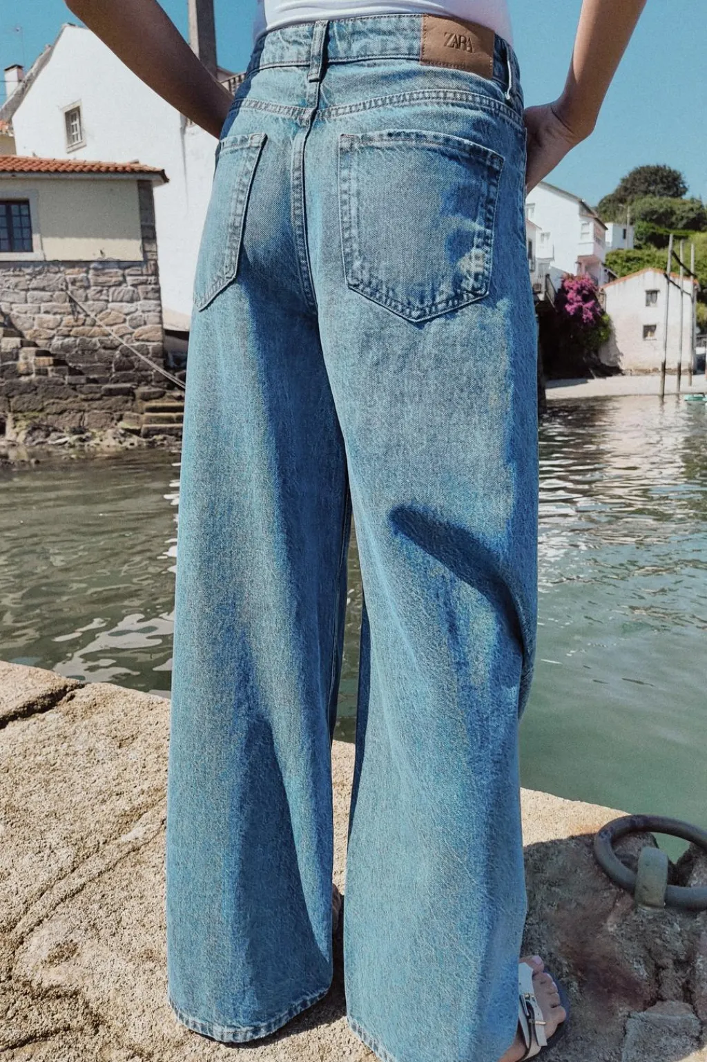Jeans de tiro alto con cinco bolsillos. Efecto lavado. Pernera muy ancha. Cierre frontal con cremallera y botón.