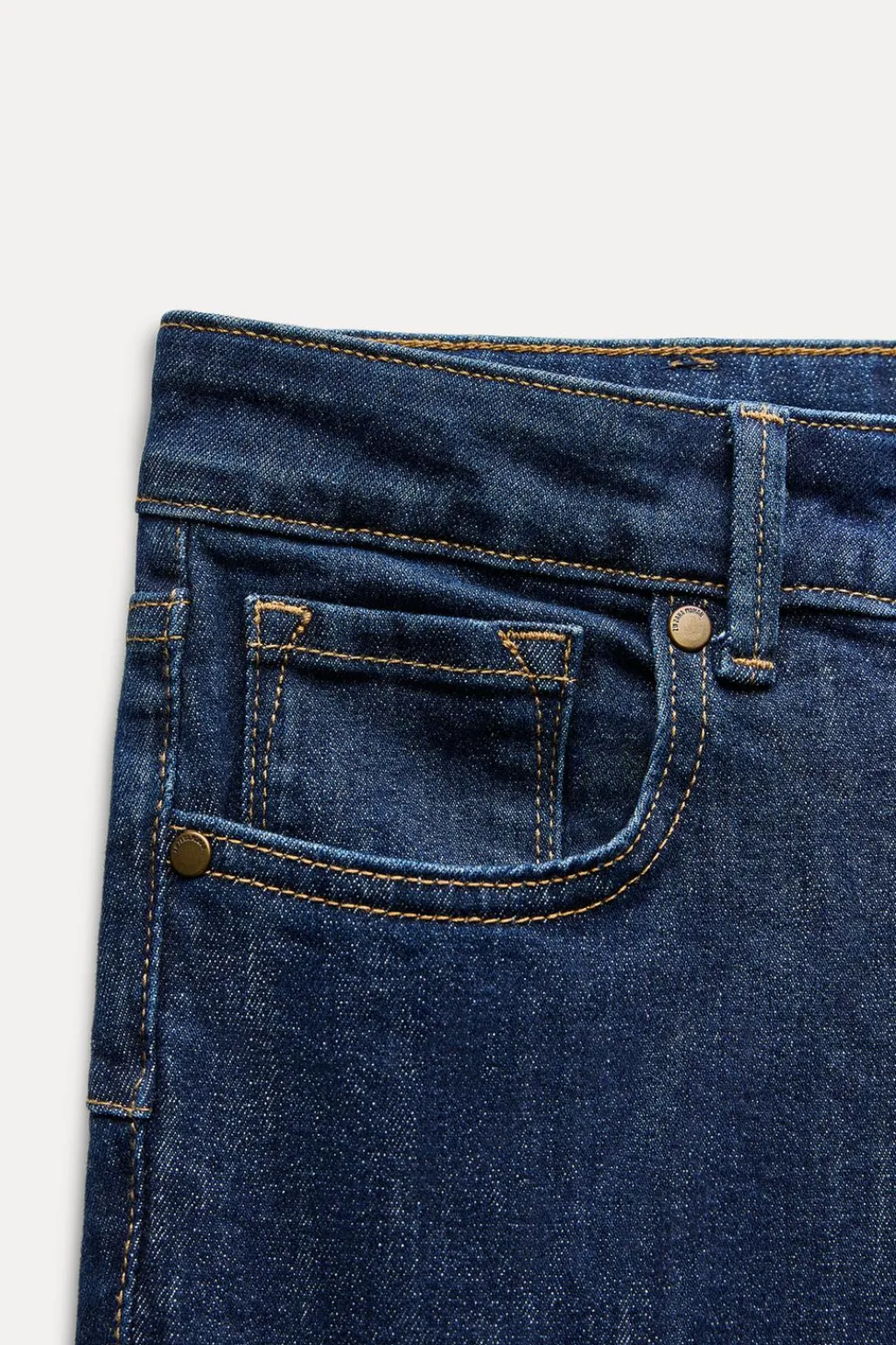 Jeans de tiro medio y cintura con trabillas. Cinco bolsillos. Bajo acabado en línea evasé. Cierre frontal con cremallera y botón.