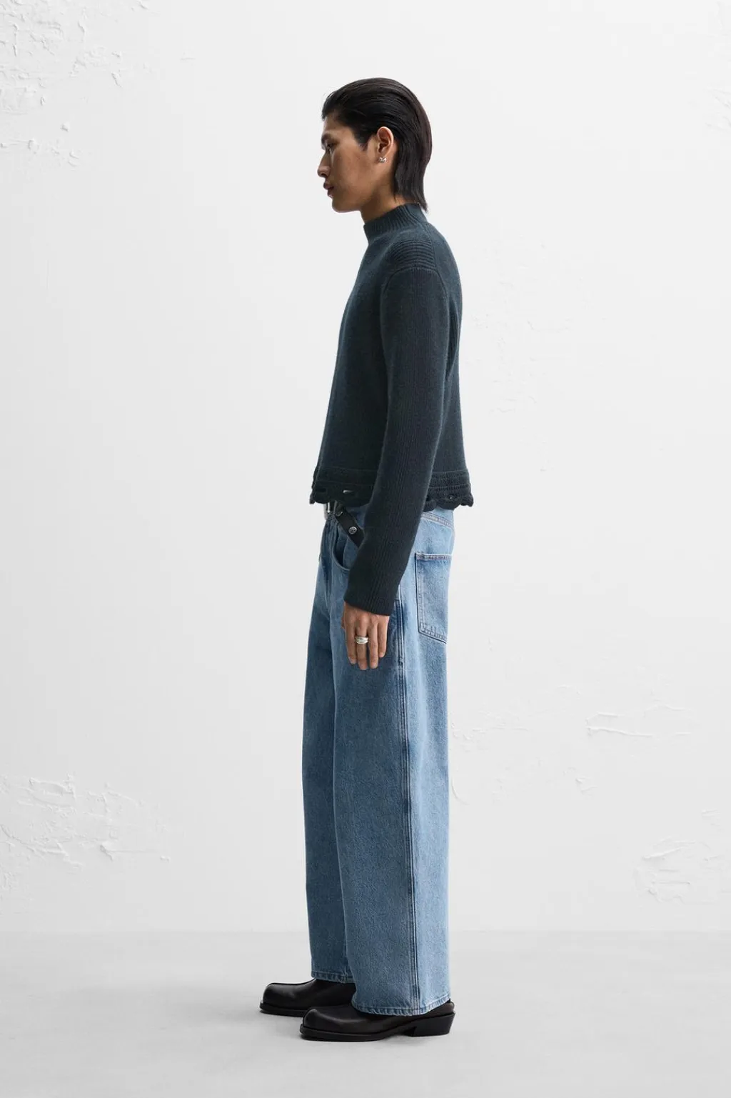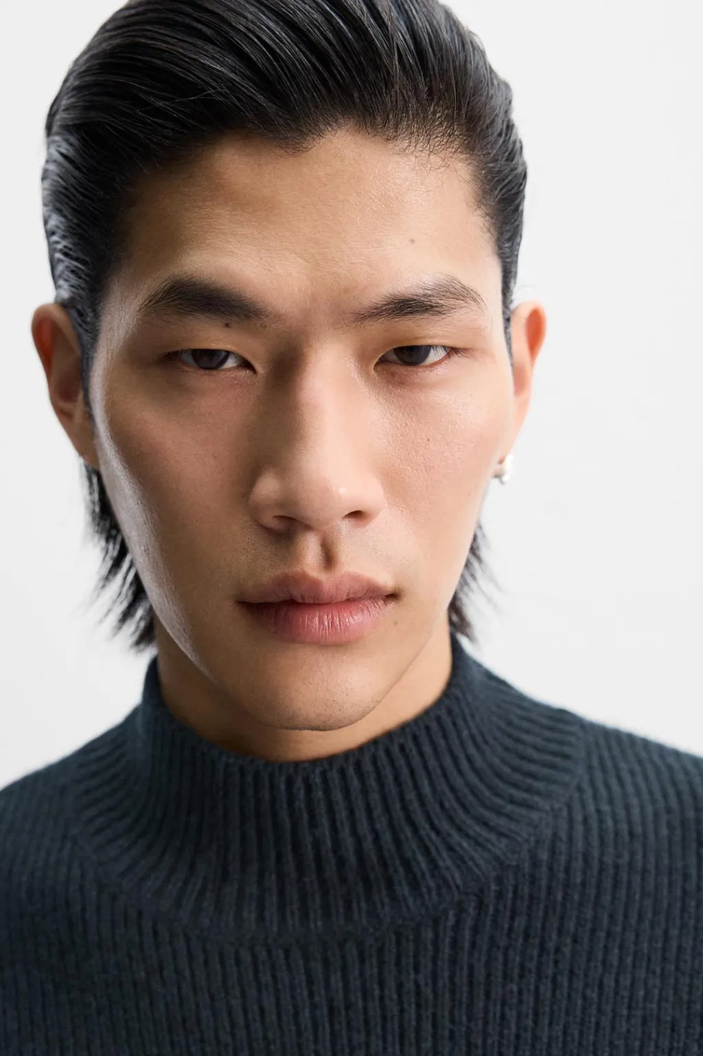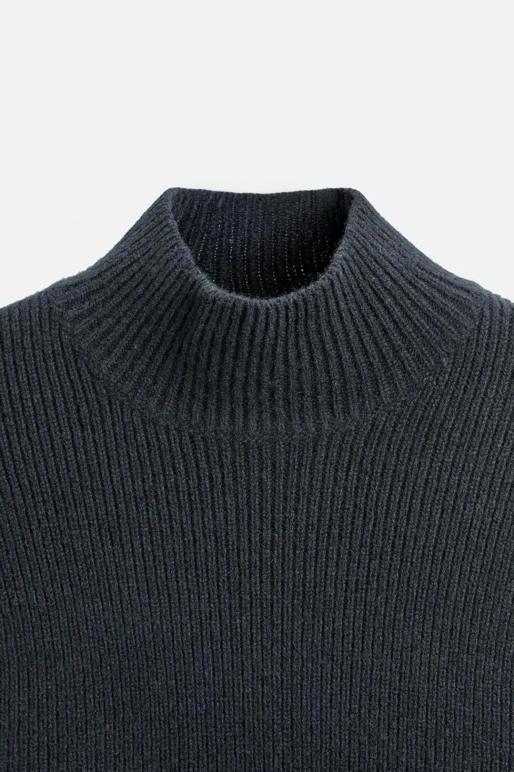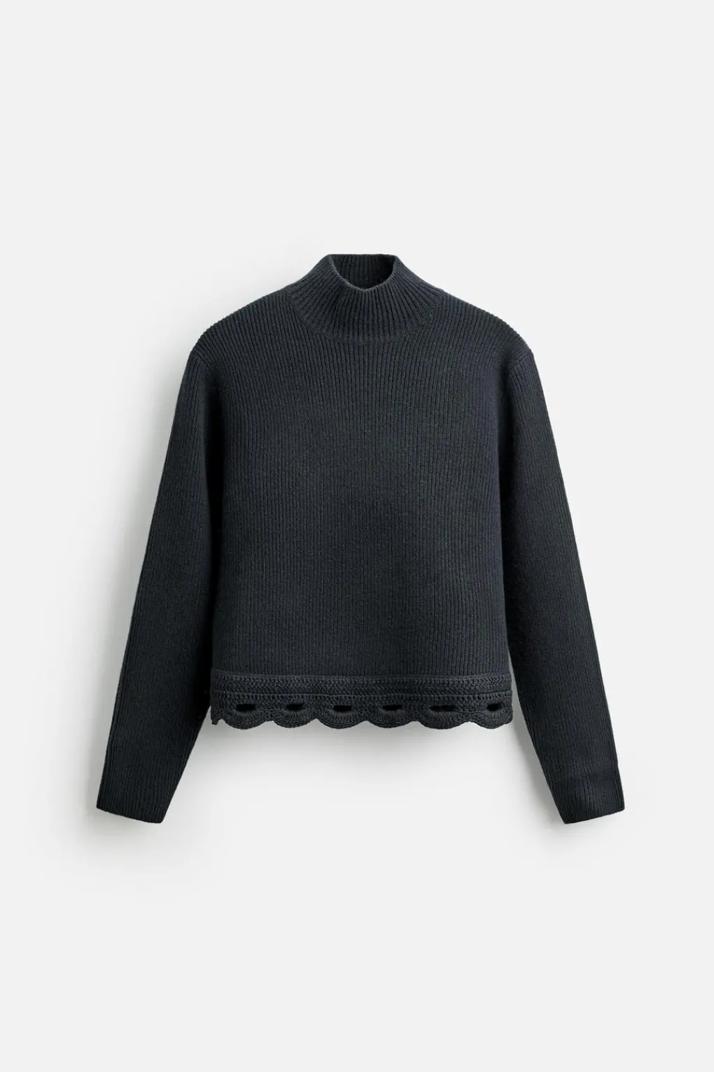 Jersey cropped fit tejido en hilatura con mezcla de lana y yak. Cuello perkins y manga larga. Bajo acabado con crochet geométrico. Acabados en rib.