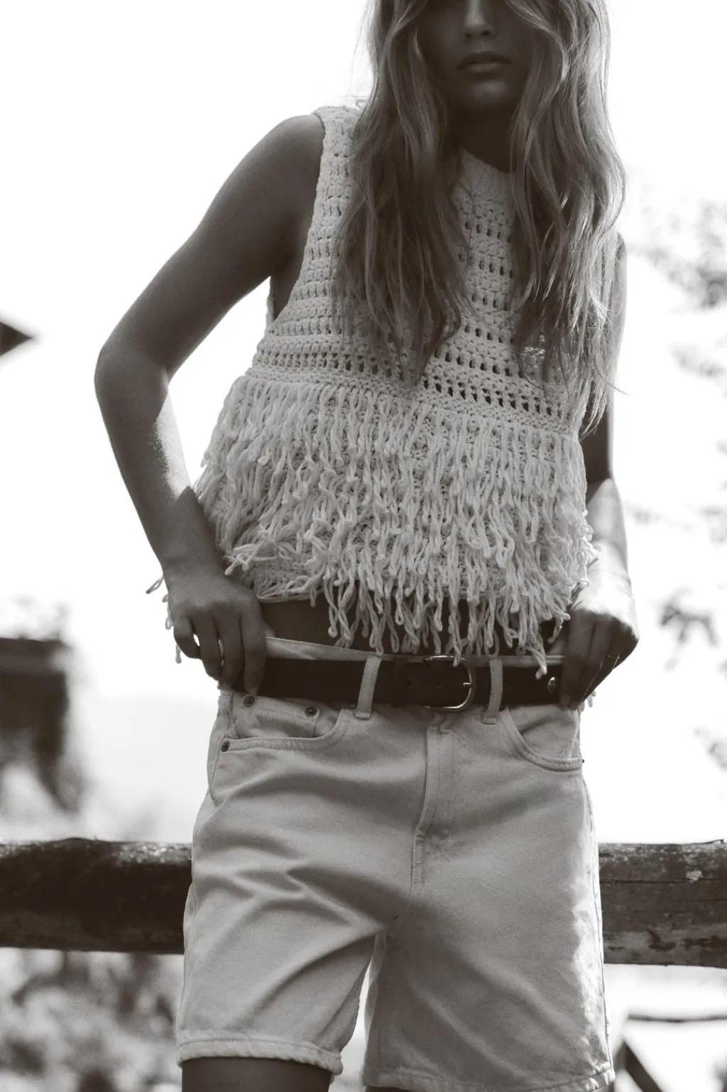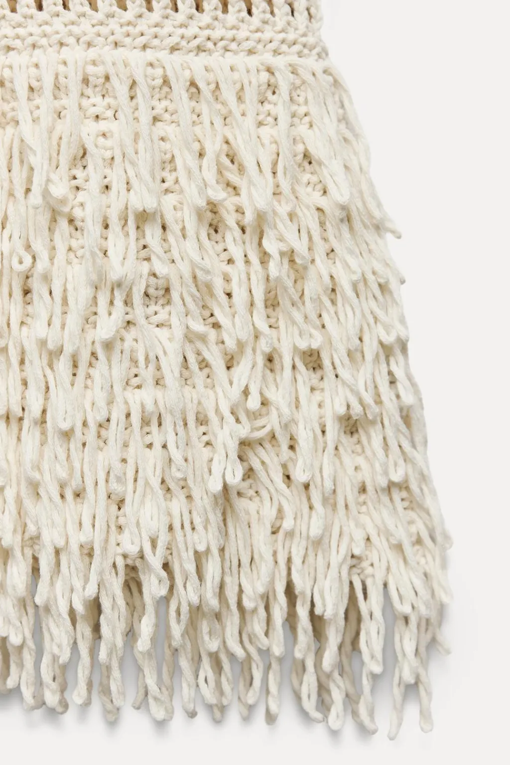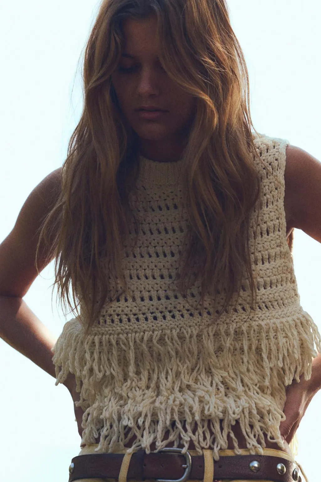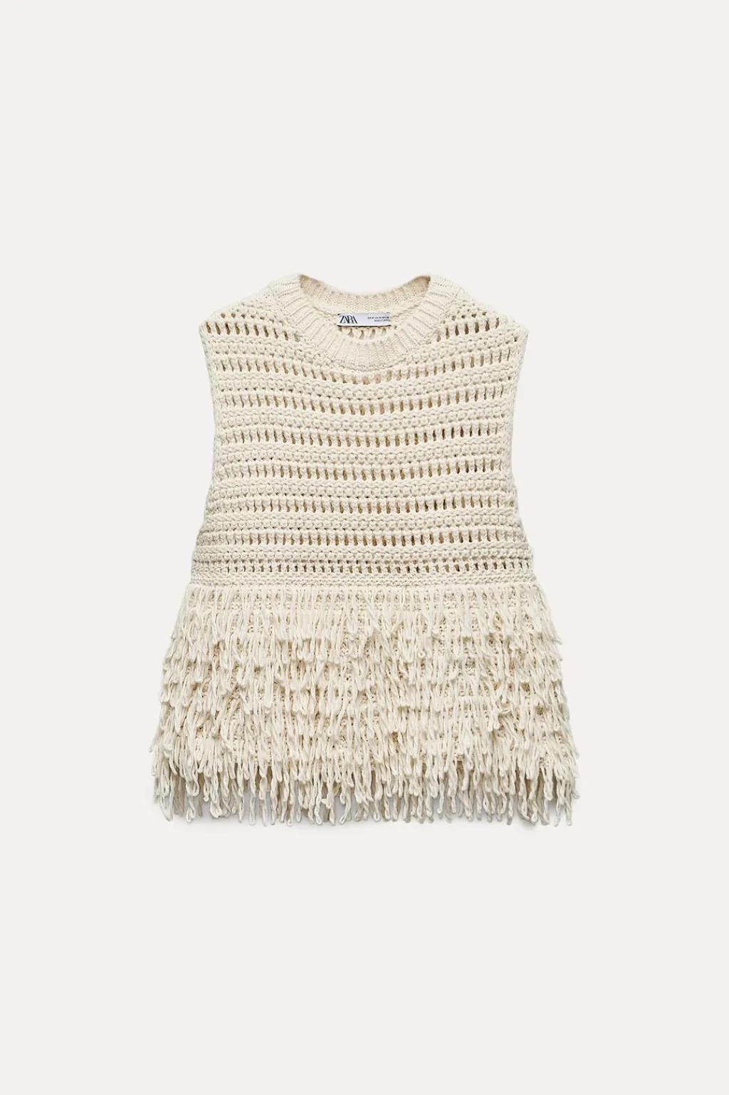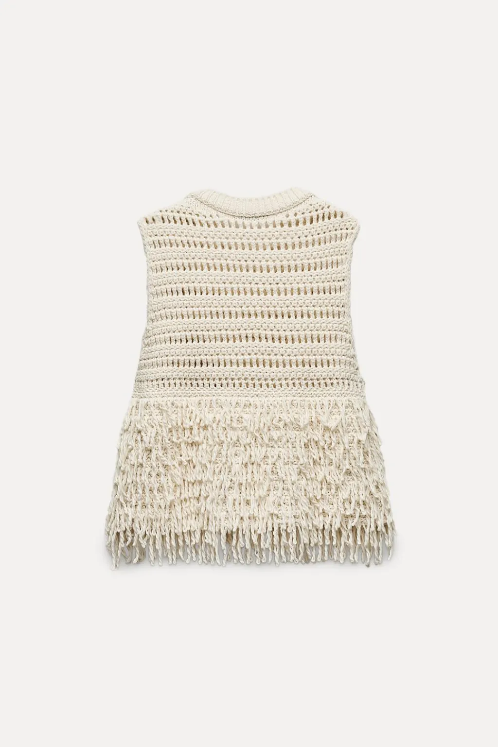 Jersey chaleco de cuello redondo y manga sisa. Detalle de flecos.