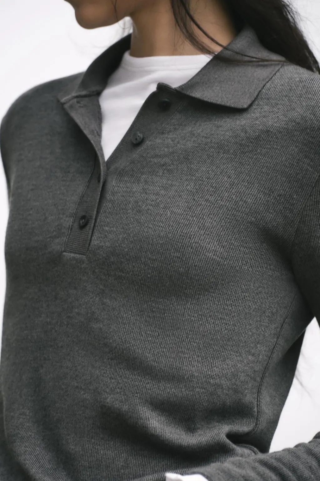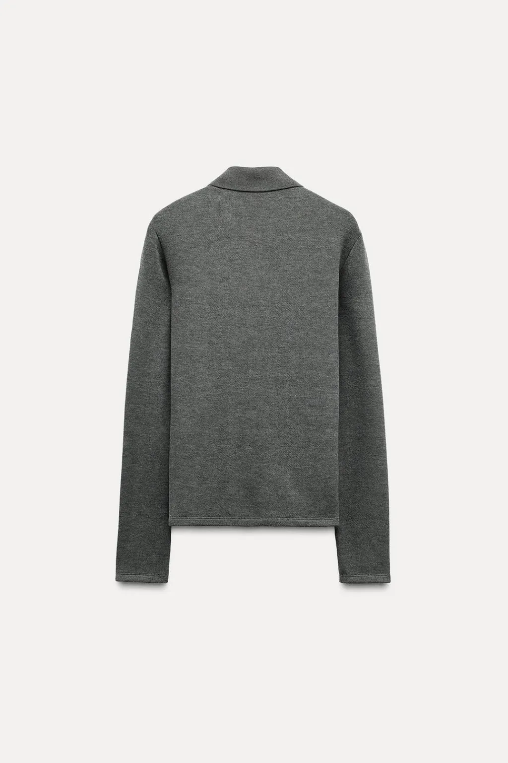 Jersey confeccionado en hilatura con viscosa. Cuello polo y manga larga. Cierre frontal con botones.