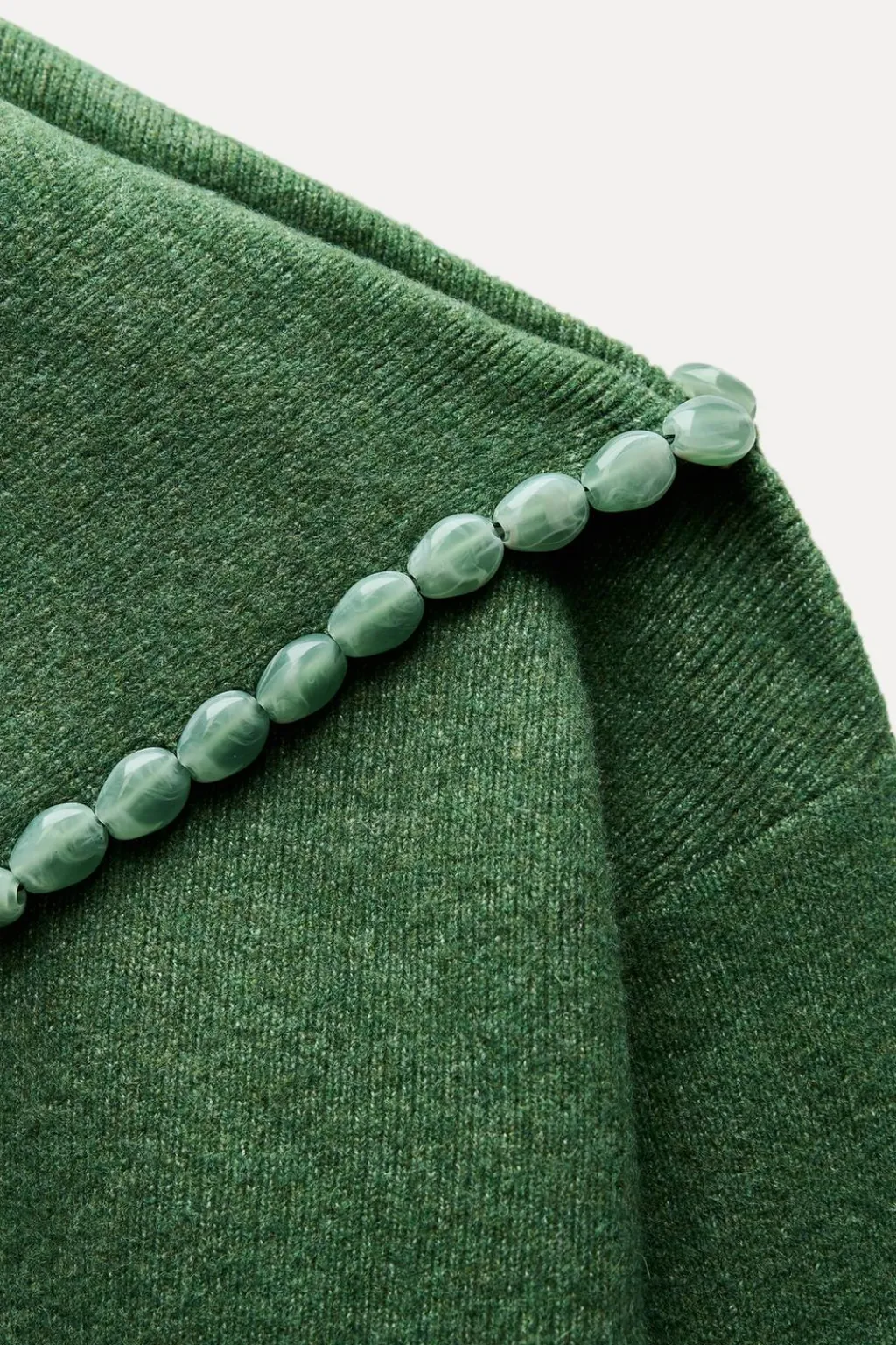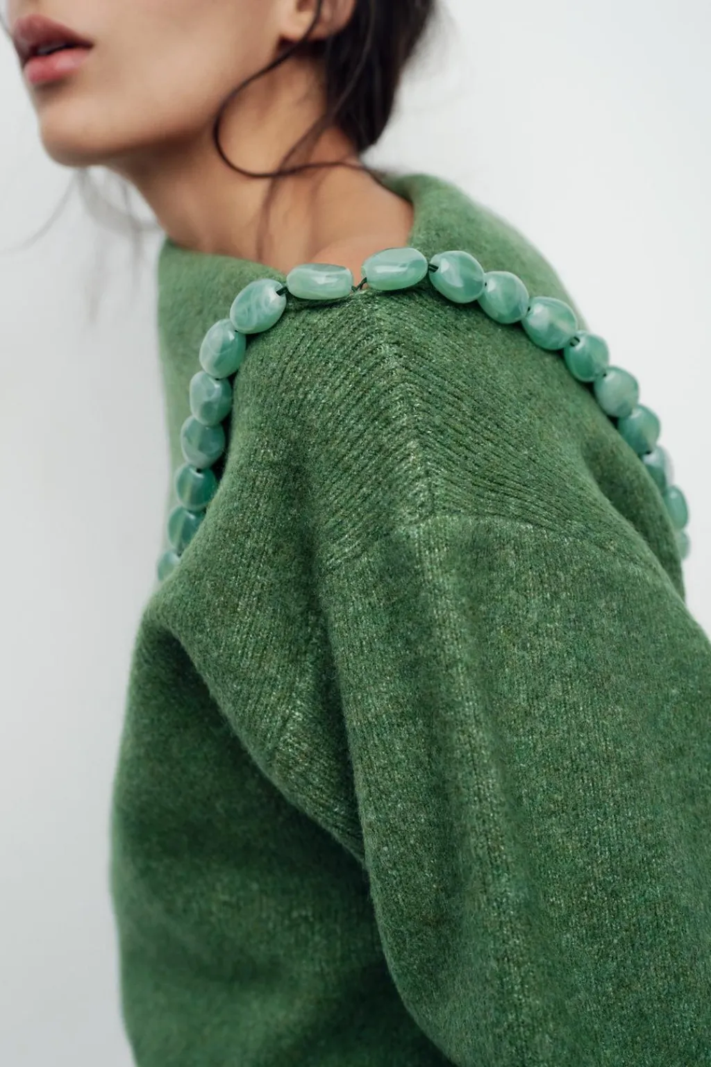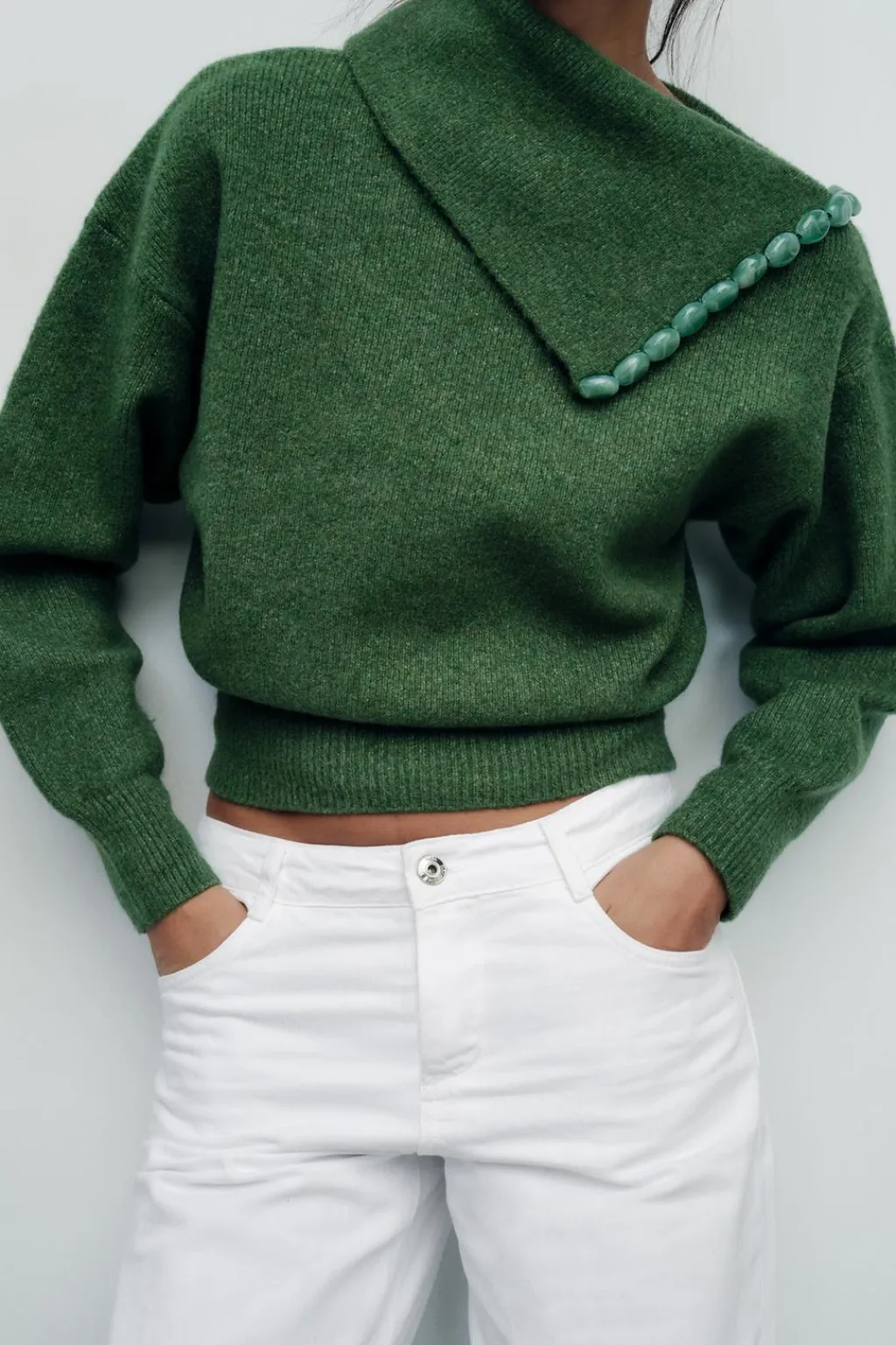 Jersey con solapa asimétrica y aplicación de bolas. Manga larga. Acabados en rib.