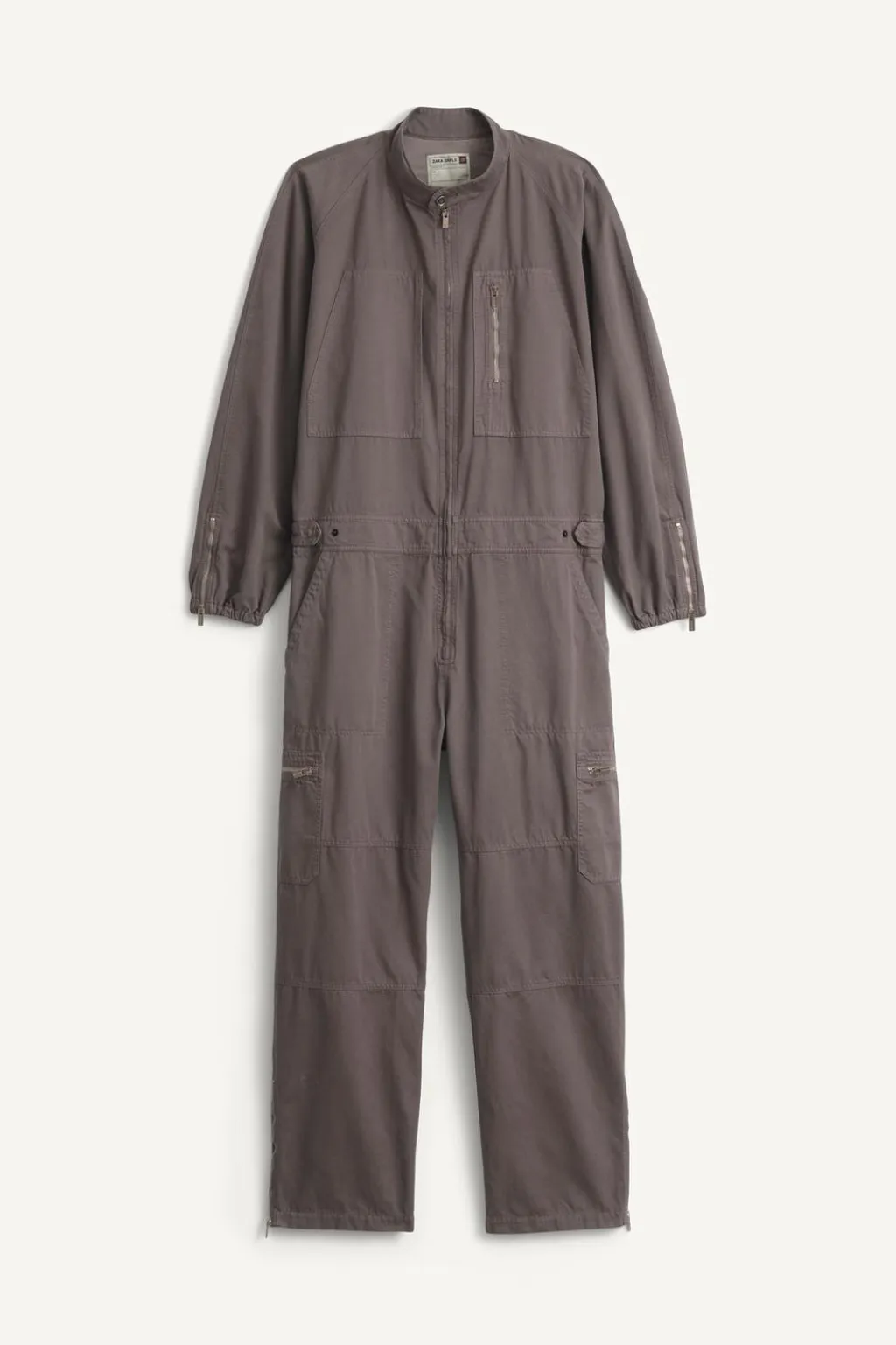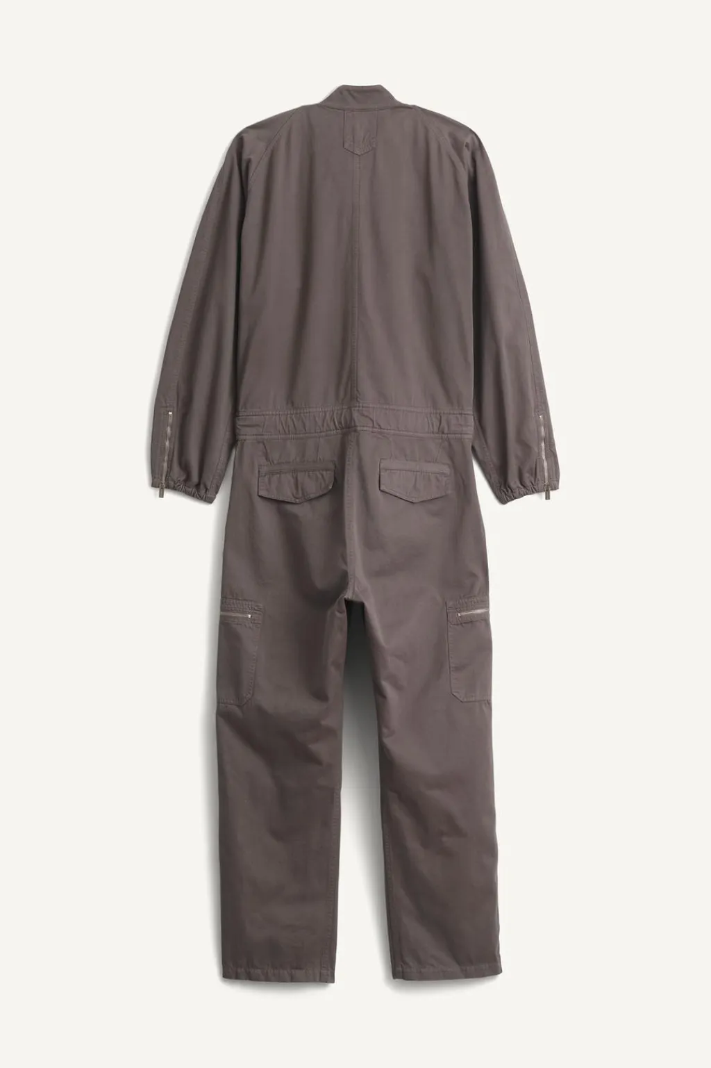Mono relaxed fit confeccionado en tejido de algodón con efecto lavado. Cuello tira y manga larga acabada en puño con elástico ajustable con cremallera. Bolsillos asimétricos de plastrón en pecho. Cintura elástica en espalda y ajustable con trabillas. Pantalón con bolsillos en delantero y detalle de bolsillos traseros de solapa. Aplicación de bolsillos plastrón con cierre de cremallera en perneras. Bajo ajustable en laterales con cremallera. Cierre frontal de con cremallera.