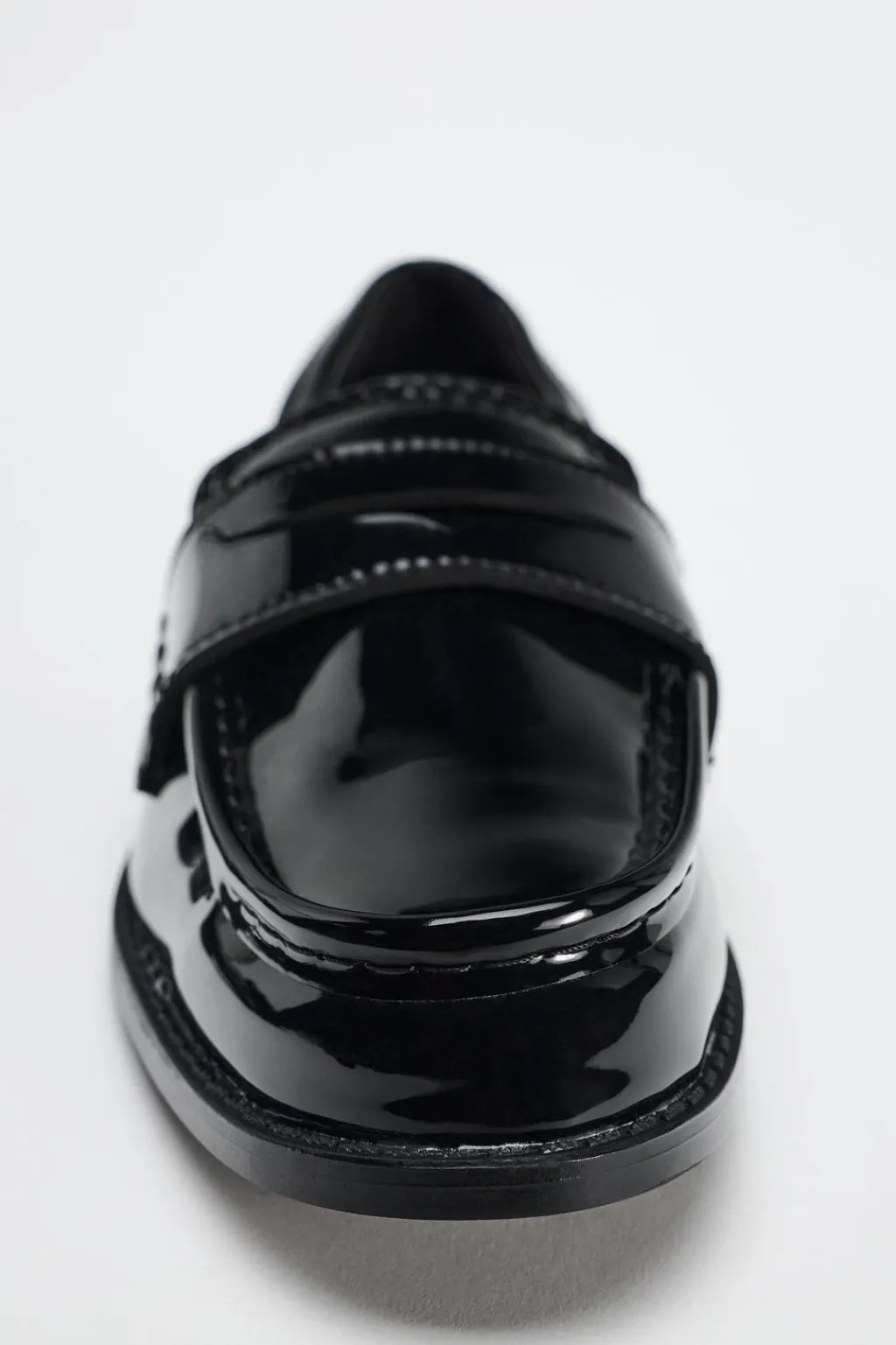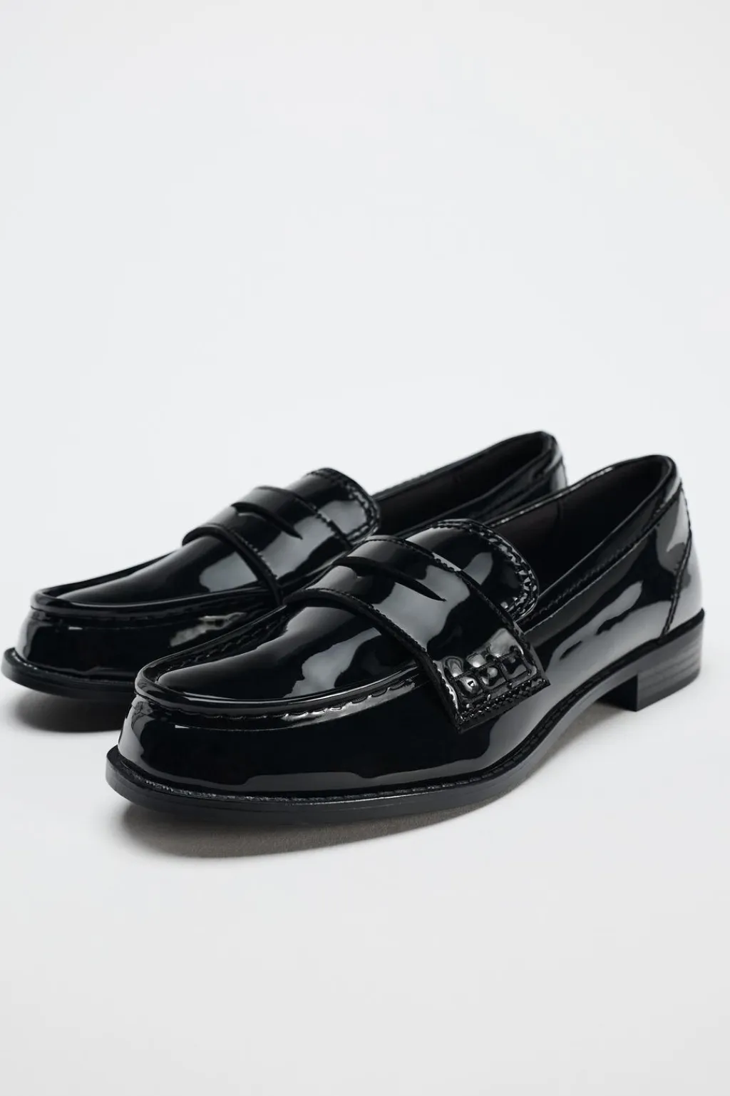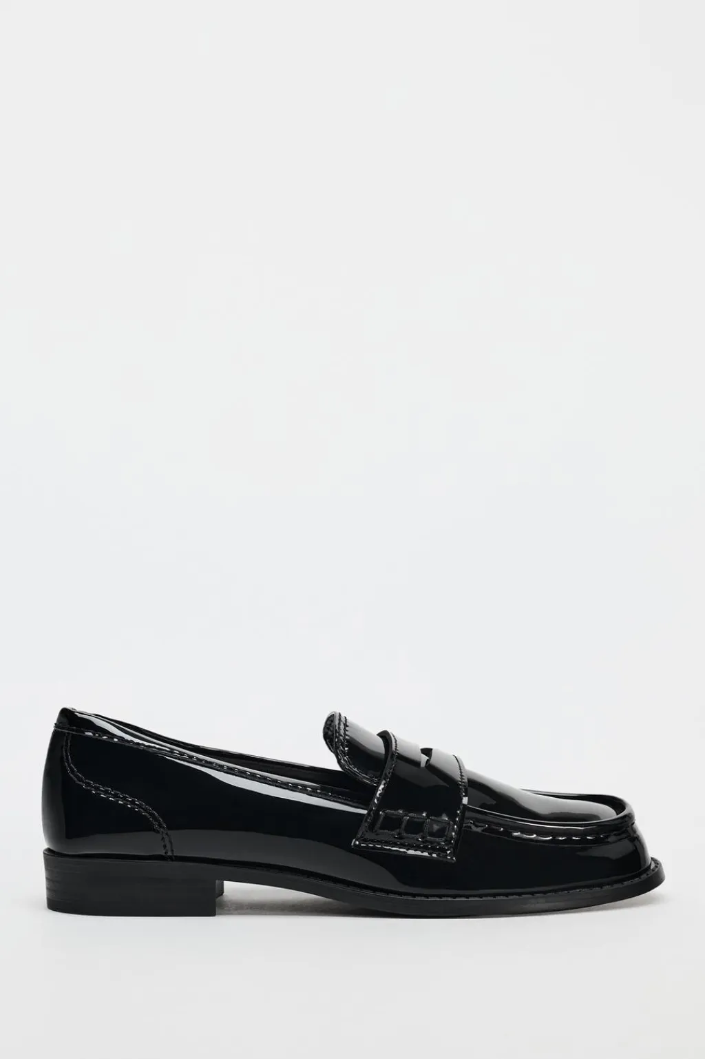 Zapato plano tipo mocasín en efecto acharolado. Copete subido y antifaz. Acabado en punta redonda.