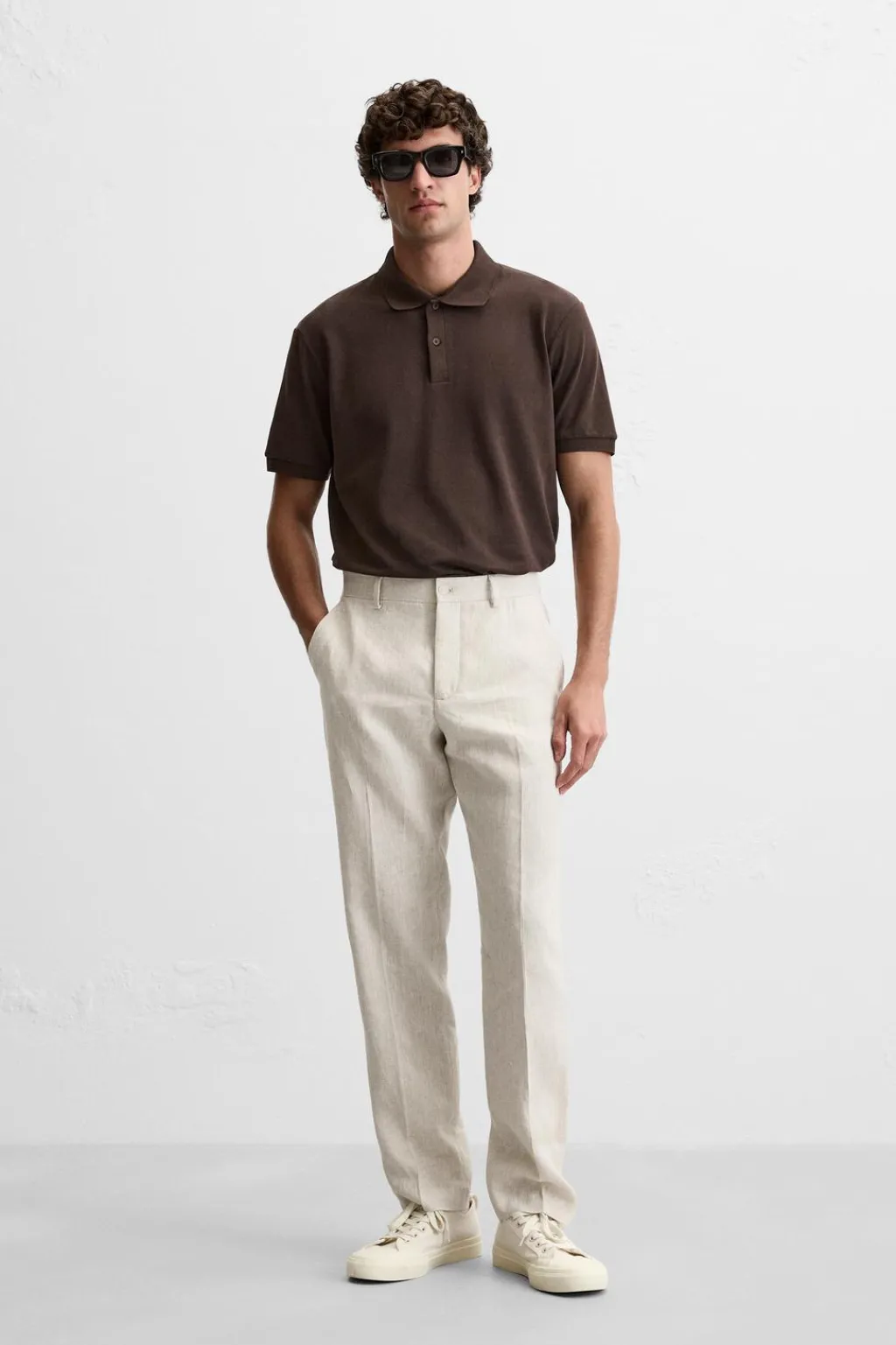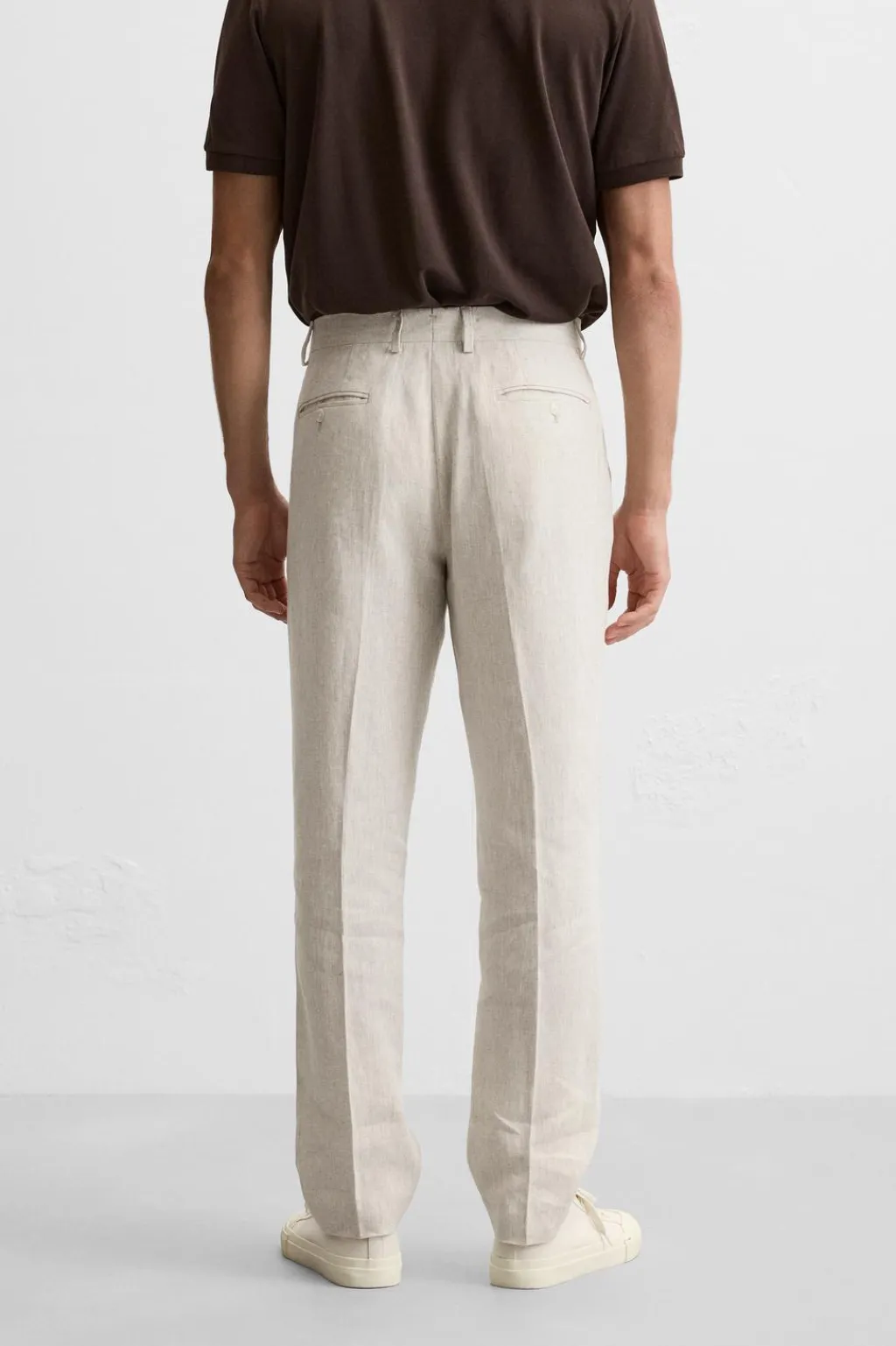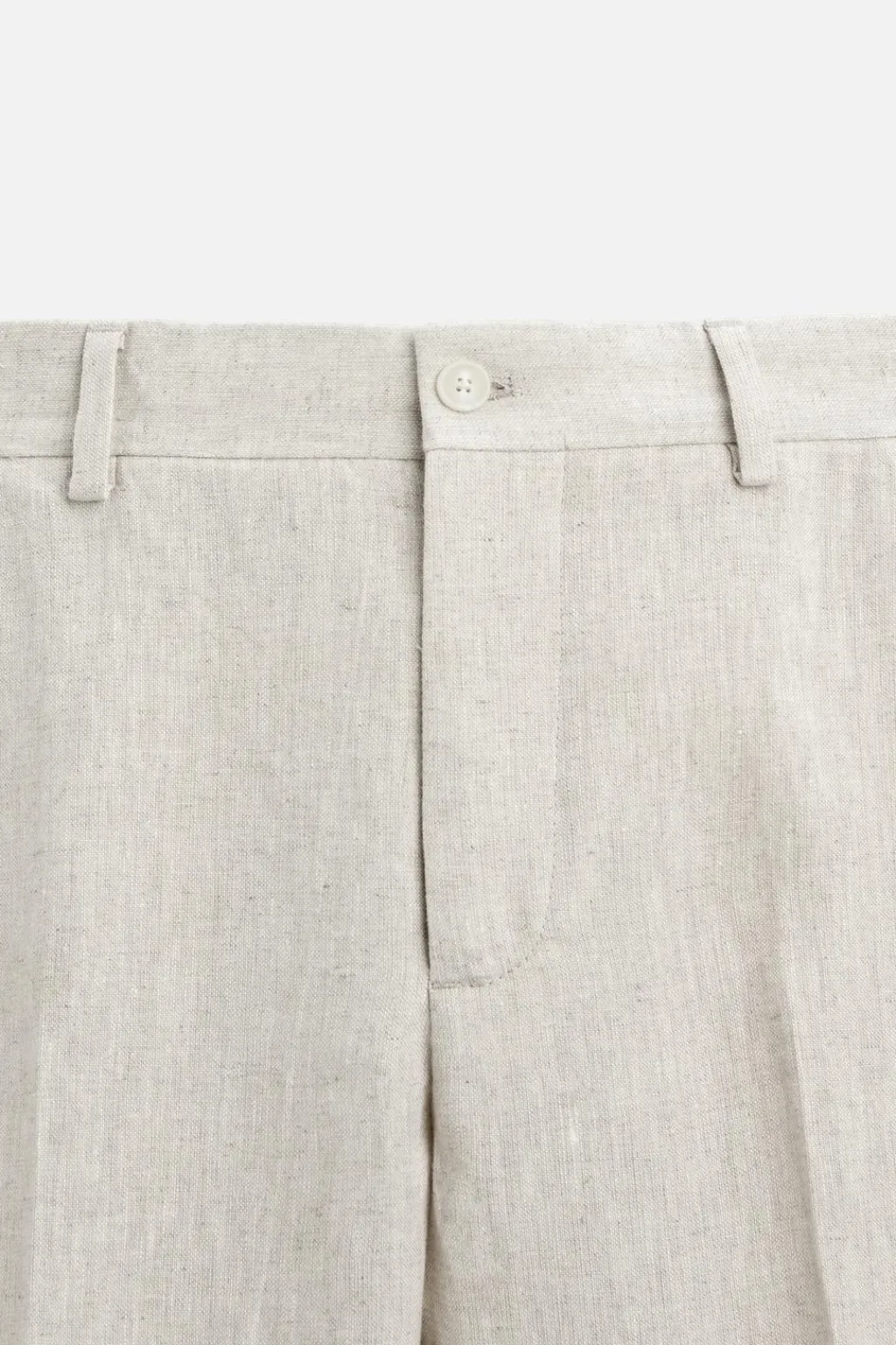 Pantalón regular fit confeccionado en tejido de lino. Bolsillos frontales y detalle de bolsillos traseros de vivo. Cierre frontal con cremallera y botón.