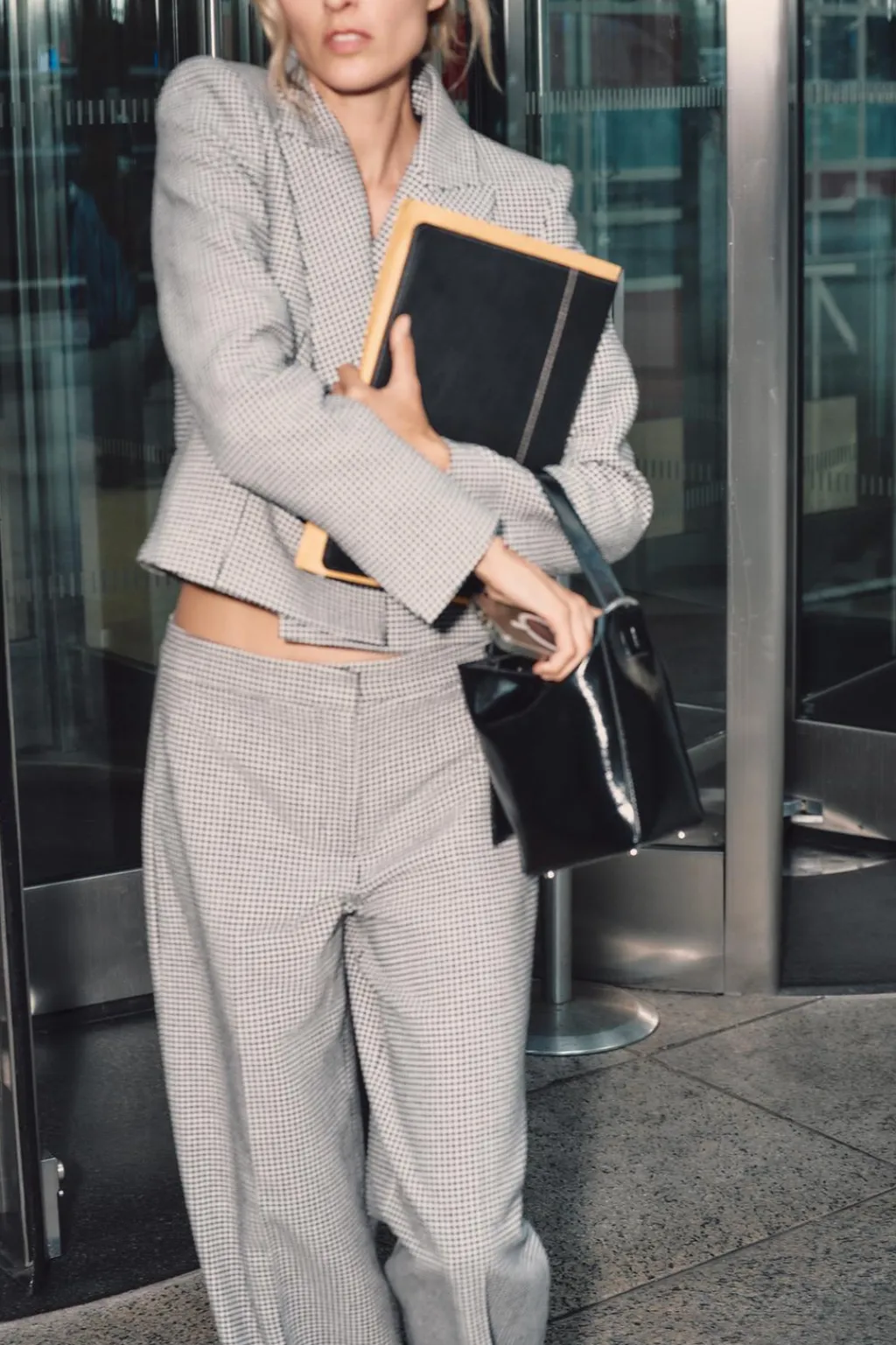 Pantalón de tiro alto con bolsillos delanteros. Pernera ancha. Cierre frontal con cremallera, botón interior y gancho.