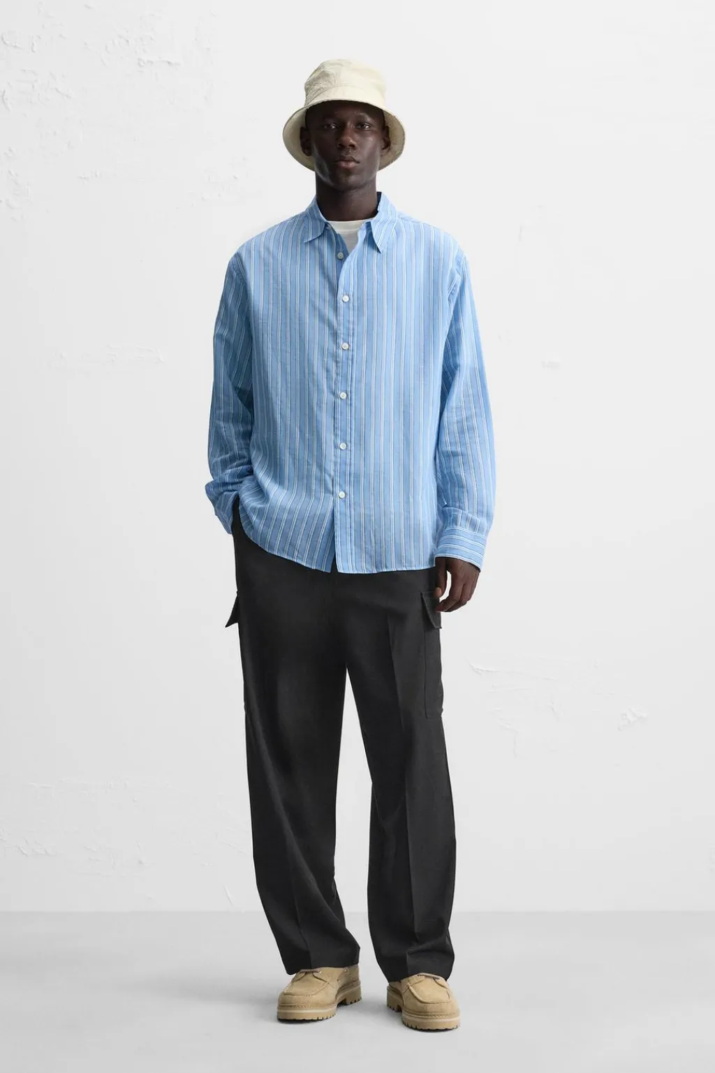 Pantalón relaxed fit. Cintura con detalle de pliegues en delantero. Bolsillos delanteros y detalle de bolsillos traseros de vivo. Aplicación de bolsillos plastrón con solapa en perneras. Cierre frontal con cremallera y botón.