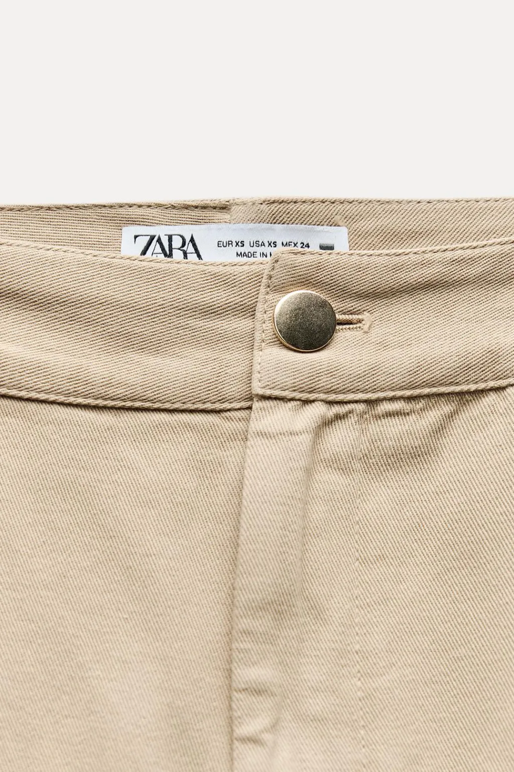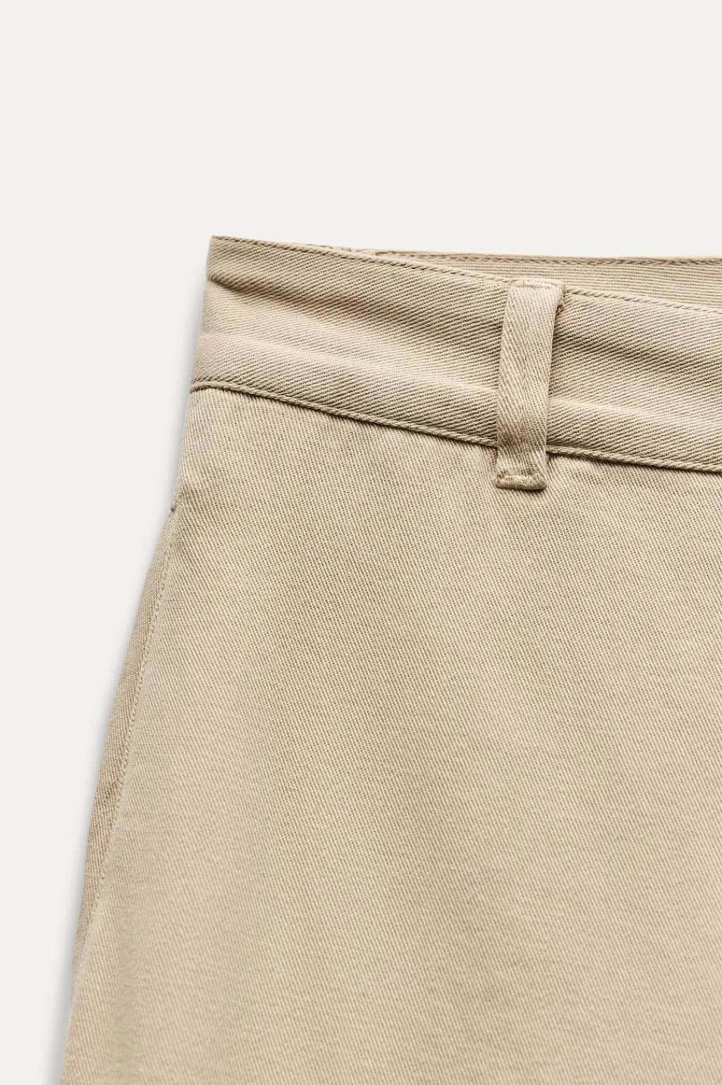Pantalón de tiro alto con trabillas. Bolsillos laterales y de plastrón en espalda. Pernera ancha y corta. Cierre frontal con cremallera y botón metálico.