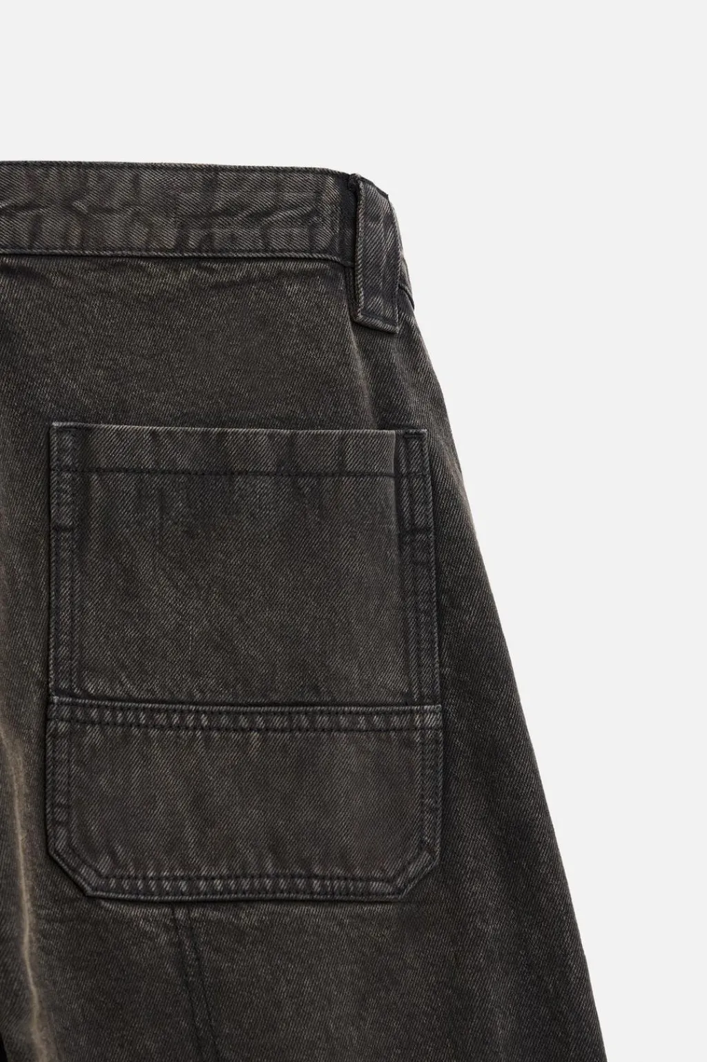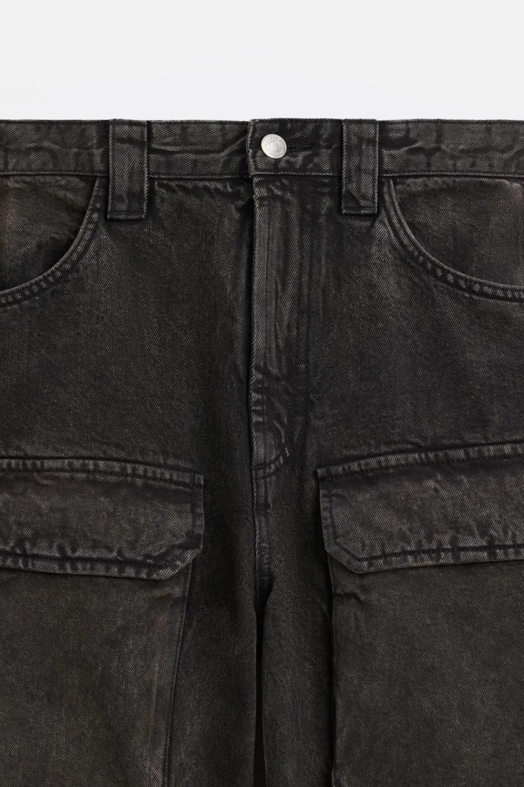 Pantalón relaxed fit confeccionado en denim de algodón. Bolsillos frontales y detalle de bolsillos traseros de plastrón. Aplicación de bolsillos multifunción en perneras. Efecto lavado. Cierre frontal con cremallera y botón.