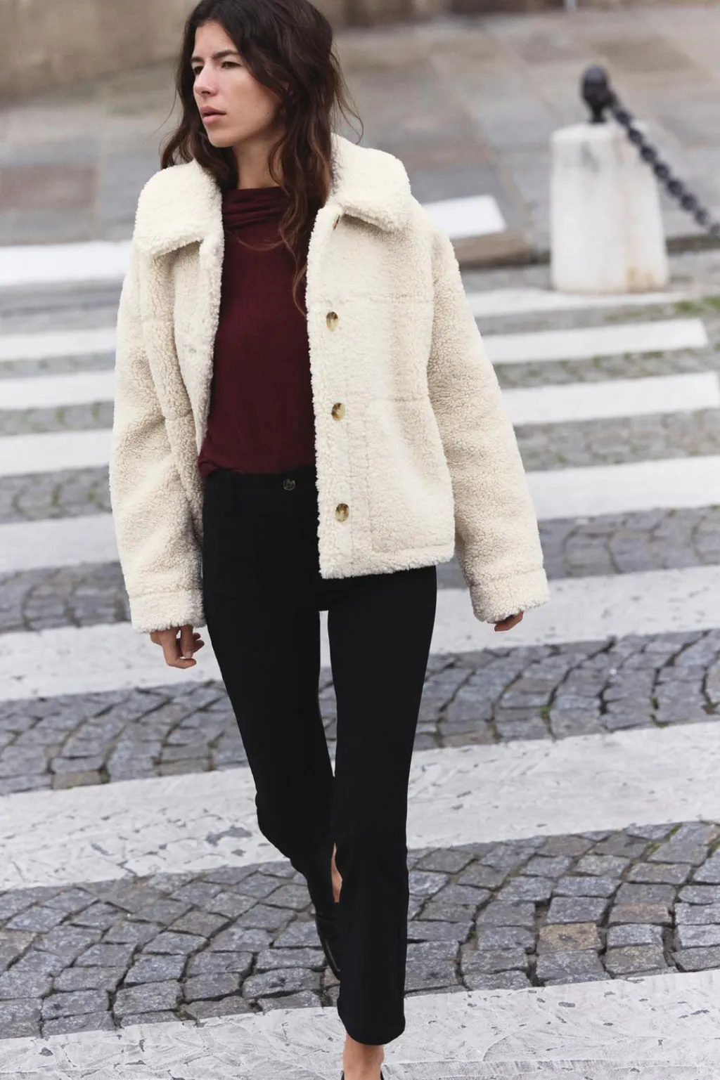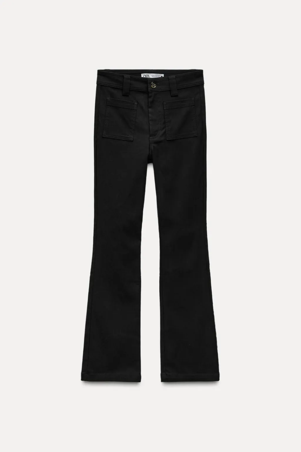 Pantalón de tiro alto con bolsillos de plastrón delanteros y falsos bolsillos de vivo en espalda. Cierre frontal con cremallera y botón.