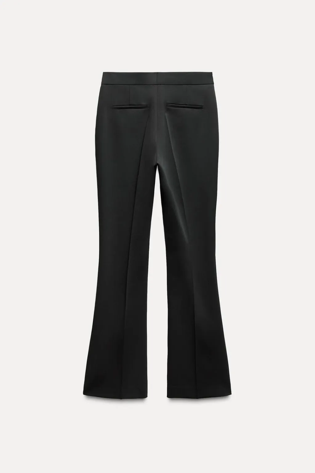 Pantalón de tiro alto con falsos bolsillos de vivo en espalda. Bajo en evasé. Cierre frontal con cremallera, botón interior y gancho.