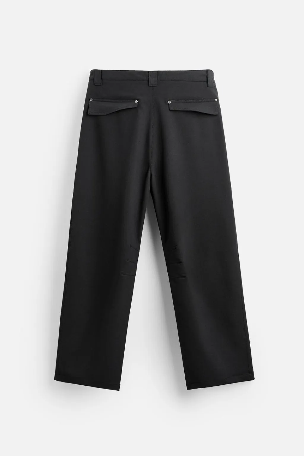 Pantalón flared fit. Bolsillos frontales y detalle de bolsillos traseros de solapa. Detalle de costuras y aplicación de ojales metálicos en perneras. Cierre frontal con cremallera y botón.