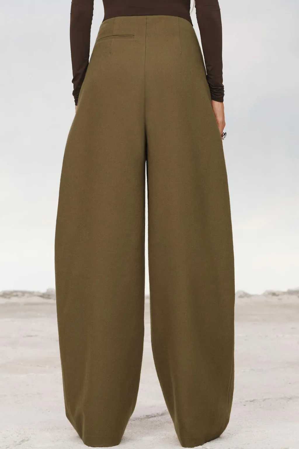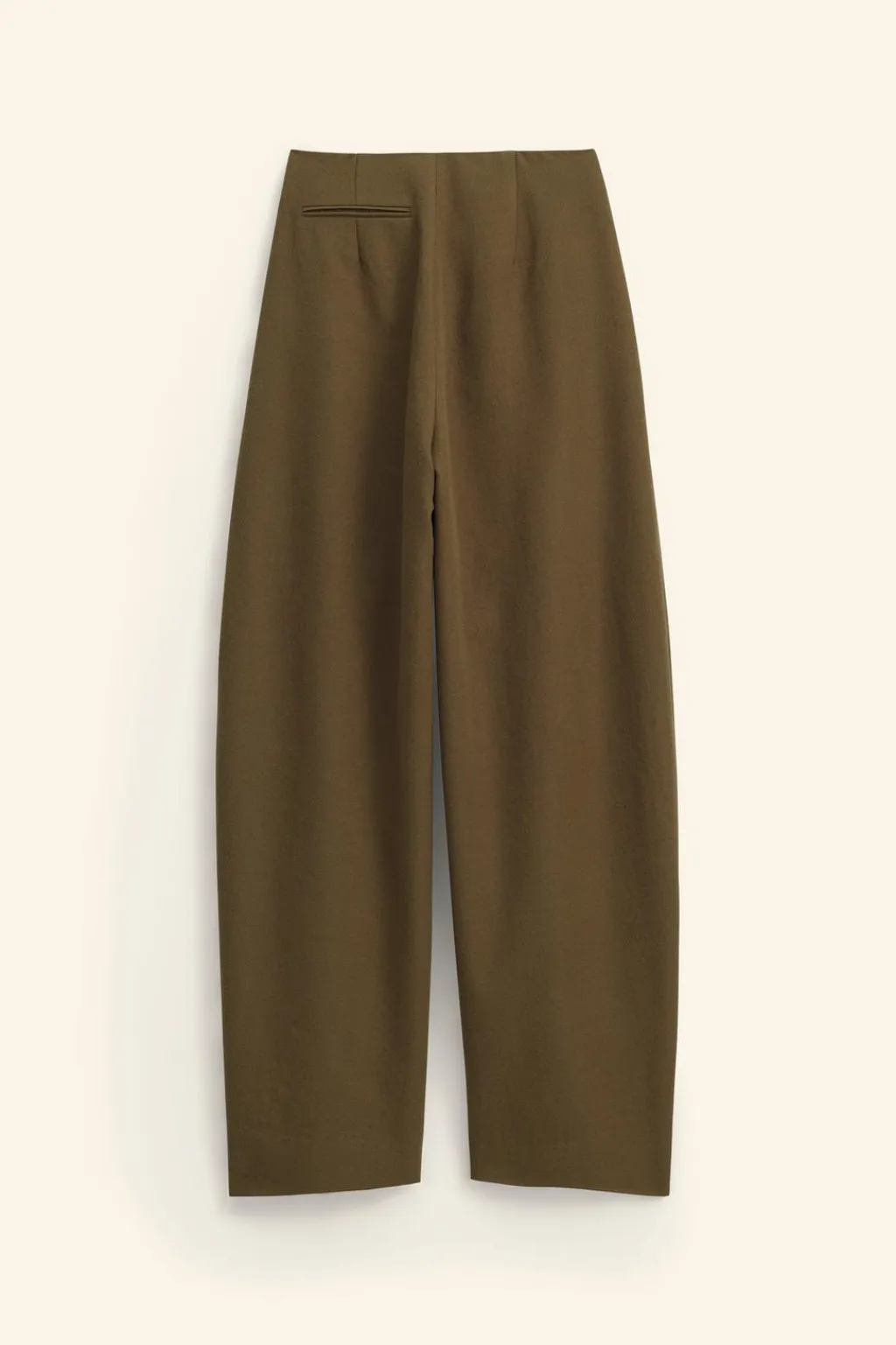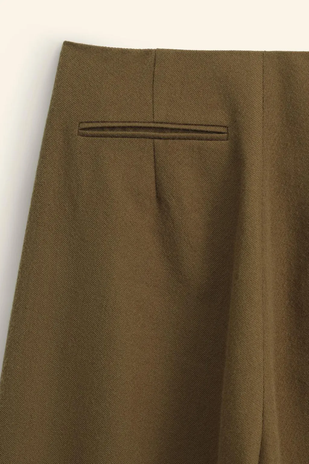 Pantalón de tiro medio confeccionado en hilatura de lana 100%. Bolsillos laterales ocultos en costura y de vivo en espalda. Cierre frontal con cremallera, botón y ganchos metálicos.