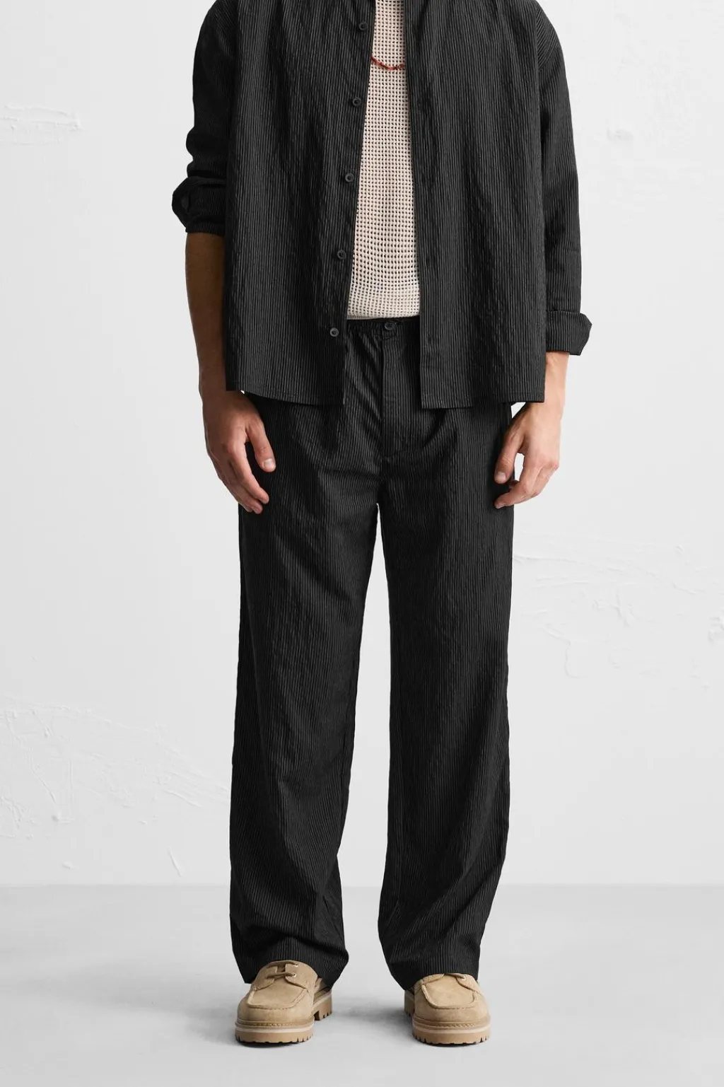 Pantalón relaxed fit confeccionada en tejido con mezcla de modal. Cintura elástica ajustable con cordón. Bolsillos laterales y detalle de bolsillos traseros.
