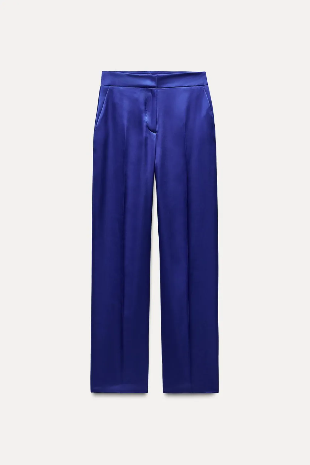 Pantalón confeccionado en tejido satinado de tiro alto. Bolsillos laterales y falso bolsillo de vivo en espalda. Cierre frontal con cremallera, botón interior y ganchos metálicos.