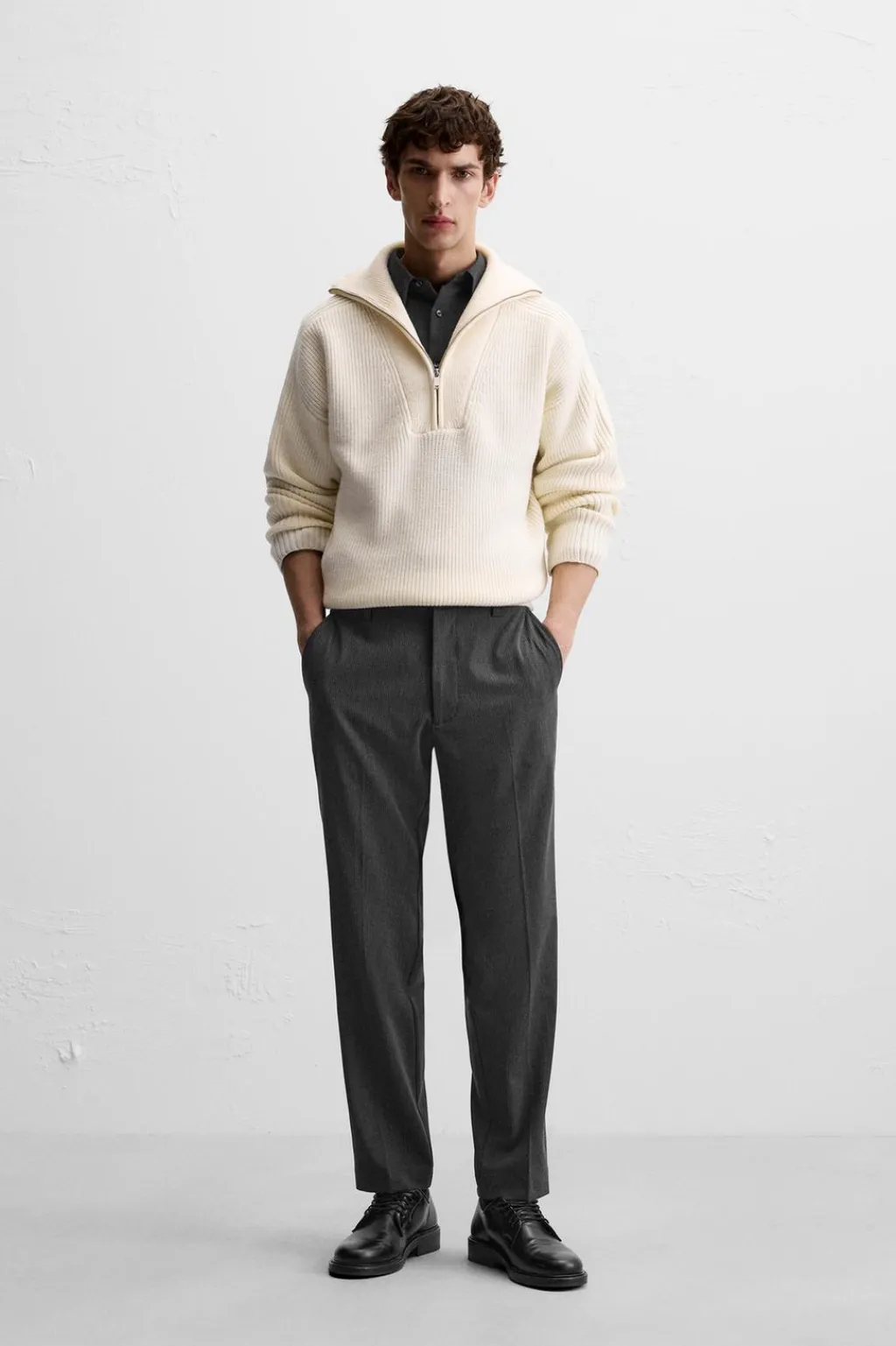 Pantalón straight fit. Bolsillos frontales y detalle de bolsillos traseros de vivo. Cierre frontal con cremallera y gancho metálico oculto.