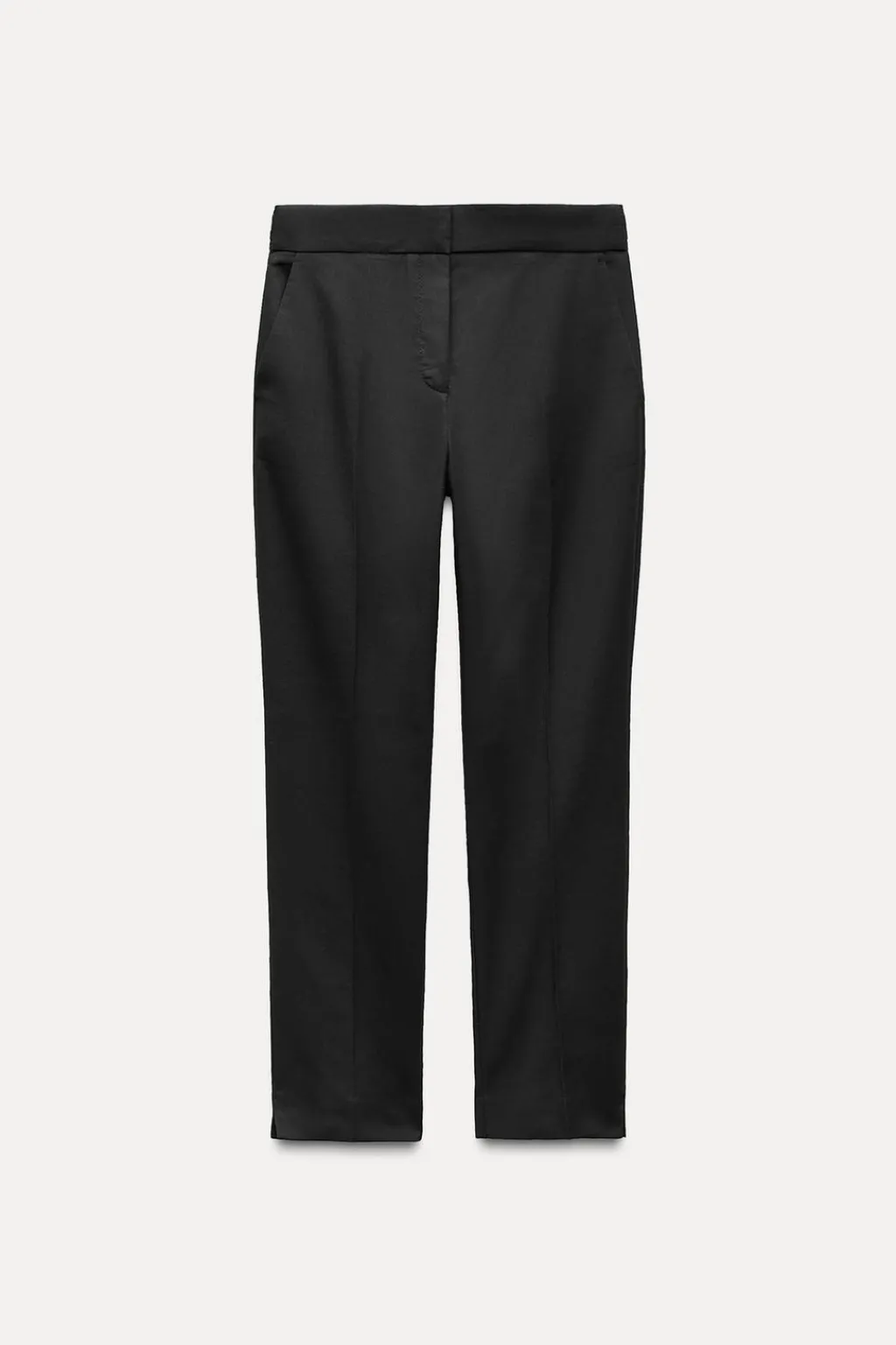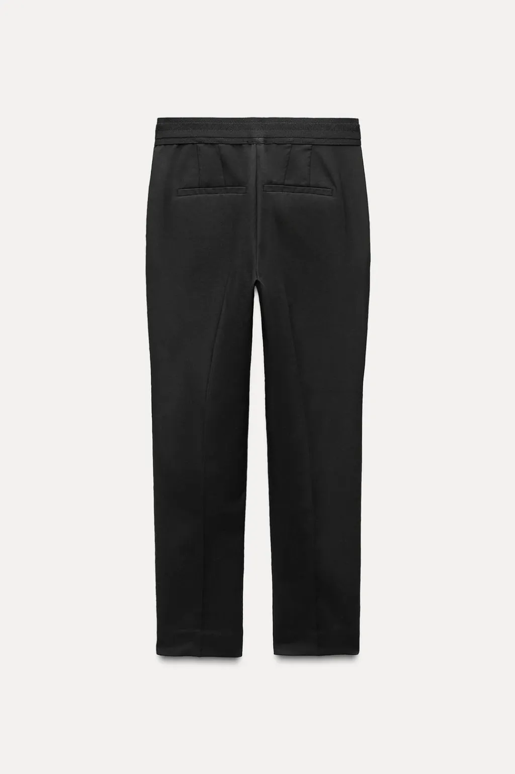 Pantalón de tiro medio con cintura elástica en espalda. Bolsillos delanteros y falsos bolsillos de vivo en espalda. Bajo acabado con aberturas laterales. Cierre frontal con cremallera, botón interior y gancho.