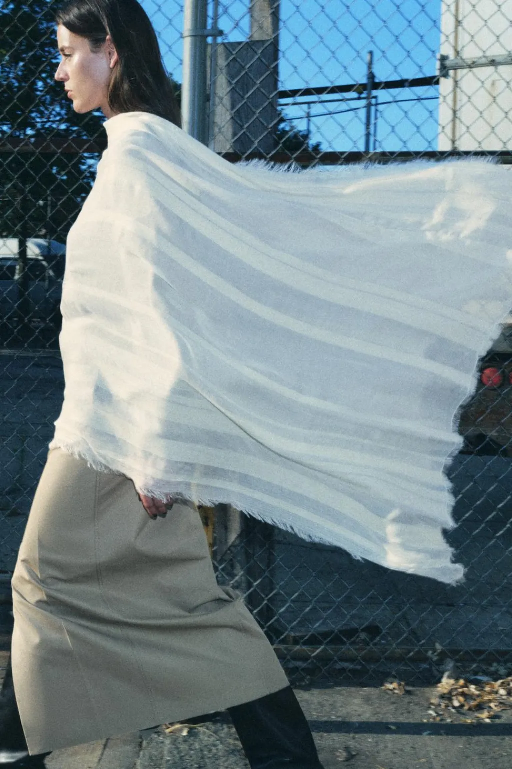 Pañuelo confeccionado en hilatura de modal y 6% lana. Detalle de bandas combinadas a tono.
