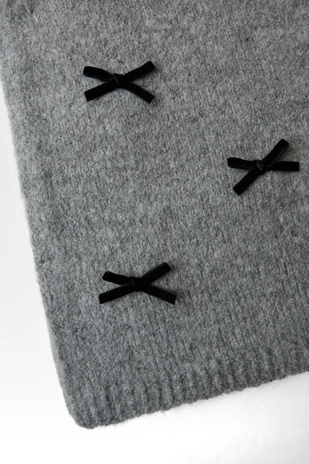 Pañuelo confeccionado con lana 8%y alpaca 8%. Detalle aplicación de lazos en terciopelo combinados a contraste.