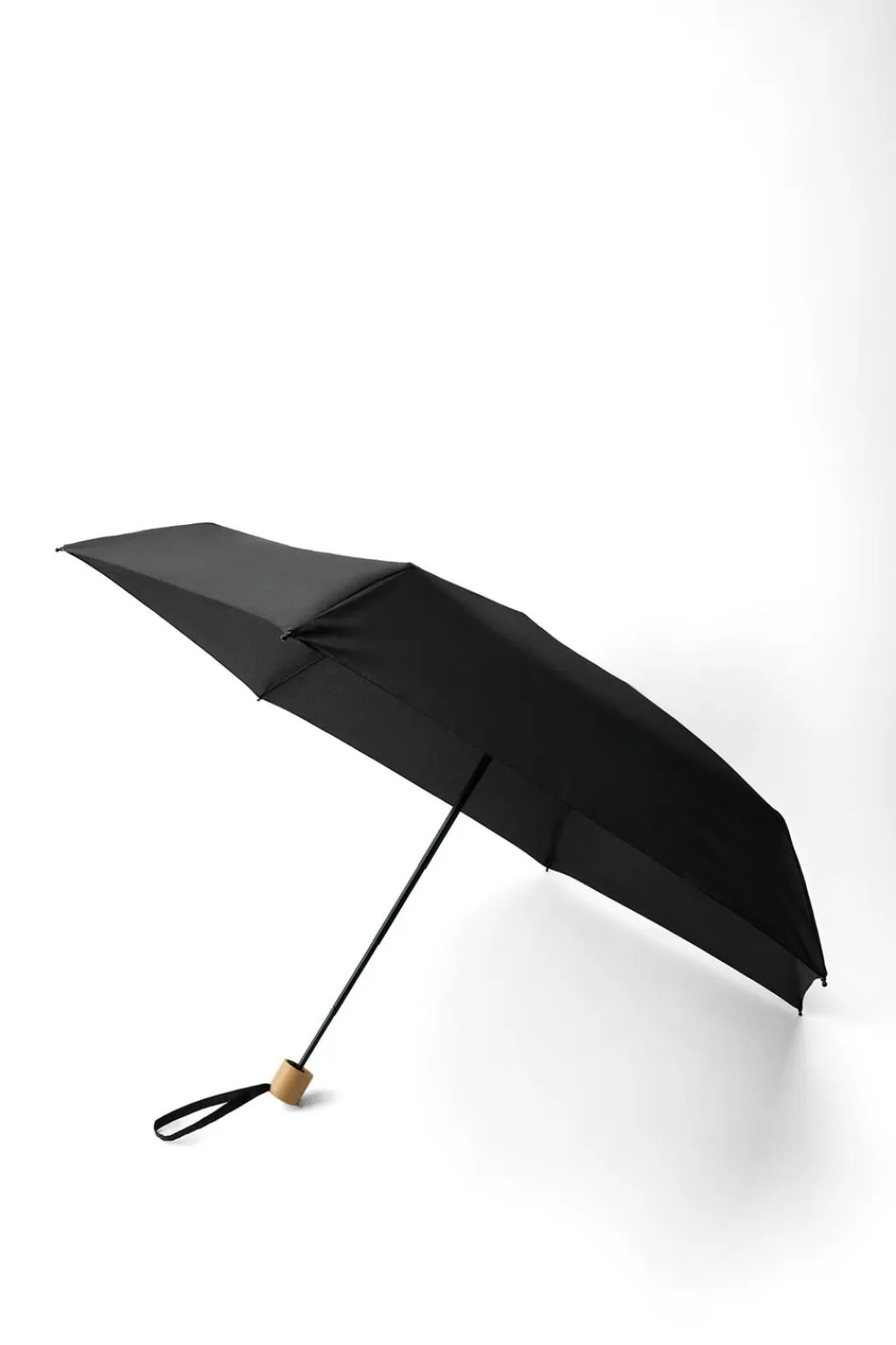 Paraguas plegable con pomo de madera y asa. Cierre con cinta y autoadhesivo. Funda combinada a tono.