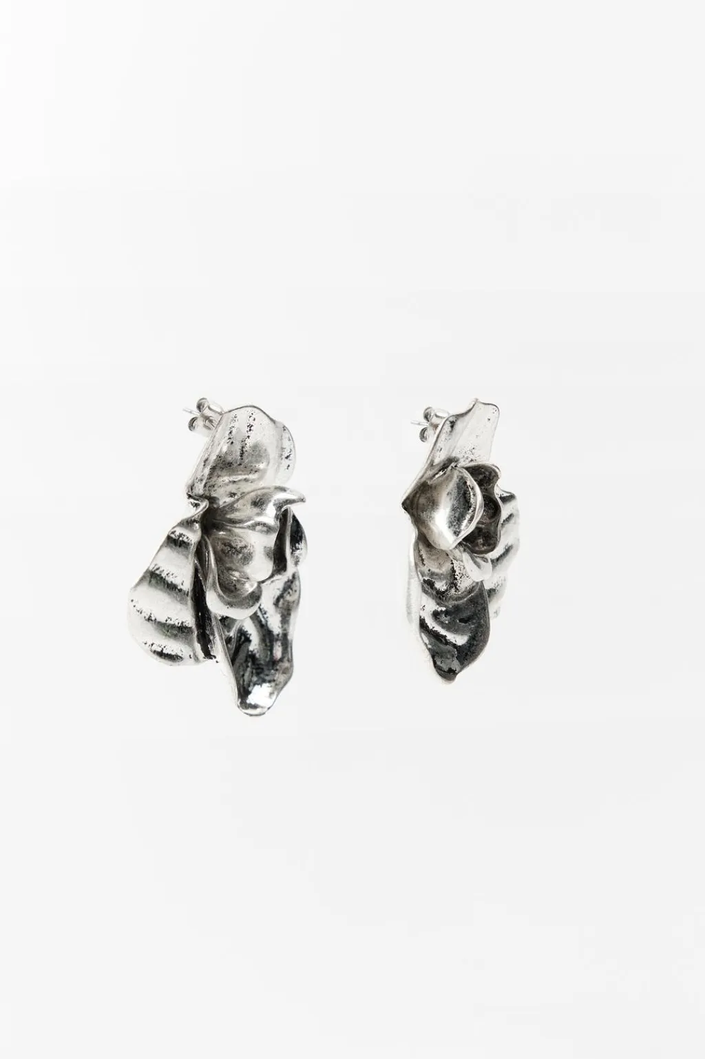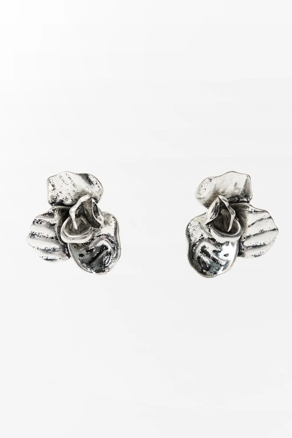 Pendientes metálicos en forma de flor labrada en relieve. Cierre con tuerca.