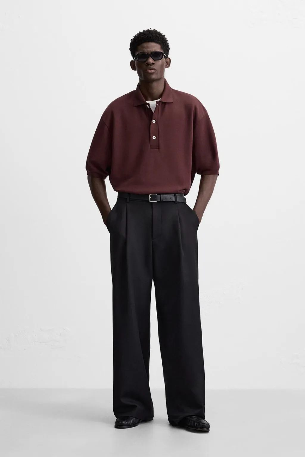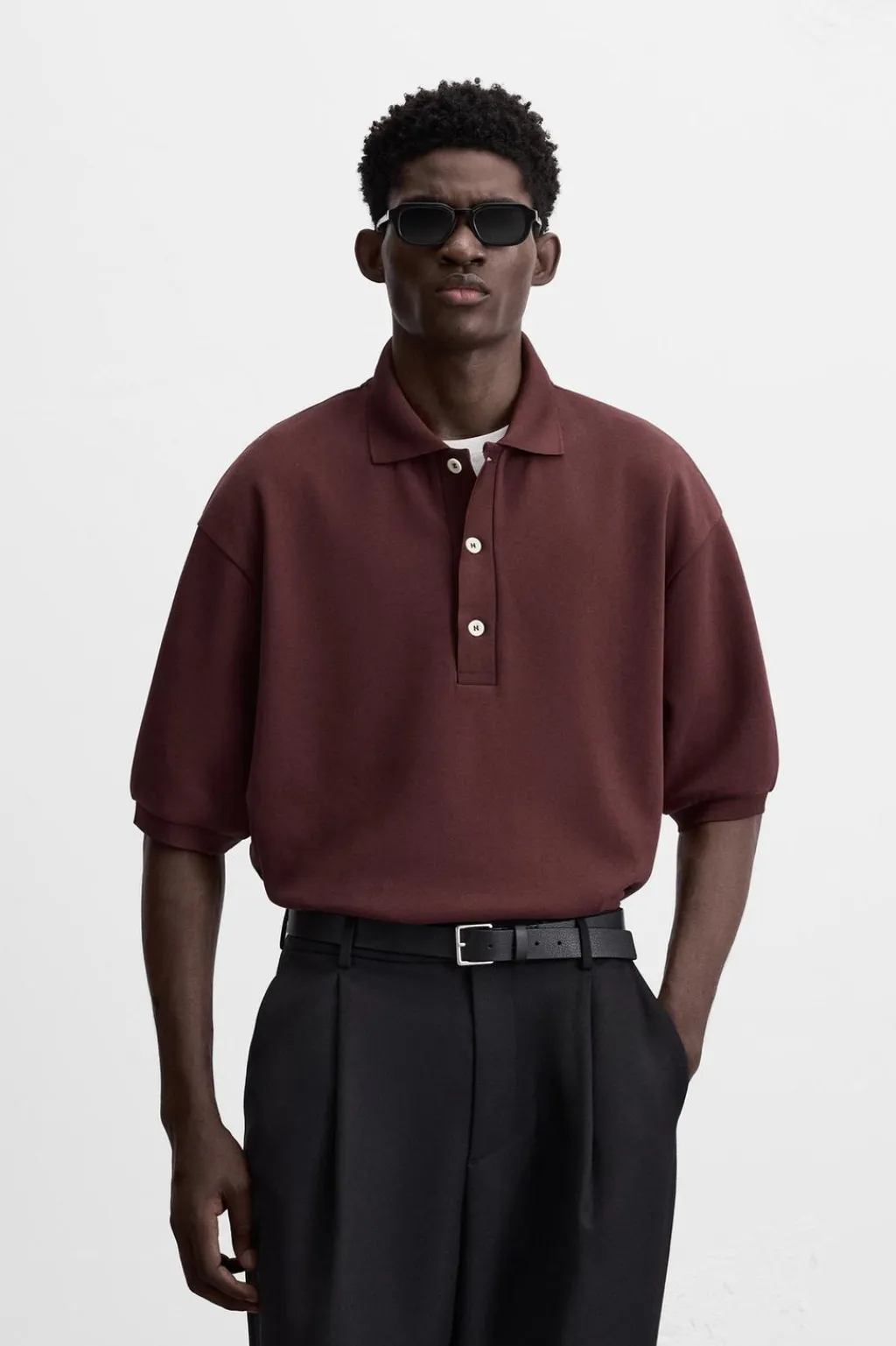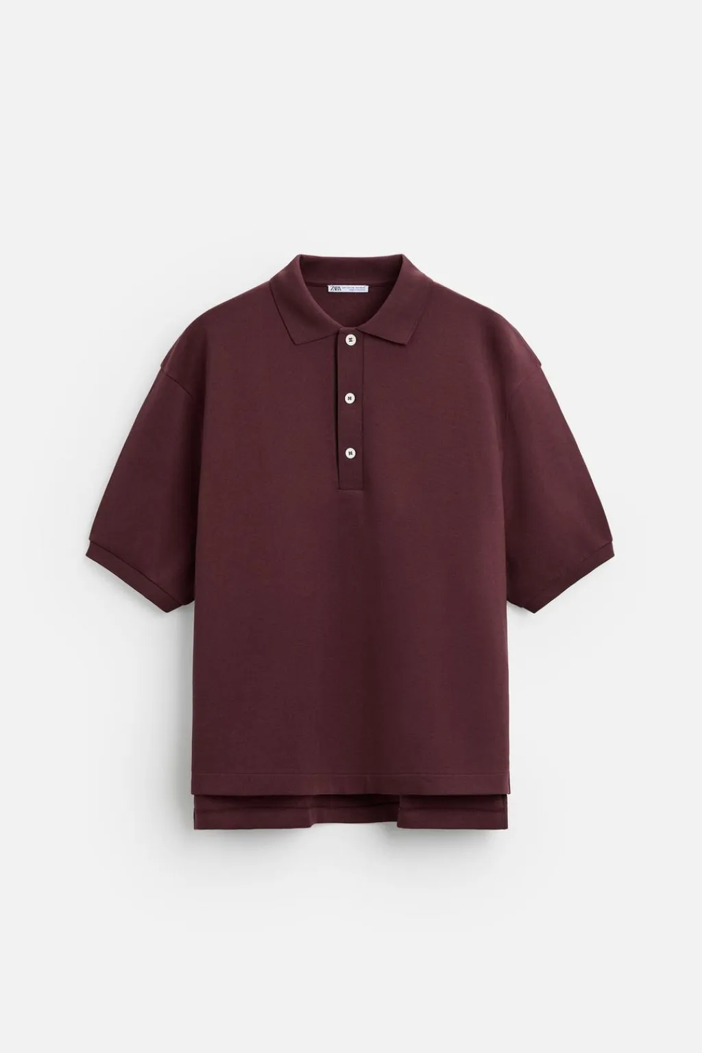 Polo relaxed fit confeccionado en tejido compacto con estructura piqué. Cuello solapa con cierre frontal de botonadura. Manga corta. Bajo asimétrico con aberturas laterales.