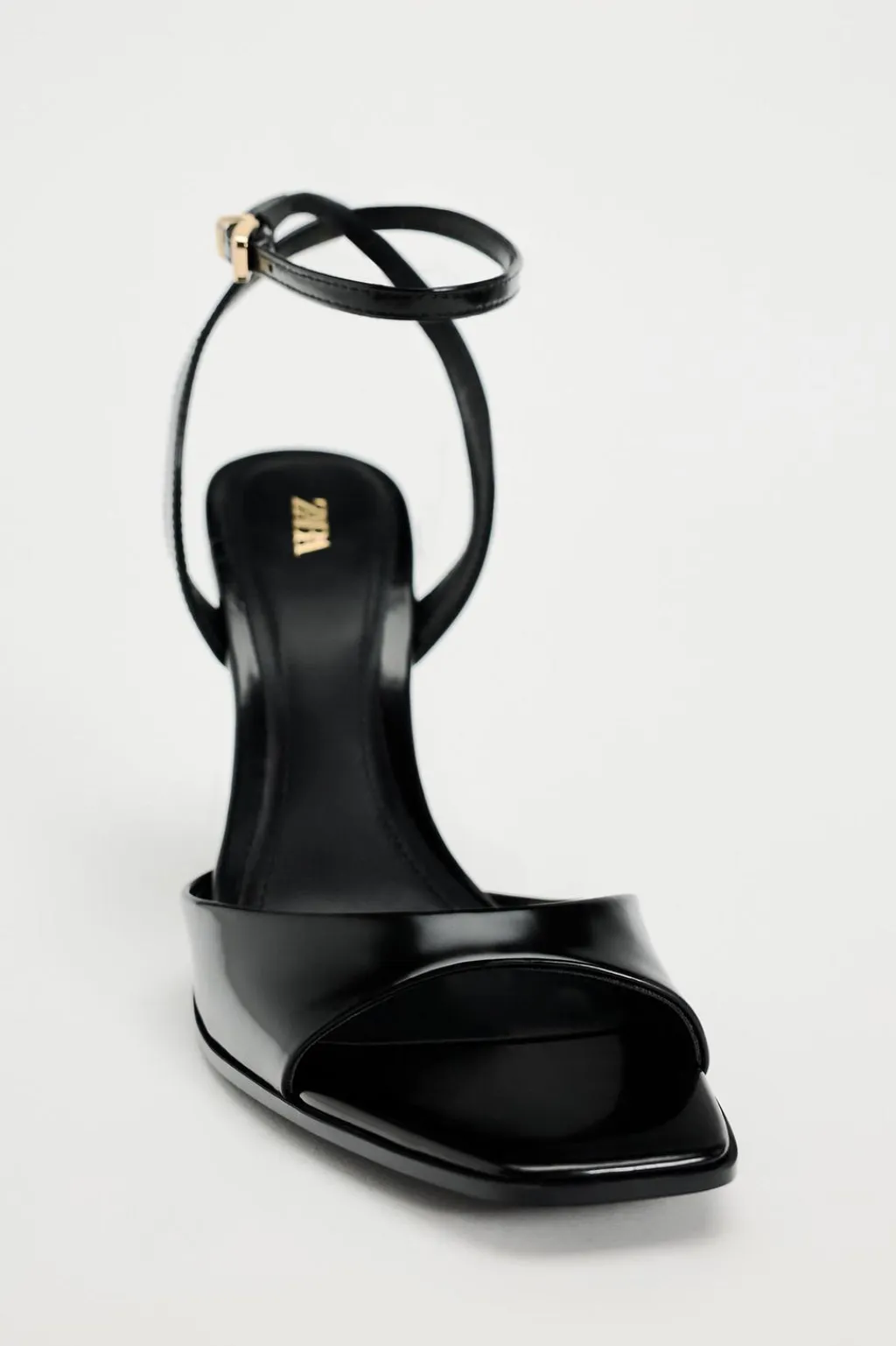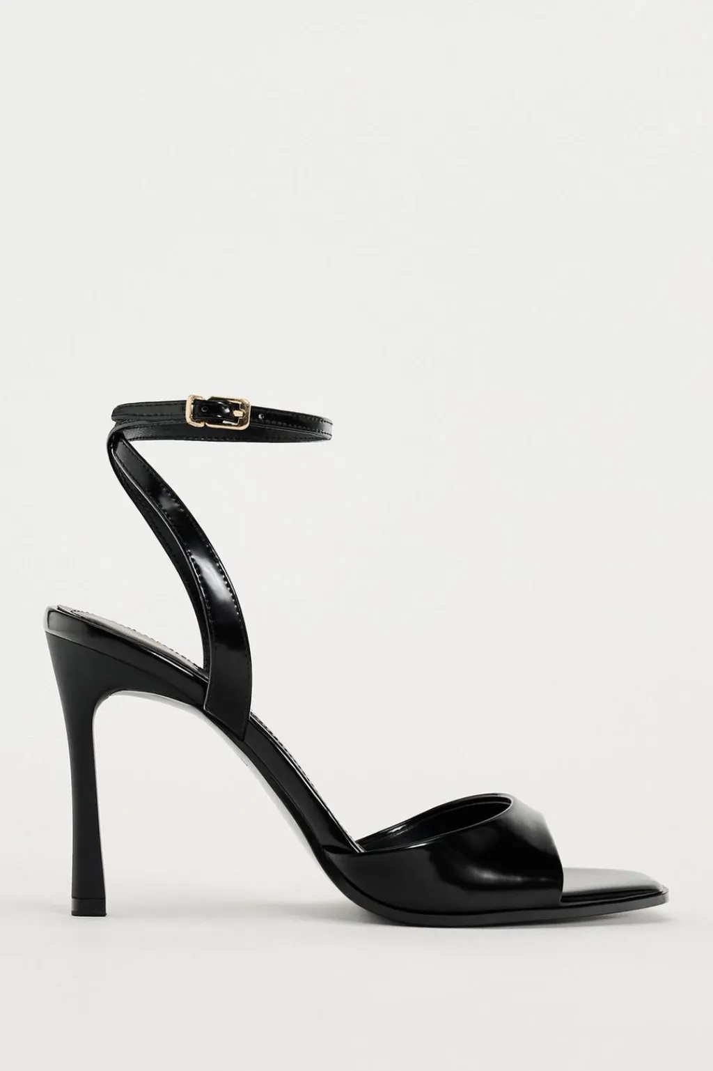 Sandalia de tacón alto con efecto acharolado. Cierre mediante hebilla en la pulsera del tobillo.