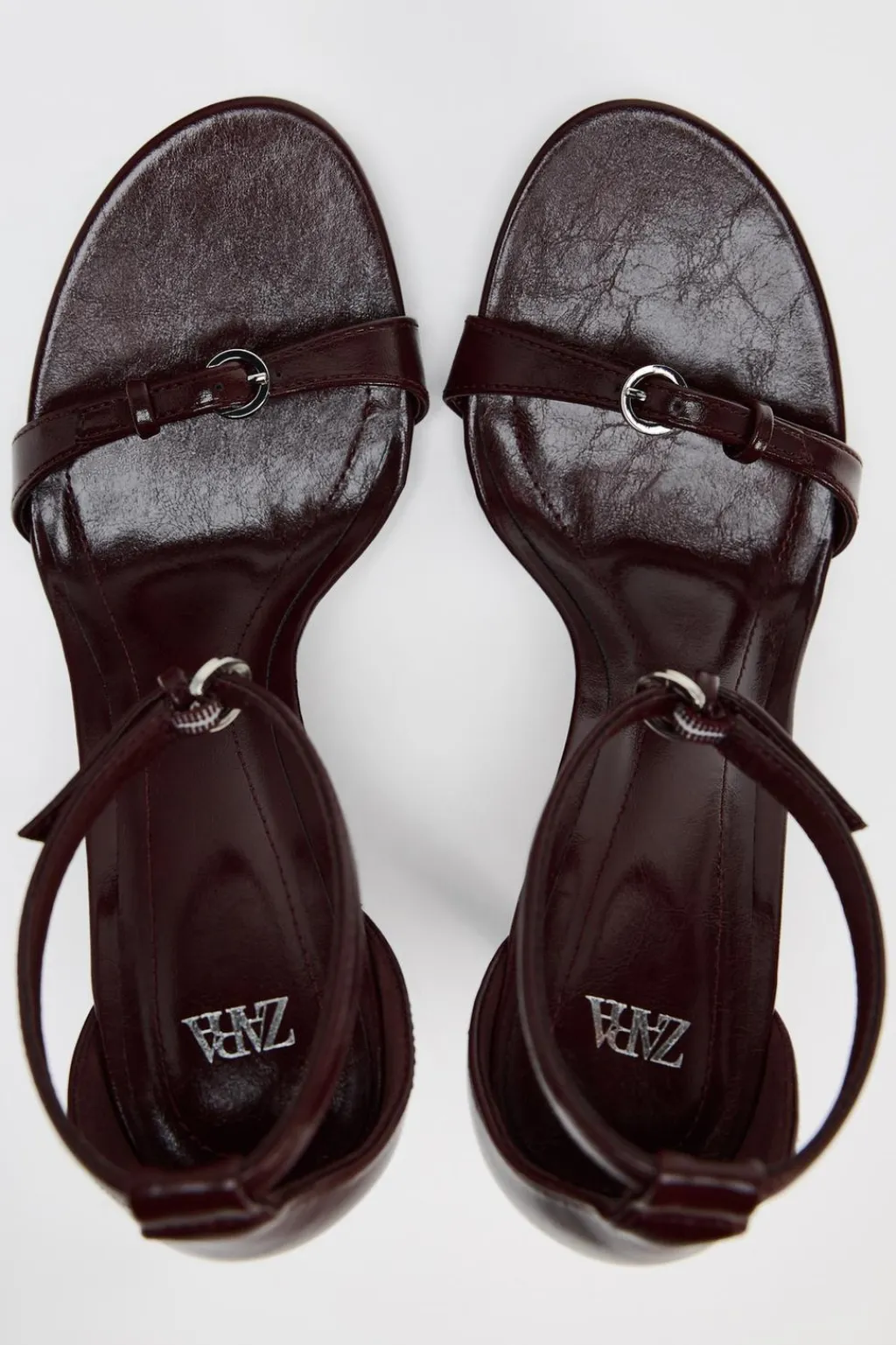 Zapato tipo sandalia de tacón. Tira con adorno de hebilla en la parte delantera. Cierre mediante hebilla en la pulsera al tobillo.