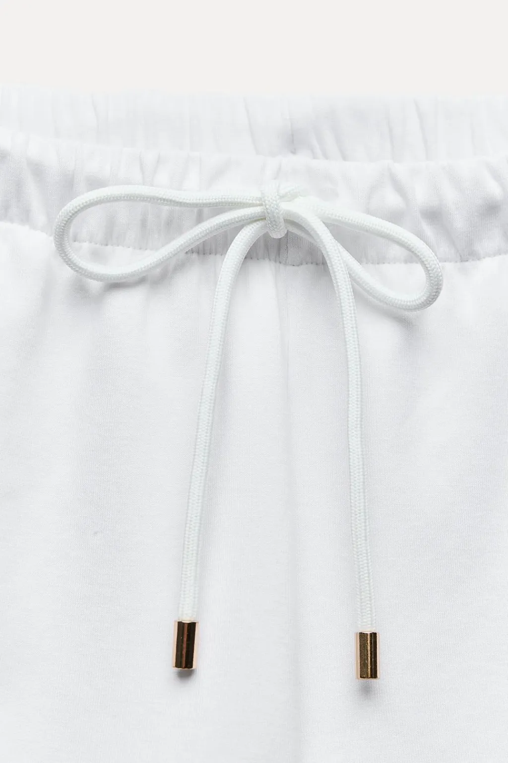 Shorts confeccionados en tejido de punto elástico y flexible con trama compacta, mullida y opaca. Tiro medio y cintura elástica ajustable con cordones. Bolsillos laterales. Detalle de aplicación metálica ZA en delantero.